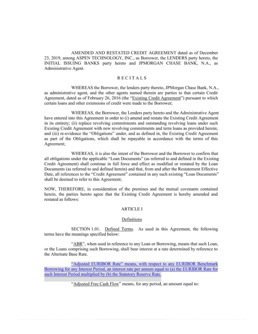AMENDED AND RESTATED CREDIT AGREEMENT dated as of December 23, 2019, among ASPEN TECHNOLOGY, INC., as Borrower, the LENDERS party hereto, the INITIAL ISSUING BANKS party hereto and JPMORGAN CHASE BANK, N.A., as Administrative Agent. R E C I T A L S WHEREAS the Borrower, the lenders party thereto, JPMorgan Chase Bank, N.A., as administrative agent, and the other agents named therein are parties to that certain Credit Agreement, dated as of February 26, 2016 (the “Existing Credit Agreement”) pursuant to which certain loans and other extensions of credit were made to the Borrower; WHEREAS, the Borrower, the Lenders party hereto and the Administrative Agent have entered into this Agreement in order to (i) amend and restate the Existing Credit Agreement in its entirety; (ii) replace revolving commitments and outstanding revolving loans under such Existing Credit Agreement with new revolving commitments and term loans as provided herein; and (iii) re-evidence the “Obligations” under, and as defined in, the Existing Credit Agreement as part of the Obligations, which shall be repayable in accordance with the terms of this Agreement; WHEREAS, it is also the intent of the Borrower and the Borrower to confirm that all obligations under the applicable “Loan Documents” (as referred to and defined in the Existing Credit Agreement) shall continue in full force and effect as modified or restated by the Loan Documents (as referred to and defined herein) and that, from and after the Restatement Effective Date, all references to the “Credit Agreement” contained in any such existing “Loan Documents” shall be deemed to refer to this Agreement; NOW, THEREFORE, in consideration of the premises and the mutual covenants contained herein, the parties hereto agree that the Existing Credit Agreement is hereby amended and restated as follows: ARTICLE I Definitions SECTION 1.01. Defined Terms. As used in this Agreement, the following terms have the meanings specified below: “ABR”, when used in reference to any Loan or Borrowing, means that such Loan, or the Loans comprising such Borrowing, shall bear interest at a rate determined by reference to the Alternate Base Rate. “Adjusted EURIBOR Rate” means, with respect to any EURIBOR Benchmark Borrowing for any Interest Period, an interest rate per annum equal to (a) the EURIBOR Rate for such Interest Period multiplied by (b) the Statutory Reserve Rate. “Adjusted Free Cash Flow” means, for any period, an amount equal to: