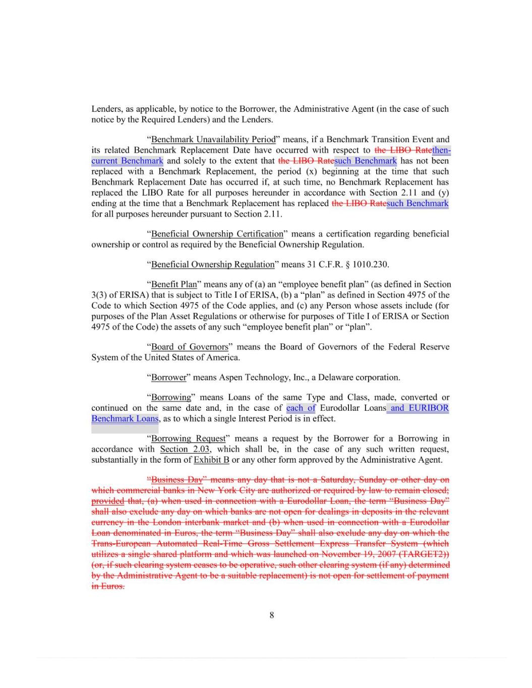 Lenders, as applicable, by notice to the Borrower, the Administrative Agent (in the case of such notice by the Required Lenders) and the Lenders. “Benchmark Unavailability Period” means, if a Benchmark Transition Event and its related Benchmark Replacement Date have occurred with respect to the LIBO Ratethen- current Benchmark and solely to the extent that the LIBO Ratesuch Benchmark has not been replaced with a Benchmark Replacement, the period (x) beginning at the time that such Benchmark Replacement Date has occurred if, at such time, no Benchmark Replacement has replaced the LIBO Rate for all purposes hereunder in accordance with Section 2.11 and (y) ending at the time that a Benchmark Replacement has replaced the LIBO Ratesuch Benchmark for all purposes hereunder pursuant to Section 2.11. “Beneficial Ownership Certification” means a certification regarding beneficial ownership or control as required by the Beneficial Ownership Regulation. “Beneficial Ownership Regulation” means 31 C.F.R. § 1010.230. “Benefit Plan” means any of (a) an “employee benefit plan” (as defined in Section 3(3) of ERISA) that is subject to Title I of ERISA, (b) a “plan” as defined in Section 4975 of the Code to which Section 4975 of the Code applies, and (c) any Person whose assets include (for purposes of the Plan Asset Regulations or otherwise for purposes of Title I of ERISA or Section 4975 of the Code) the assets of any such “employee benefit plan” or “plan”. “Board of Governors” means the Board of Governors of the Federal Reserve System of the United States of America. “Borrower” means Aspen Technology, Inc., a Delaware corporation. “Borrowing” means Loans of the same Type and Class, made, converted or continued on the same date and, in the case of each of Eurodollar Loans and EURIBOR Benchmark Loans, as to which a single Interest Period is in effect. “Borrowing Request” means a request by the Borrower for a Borrowing in accordance with Section 2.03, which shall be, in the case of any such written request, substantially in the form of Exhibit B or any other form approved by the Administrative Agent. “Business Day” means any day that is not a Saturday, Sunday or other day on which commercial banks in New York City are authorized or required by law to remain closed; provided that, (a) when used in connection with a Eurodollar Loan, the term “Business Day” shall also exclude any day on which banks are not open for dealings in deposits in the relevant currency in the London interbank market and (b) when used in connection with a Eurodollar Loan denominated in Euros, the term “Business Day” shall also exclude any day on which the Trans-European Automated Real-Time Gross Settlement Express Transfer System (which utilizes a single shared platform and which was launched on November 19, 2007 (TARGET2)) (or, if such clearing system ceases to be operative, such other clearing system (if any) determined by the Administrative Agent to be a suitable replacement) is not open for settlement of payment in Euros. 8