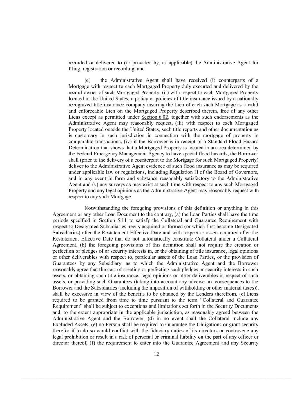recorded or delivered to (or provided by, as applicable) the Administrative Agent for filing, registration or recording; and (e) the Administrative Agent shall have received (i) counterparts of a Mortgage with respect to each Mortgaged Property duly executed and delivered by the record owner of such Mortgaged Property, (ii) with respect to each Mortgaged Property located in the United States, a policy or policies of title insurance issued by a nationally recognized title insurance company insuring the Lien of each such Mortgage as a valid and enforceable Lien on the Mortgaged Property described therein, free of any other Liens except as permitted under Section 6.02, together with such endorsements as the Administrative Agent may reasonably request, (iii) with respect to each Mortgaged Property located outside the United States, such title reports and other documentation as is customary in such jurisdiction in connection with the mortgage of property in comparable transactions, (iv) if the Borrower is in receipt of a Standard Flood Hazard Determination that shows that a Mortgaged Property is located in an area determined by the Federal Emergency Management Agency to have special flood hazards, the Borrower shall (prior to the delivery of a counterpart to the Mortgage for such Mortgaged Property) deliver to the Administrative Agent evidence of such flood insurance as may be required under applicable law or regulations, including Regulation H of the Board of Governors, and in any event in form and substance reasonably satisfactory to the Administrative Agent and (v) any surveys as may exist at such time with respect to any such Mortgaged Property and any legal opinions as the Administrative Agent may reasonably request with respect to any such Mortgage. Notwithstanding the foregoing provisions of this definition or anything in this Agreement or any other Loan Document to the contrary, (a) the Loan Parties shall have the time periods specified in Section 5.11 to satisfy the Collateral and Guarantee Requirement with respect to Designated Subsidiaries newly acquired or formed (or which first become Designated Subsidiaries) after the Restatement Effective Date and with respect to assets acquired after the Restatement Effective Date that do not automatically constitute Collateral under a Collateral Agreement, (b) the foregoing provisions of this definition shall not require the creation or perfection of pledges of or security interests in, or the obtaining of title insurance, legal opinions or other deliverables with respect to, particular assets of the Loan Parties, or the provision of Guarantees by any Subsidiary, as to which the Administrative Agent and the Borrower reasonably agree that the cost of creating or perfecting such pledges or security interests in such assets, or obtaining such title insurance, legal opinions or other deliverables in respect of such assets, or providing such Guarantees (taking into account any adverse tax consequences to the Borrower and the Subsidiaries (including the imposition of withholding or other material taxes)), shall be excessive in view of the benefits to be obtained by the Lenders therefrom, (c) Liens required to be granted from time to time pursuant to the term “Collateral and Guarantee Requirement” shall be subject to exceptions and limitations set forth in the Security Documents and, to the extent appropriate in the applicable jurisdiction, as reasonably agreed between the Administrative Agent and the Borrower, (d) in no event shall the Collateral include any Excluded Assets, (e) no Person shall be required to Guarantee the Obligations or grant security therefor if to do so would conflict with the fiduciary duties of its directors or contravene any legal prohibition or result in a risk of personal or criminal liability on the part of any officer or director thereof, (f) the requirement to enter into the Guarantee Agreement and any Security 12