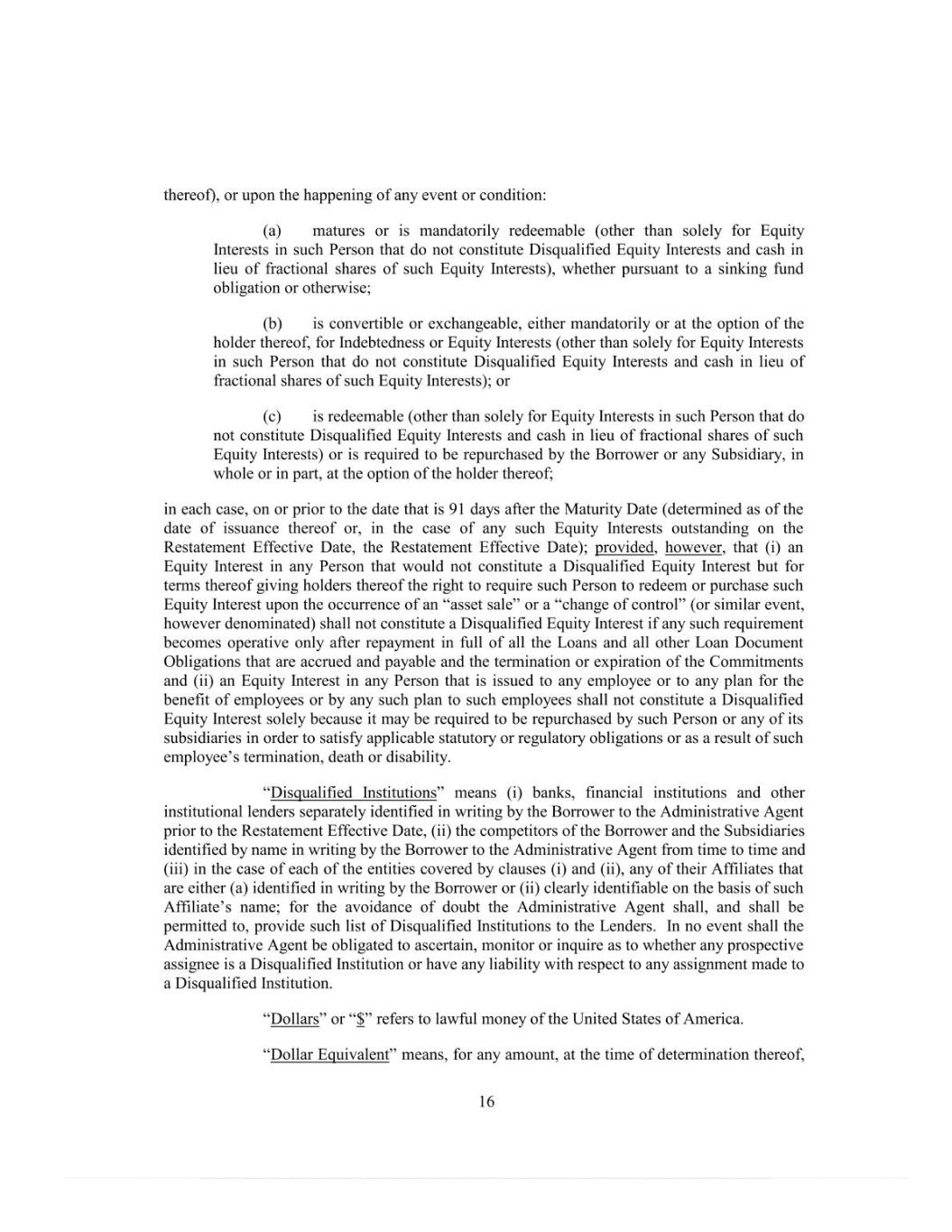 thereof), or upon the happening of any event or condition: (a) matures or is mandatorily redeemable (other than solely for Equity Interests in such Person that do not constitute Disqualified Equity Interests and cash in lieu of fractional shares of such Equity Interests), whether pursuant to a sinking fund obligation or otherwise; (b) is convertible or exchangeable, either mandatorily or at the option of the holder thereof, for Indebtedness or Equity Interests (other than solely for Equity Interests in such Person that do not constitute Disqualified Equity Interests and cash in lieu of fractional shares of such Equity Interests); or (c) is redeemable (other than solely for Equity Interests in such Person that do not constitute Disqualified Equity Interests and cash in lieu of fractional shares of such Equity Interests) or is required to be repurchased by the Borrower or any Subsidiary, in whole or in part, at the option of the holder thereof; in each case, on or prior to the date that is 91 days after the Maturity Date (determined as of the date of issuance thereof or, in the case of any such Equity Interests outstanding on the Restatement Effective Date, the Restatement Effective Date); provided, however, that (i) an Equity Interest in any Person that would not constitute a Disqualified Equity Interest but for terms thereof giving holders thereof the right to require such Person to redeem or purchase such Equity Interest upon the occurrence of an “asset sale” or a “change of control” (or similar event, however denominated) shall not constitute a Disqualified Equity Interest if any such requirement becomes operative only after repayment in full of all the Loans and all other Loan Document Obligations that are accrued and payable and the termination or expiration of the Commitments and (ii) an Equity Interest in any Person that is issued to any employee or to any plan for the benefit of employees or by any such plan to such employees shall not constitute a Disqualified Equity Interest solely because it may be required to be repurchased by such Person or any of its subsidiaries in order to satisfy applicable statutory or regulatory obligations or as a result of such employee’s termination, death or disability. “Disqualified Institutions” means (i) banks, financial institutions and other institutional lenders separately identified in writing by the Borrower to the Administrative Agent prior to the Restatement Effective Date, (ii) the competitors of the Borrower and the Subsidiaries identified by name in writing by the Borrower to the Administrative Agent from time to time and (iii) in the case of each of the entities covered by clauses (i) and (ii), any of their Affiliates that are either (a) identified in writing by the Borrower or (ii) clearly identifiable on the basis of such Affiliate’s name; for the avoidance of doubt the Administrative Agent shall, and shall be permitted to, provide such list of Disqualified Institutions to the Lenders. In no event shall the Administrative Agent be obligated to ascertain, monitor or inquire as to whether any prospective assignee is a Disqualified Institution or have any liability with respect to any assignment made to a Disqualified Institution. “Dollars” or “$” refers to lawful money of the United States of America. “Dollar Equivalent” means, for any amount, at the time of determination thereof, 16