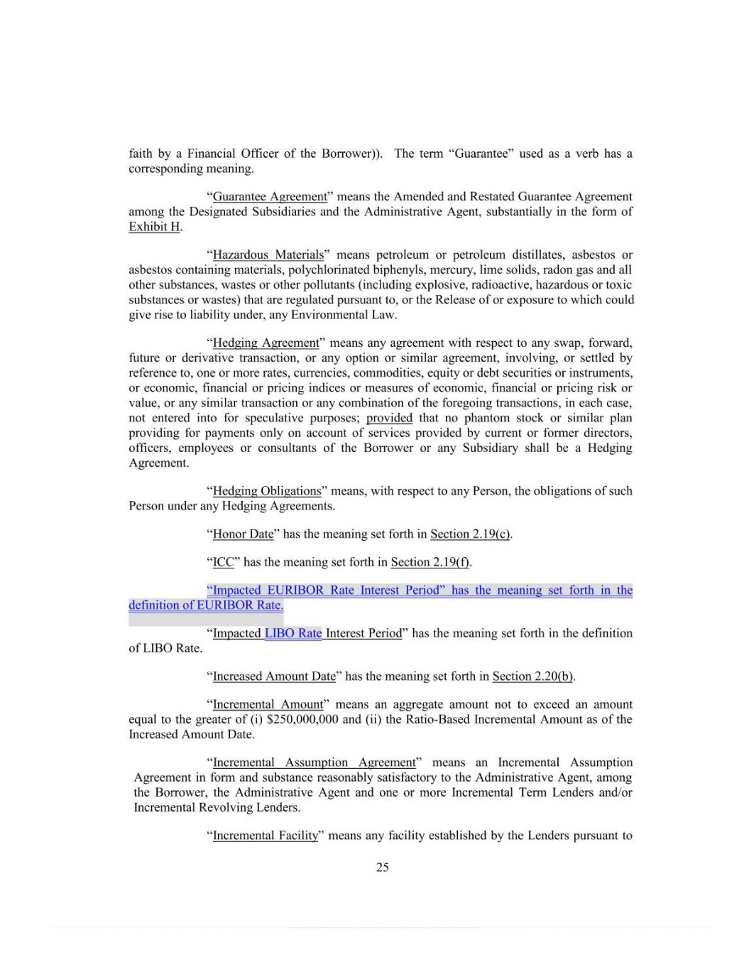 faith by a Financial Officer of the Borrower)). The term “Guarantee” used as a verb has a corresponding meaning. “Guarantee Agreement” means the Amended and Restated Guarantee Agreement among the Designated Subsidiaries and the Administrative Agent, substantially in the form of Exhibit H. “Hazardous Materials” means petroleum or petroleum distillates, asbestos or asbestos containing materials, polychlorinated biphenyls, mercury, lime solids, radon gas and all other substances, wastes or other pollutants (including explosive, radioactive, hazardous or toxic substances or wastes) that are regulated pursuant to, or the Release of or exposure to which could give rise to liability under, any Environmental Law. “Hedging Agreement” means any agreement with respect to any swap, forward, future or derivative transaction, or any option or similar agreement, involving, or settled by reference to, one or more rates, currencies, commodities, equity or debt securities or instruments, or economic, financial or pricing indices or measures of economic, financial or pricing risk or value, or any similar transaction or any combination of the foregoing transactions, in each case, not entered into for speculative purposes; provided that no phantom stock or similar plan providing for payments only on account of services provided by current or former directors, officers, employees or consultants of the Borrower or any Subsidiary shall be a Hedging Agreement. “Hedging Obligations” means, with respect to any Person, the obligations of such Person under any Hedging Agreements. “Honor Date” has the meaning set forth in Section 2.19(c). “ICC” has the meaning set forth in Section 2.19(f). “Impacted EURIBOR Rate Interest Period” has the meaning set forth in the definition of EURIBOR Rate. “Impacted LIBO Rate Interest Period” has the meaning set forth in the definition of LIBO Rate. “Increased Amount Date” has the meaning set forth in Section 2.20(b). “Incremental Amount” means an aggregate amount not to exceed an amount equal to the greater of (i) $250,000,000 and (ii) the Ratio-Based Incremental Amount as of the Increased Amount Date. “Incremental Assumption Agreement” means an Incremental Assumption Agreement in form and substance reasonably satisfactory to the Administrative Agent, among the Borrower, the Administrative Agent and one or more Incremental Term Lenders and/or Incremental Revolving Lenders. “Incremental Facility” means any facility established by the Lenders pursuant to 25