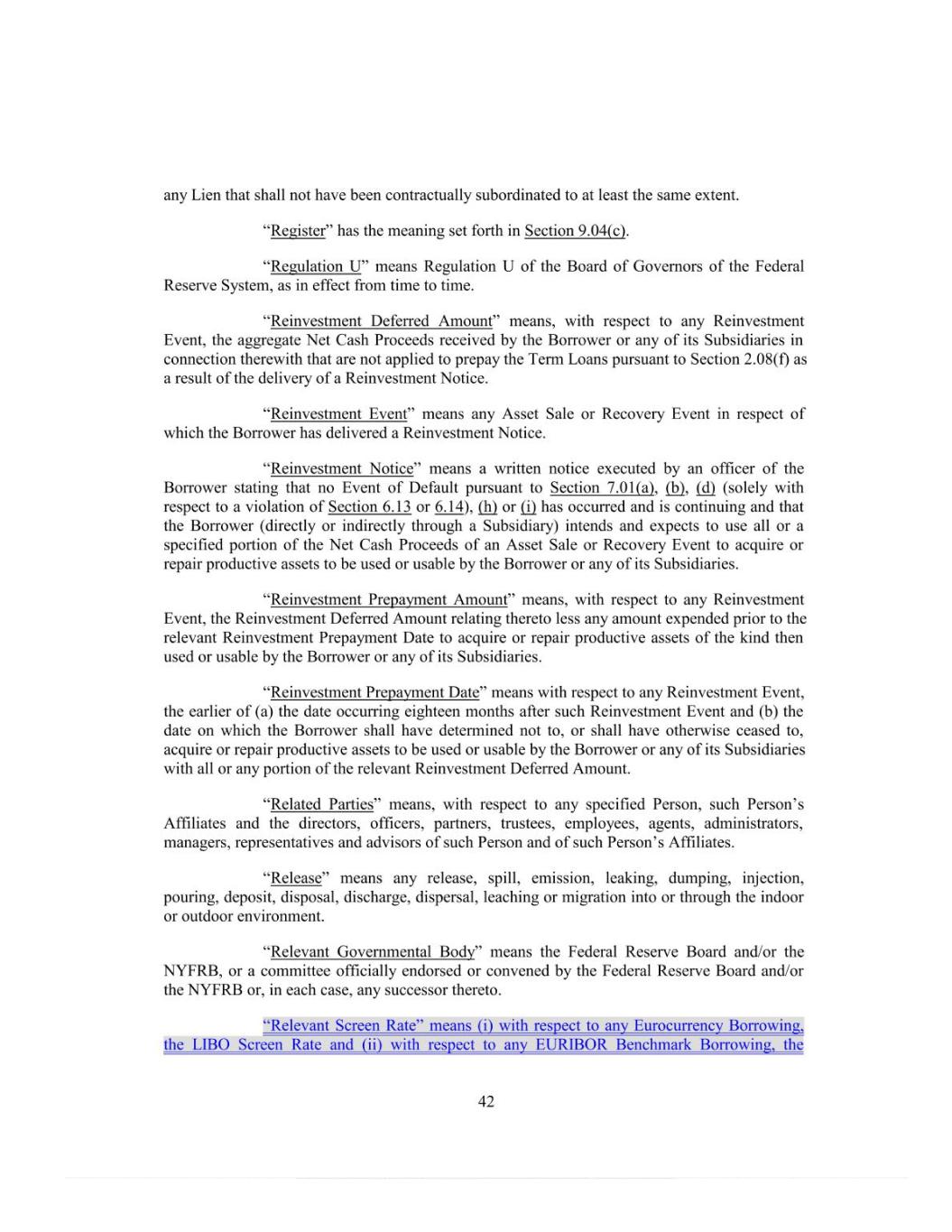 any Lien that shall not have been contractually subordinated to at least the same extent. “Register” has the meaning set forth in Section 9.04(c). “Regulation U” means Regulation U of the Board of Governors of the Federal Reserve System, as in effect from time to time. “Reinvestment Deferred Amount” means, with respect to any Reinvestment Event, the aggregate Net Cash Proceeds received by the Borrower or any of its Subsidiaries in connection therewith that are not applied to prepay the Term Loans pursuant to Section 2.08(f) as a result of the delivery of a Reinvestment Notice. “Reinvestment Event” means any Asset Sale or Recovery Event in respect of which the Borrower has delivered a Reinvestment Notice. “Reinvestment Notice” means a written notice executed by an officer of the Borrower stating that no Event of Default pursuant to Section 7.01(a), (b), (d) (solely with respect to a violation of Section 6.13 or 6.14), (h) or (i) has occurred and is continuing and that the Borrower (directly or indirectly through a Subsidiary) intends and expects to use all or a specified portion of the Net Cash Proceeds of an Asset Sale or Recovery Event to acquire or repair productive assets to be used or usable by the Borrower or any of its Subsidiaries. “Reinvestment Prepayment Amount” means, with respect to any Reinvestment Event, the Reinvestment Deferred Amount relating thereto less any amount expended prior to the relevant Reinvestment Prepayment Date to acquire or repair productive assets of the kind then used or usable by the Borrower or any of its Subsidiaries. “Reinvestment Prepayment Date” means with respect to any Reinvestment Event, the earlier of (a) the date occurring eighteen months after such Reinvestment Event and (b) the date on which the Borrower shall have determined not to, or shall have otherwise ceased to, acquire or repair productive assets to be used or usable by the Borrower or any of its Subsidiaries with all or any portion of the relevant Reinvestment Deferred Amount. “Related Parties” means, with respect to any specified Person, such Person’s Affiliates and the directors, officers, partners, trustees, employees, agents, administrators, managers, representatives and advisors of such Person and of such Person’s Affiliates. “Release” means any release, spill, emission, leaking, dumping, injection, pouring, deposit, disposal, discharge, dispersal, leaching or migration into or through the indoor or outdoor environment. “Relevant Governmental Body” means the Federal Reserve Board and/or the NYFRB, or a committee officially endorsed or convened by the Federal Reserve Board and/or the NYFRB or, in each case, any successor thereto. “Relevant Screen Rate” means (i) with respect to any Eurocurrency Borrowing, the LIBO Screen Rate and (ii) with respect to any EURIBOR Benchmark Borrowing, the 42