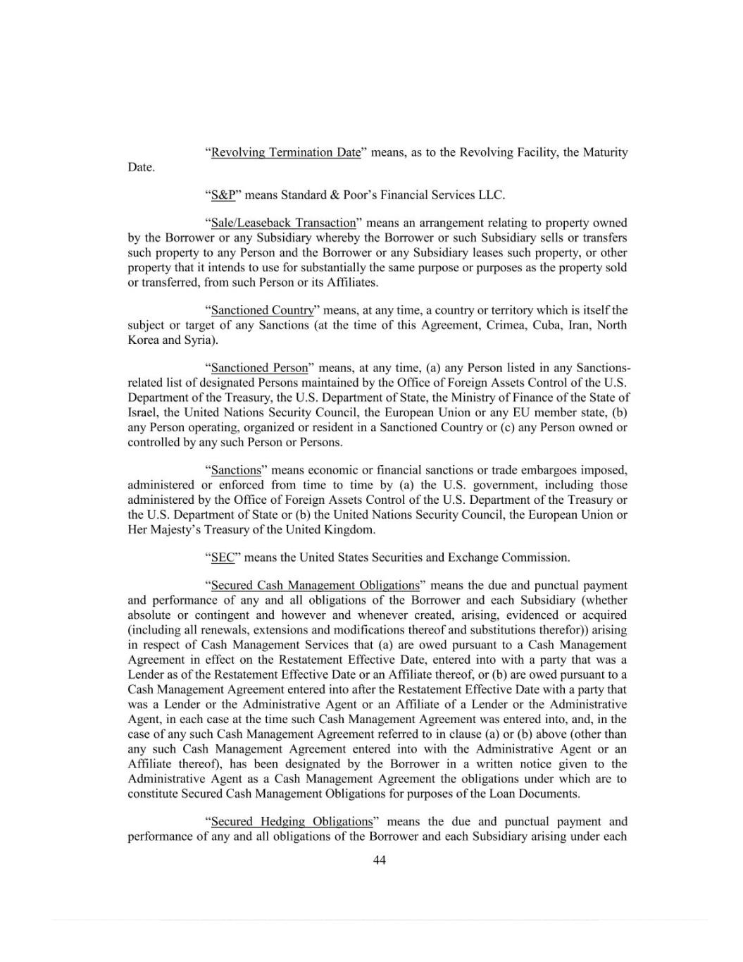 “Revolving Termination Date” means, as to the Revolving Facility, the Maturity Date. “S&P” means Standard & Poor’s Financial Services LLC. “Sale/Leaseback Transaction” means an arrangement relating to property owned by the Borrower or any Subsidiary whereby the Borrower or such Subsidiary sells or transfers such property to any Person and the Borrower or any Subsidiary leases such property, or other property that it intends to use for substantially the same purpose or purposes as the property sold or transferred, from such Person or its Affiliates. “Sanctioned Country” means, at any time, a country or territory which is itself the subject or target of any Sanctions (at the time of this Agreement, Crimea, Cuba, Iran, North Korea and Syria). “Sanctioned Person” means, at any time, (a) any Person listed in any Sanctions- related list of designated Persons maintained by the Office of Foreign Assets Control of the U.S. Department of the Treasury, the U.S. Department of State, the Ministry of Finance of the State of Israel, the United Nations Security Council, the European Union or any EU member state, (b) any Person operating, organized or resident in a Sanctioned Country or (c) any Person owned or controlled by any such Person or Persons. “Sanctions” means economic or financial sanctions or trade embargoes imposed, administered or enforced from time to time by (a) the U.S. government, including those administered by the Office of Foreign Assets Control of the U.S. Department of the Treasury or the U.S. Department of State or (b) the United Nations Security Council, the European Union or Her Majesty’s Treasury of the United Kingdom. “SEC” means the United States Securities and Exchange Commission. “Secured Cash Management Obligations” means the due and punctual payment and performance of any and all obligations of the Borrower and each Subsidiary (whether absolute or contingent and however and whenever created, arising, evidenced or acquired (including all renewals, extensions and modifications thereof and substitutions therefor)) arising in respect of Cash Management Services that (a) are owed pursuant to a Cash Management Agreement in effect on the Restatement Effective Date, entered into with a party that was a Lender as of the Restatement Effective Date or an Affiliate thereof, or (b) are owed pursuant to a Cash Management Agreement entered into after the Restatement Effective Date with a party that was a Lender or the Administrative Agent or an Affiliate of a Lender or the Administrative Agent, in each case at the time such Cash Management Agreement was entered into, and, in the case of any such Cash Management Agreement referred to in clause (a) or (b) above (other than any such Cash Management Agreement entered into with the Administrative Agent or an Affiliate thereof), has been designated by the Borrower in a written notice given to the Administrative Agent as a Cash Management Agreement the obligations under which are to constitute Secured Cash Management Obligations for purposes of the Loan Documents. “Secured Hedging Obligations” means the due and punctual payment and performance of any and all obligations of the Borrower and each Subsidiary arising under each 44