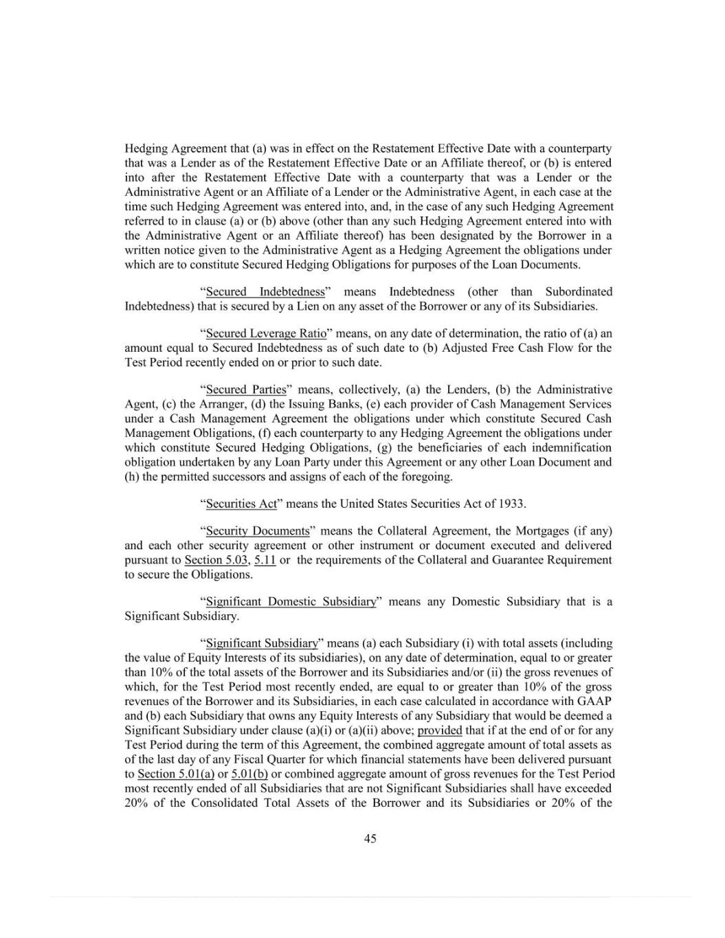 Hedging Agreement that (a) was in effect on the Restatement Effective Date with a counterparty that was a Lender as of the Restatement Effective Date or an Affiliate thereof, or (b) is entered into after the Restatement Effective Date with a counterparty that was a Lender or the Administrative Agent or an Affiliate of a Lender or the Administrative Agent, in each case at the time such Hedging Agreement was entered into, and, in the case of any such Hedging Agreement referred to in clause (a) or (b) above (other than any such Hedging Agreement entered into with the Administrative Agent or an Affiliate thereof) has been designated by the Borrower in a written notice given to the Administrative Agent as a Hedging Agreement the obligations under which are to constitute Secured Hedging Obligations for purposes of the Loan Documents. “Secured Indebtedness” means Indebtedness (other than Subordinated Indebtedness) that is secured by a Lien on any asset of the Borrower or any of its Subsidiaries. “Secured Leverage Ratio” means, on any date of determination, the ratio of (a) an amount equal to Secured Indebtedness as of such date to (b) Adjusted Free Cash Flow for the Test Period recently ended on or prior to such date. “Secured Parties” means, collectively, (a) the Lenders, (b) the Administrative Agent, (c) the Arranger, (d) the Issuing Banks, (e) each provider of Cash Management Services under a Cash Management Agreement the obligations under which constitute Secured Cash Management Obligations, (f) each counterparty to any Hedging Agreement the obligations under which constitute Secured Hedging Obligations, (g) the beneficiaries of each indemnification obligation undertaken by any Loan Party under this Agreement or any other Loan Document and (h) the permitted successors and assigns of each of the foregoing. “Securities Act” means the United States Securities Act of 1933. “Security Documents” means the Collateral Agreement, the Mortgages (if any) and each other security agreement or other instrument or document executed and delivered pursuant to Section 5.03, 5.11 or the requirements of the Collateral and Guarantee Requirement to secure the Obligations. “Significant Domestic Subsidiary” means any Domestic Subsidiary that is a Significant Subsidiary. “Significant Subsidiary” means (a) each Subsidiary (i) with total assets (including the value of Equity Interests of its subsidiaries), on any date of determination, equal to or greater than 10% of the total assets of the Borrower and its Subsidiaries and/or (ii) the gross revenues of which, for the Test Period most recently ended, are equal to or greater than 10% of the gross revenues of the Borrower and its Subsidiaries, in each case calculated in accordance with GAAP and (b) each Subsidiary that owns any Equity Interests of any Subsidiary that would be deemed a Significant Subsidiary under clause (a)(i) or (a)(ii) above; provided that if at the end of or for any Test Period during the term of this Agreement, the combined aggregate amount of total assets as of the last day of any Fiscal Quarter for which financial statements have been delivered pursuant to Section 5.01(a) or 5.01(b) or combined aggregate amount of gross revenues for the Test Period most recently ended of all Subsidiaries that are not Significant Subsidiaries shall have exceeded 20% of the Consolidated Total Assets of the Borrower and its Subsidiaries or 20% of the 45