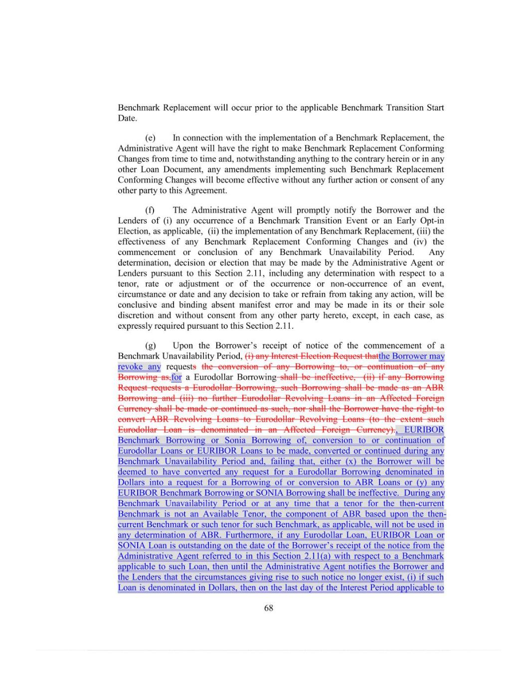 Benchmark Replacement will occur prior to the applicable Benchmark Transition Start Date. (e) In connection with the implementation of a Benchmark Replacement, the Administrative Agent will have the right to make Benchmark Replacement Conforming Changes from time to time and, notwithstanding anything to the contrary herein or in any other Loan Document, any amendments implementing such Benchmark Replacement Conforming Changes will become effective without any further action or consent of any other party to this Agreement. (f) The Administrative Agent will promptly notify the Borrower and the Lenders of (i) any occurrence of a Benchmark Transition Event or an Early Opt-in Election, as applicable, (ii) the implementation of any Benchmark Replacement, (iii) the effectiveness of any Benchmark Replacement Conforming Changes and (iv) the commencement or conclusion of any Benchmark Unavailability Period. Any determination, decision or election that may be made by the Administrative Agent or Lenders pursuant to this Section 2.11, including any determination with respect to a tenor, rate or adjustment or of the occurrence or non-occurrence of an event, circumstance or date and any decision to take or refrain from taking any action, will be conclusive and binding absent manifest error and may be made in its or their sole discretion and without consent from any other party hereto, except, in each case, as expressly required pursuant to this Section 2.11. (g) Upon the Borrower’s receipt of notice of the commencement of a Benchmark Unavailability Period, (i) any Interest Election Request thatthe Borrower may revoke any requests the conversion of any Borrowing to, or continuation of any Borrowing as,for a Eurodollar Borrowing shall be ineffective, (ii) if any Borrowing Request requests a Eurodollar Borrowing, such Borrowing shall be made as an ABR Borrowing and (iii) no further Eurodollar Revolving Loans in an Affected Foreign Currency shall be made or continued as such, nor shall the Borrower have the right to convert ABR Revolving Loans to Eurodollar Revolving Loans (to the extent such Eurodollar Loan is denominated in an Affected Foreign Currency)., EURIBOR Benchmark Borrowing or Sonia Borrowing of, conversion to or continuation of Eurodollar Loans or EURIBOR Loans to be made, converted or continued during any Benchmark Unavailability Period and, failing that, either (x) the Borrower will be deemed to have converted any request for a Eurodollar Borrowing denominated in Dollars into a request for a Borrowing of or conversion to ABR Loans or (y) any EURIBOR Benchmark Borrowing or SONIA Borrowing shall be ineffective. During any Benchmark Unavailability Period or at any time that a tenor for the then-current Benchmark is not an Available Tenor, the component of ABR based upon the then- current Benchmark or such tenor for such Benchmark, as applicable, will not be used in any determination of ABR. Furthermore, if any Eurodollar Loan, EURIBOR Loan or SONIA Loan is outstanding on the date of the Borrower’s receipt of the notice from the Administrative Agent referred to in this Section 2.11(a) with respect to a Benchmark applicable to such Loan, then until the Administrative Agent notifies the Borrower and the Lenders that the circumstances giving rise to such notice no longer exist, (i) if such Loan is denominated in Dollars, then on the last day of the Interest Period applicable to 68