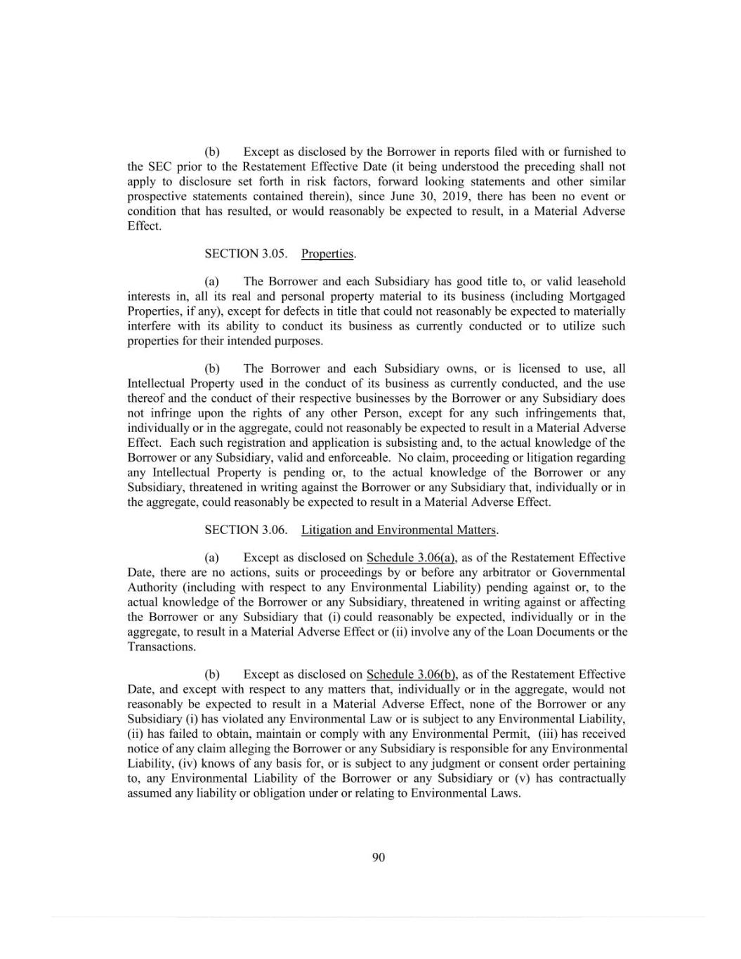 (b) Except as disclosed by the Borrower in reports filed with or furnished to the SEC prior to the Restatement Effective Date (it being understood the preceding shall not apply to disclosure set forth in risk factors, forward looking statements and other similar prospective statements contained therein), since June 30, 2019, there has been no event or condition that has resulted, or would reasonably be expected to result, in a Material Adverse Effect. SECTION 3.05. Properties. (a) The Borrower and each Subsidiary has good title to, or valid leasehold interests in, all its real and personal property material to its business (including Mortgaged Properties, if any), except for defects in title that could not reasonably be expected to materially interfere with its ability to conduct its business as currently conducted or to utilize such properties for their intended purposes. (b) The Borrower and each Subsidiary owns, or is licensed to use, all Intellectual Property used in the conduct of its business as currently conducted, and the use thereof and the conduct of their respective businesses by the Borrower or any Subsidiary does not infringe upon the rights of any other Person, except for any such infringements that, individually or in the aggregate, could not reasonably be expected to result in a Material Adverse Effect. Each such registration and application is subsisting and, to the actual knowledge of the Borrower or any Subsidiary, valid and enforceable. No claim, proceeding or litigation regarding any Intellectual Property is pending or, to the actual knowledge of the Borrower or any Subsidiary, threatened in writing against the Borrower or any Subsidiary that, individually or in the aggregate, could reasonably be expected to result in a Material Adverse Effect. SECTION 3.06. Litigation and Environmental Matters. (a) Except as disclosed on Schedule 3.06(a), as of the Restatement Effective Date, there are no actions, suits or proceedings by or before any arbitrator or Governmental Authority (including with respect to any Environmental Liability) pending against or, to the actual knowledge of the Borrower or any Subsidiary, threatened in writing against or affecting the Borrower or any Subsidiary that (i) could reasonably be expected, individually or in the aggregate, to result in a Material Adverse Effect or (ii) involve any of the Loan Documents or the Transactions. (b) Except as disclosed on Schedule 3.06(b), as of the Restatement Effective Date, and except with respect to any matters that, individually or in the aggregate, would not reasonably be expected to result in a Material Adverse Effect, none of the Borrower or any Subsidiary (i) has violated any Environmental Law or is subject to any Environmental Liability, (ii) has failed to obtain, maintain or comply with any Environmental Permit, (iii) has received notice of any claim alleging the Borrower or any Subsidiary is responsible for any Environmental Liability, (iv) knows of any basis for, or is subject to any judgment or consent order pertaining to, any Environmental Liability of the Borrower or any Subsidiary or (v) has contractually assumed any liability or obligation under or relating to Environmental Laws. 90