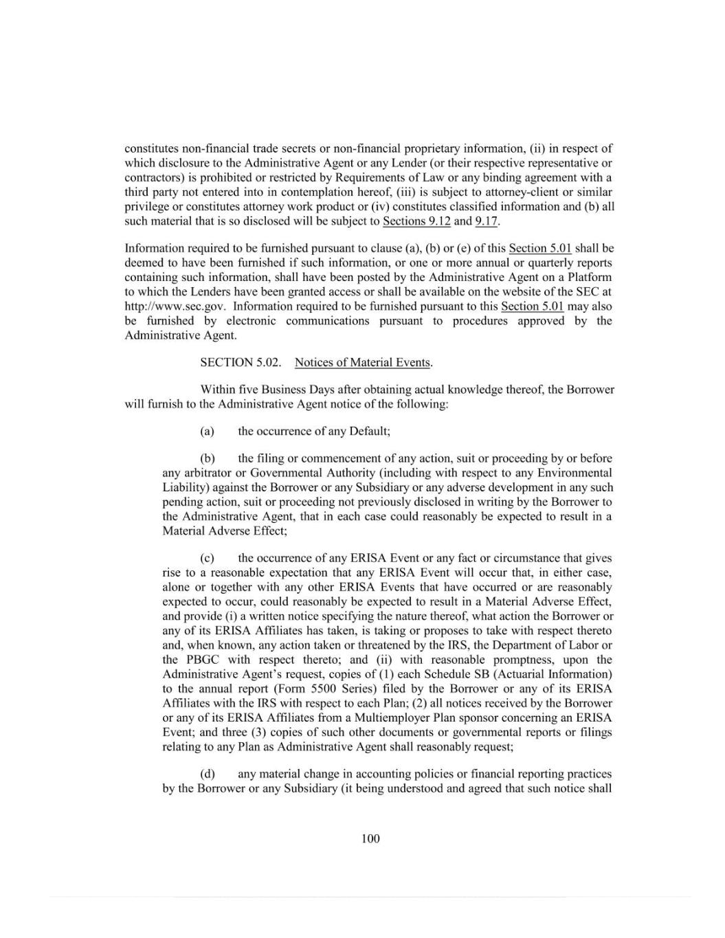 constitutes non-financial trade secrets or non-financial proprietary information, (ii) in respect of which disclosure to the Administrative Agent or any Lender (or their respective representative or contractors) is prohibited or restricted by Requirements of Law or any binding agreement with a third party not entered into in contemplation hereof, (iii) is subject to attorney-client or similar privilege or constitutes attorney work product or (iv) constitutes classified information and (b) all such material that is so disclosed will be subject to Sections 9.12 and 9.17. Information required to be furnished pursuant to clause (a), (b) or (e) of this Section 5.01 shall be deemed to have been furnished if such information, or one or more annual or quarterly reports containing such information, shall have been posted by the Administrative Agent on a Platform to which the Lenders have been granted access or shall be available on the website of the SEC at http://www.sec.gov. Information required to be furnished pursuant to this Section 5.01 may also be furnished by electronic communications pursuant to procedures approved by the Administrative Agent. SECTION 5.02. Notices of Material Events. Within five Business Days after obtaining actual knowledge thereof, the Borrower will furnish to the Administrative Agent notice of the following: (a) the occurrence of any Default; (b) the filing or commencement of any action, suit or proceeding by or before any arbitrator or Governmental Authority (including with respect to any Environmental Liability) against the Borrower or any Subsidiary or any adverse development in any such pending action, suit or proceeding not previously disclosed in writing by the Borrower to the Administrative Agent, that in each case could reasonably be expected to result in a Material Adverse Effect; (c) the occurrence of any ERISA Event or any fact or circumstance that gives rise to a reasonable expectation that any ERISA Event will occur that, in either case, alone or together with any other ERISA Events that have occurred or are reasonably expected to occur, could reasonably be expected to result in a Material Adverse Effect, and provide (i) a written notice specifying the nature thereof, what action the Borrower or any of its ERISA Affiliates has taken, is taking or proposes to take with respect thereto and, when known, any action taken or threatened by the IRS, the Department of Labor or the PBGC with respect thereto; and (ii) with reasonable promptness, upon the Administrative Agent’s request, copies of (1) each Schedule SB (Actuarial Information) to the annual report (Form 5500 Series) filed by the Borrower or any of its ERISA Affiliates with the IRS with respect to each Plan; (2) all notices received by the Borrower or any of its ERISA Affiliates from a Multiemployer Plan sponsor concerning an ERISA Event; and three (3) copies of such other documents or governmental reports or filings relating to any Plan as Administrative Agent shall reasonably request; (d) any material change in accounting policies or financial reporting practices by the Borrower or any Subsidiary (it being understood and agreed that such notice shall 100