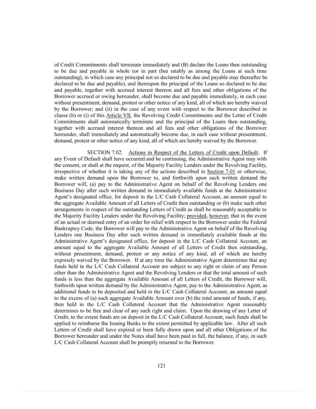 of Credit Commitments shall terminate immediately and (B) declare the Loans then outstanding to be due and payable in whole (or in part (but ratably as among the Loans at such time outstanding), in which case any principal not so declared to be due and payable may thereafter be declared to be due and payable), and thereupon the principal of the Loans so declared to be due and payable, together with accrued interest thereon and all fees and other obligations of the Borrower accrued or owing hereunder, shall become due and payable immediately, in each case without presentment, demand, protest or other notice of any kind, all of which are hereby waived by the Borrower; and (ii) in the case of any event with respect to the Borrower described in clause (h) or (i) of this Article VII, the Revolving Credit Commitments and the Letter of Credit Commitments shall automatically terminate and the principal of the Loans then outstanding, together with accrued interest thereon and all fees and other obligations of the Borrower hereunder, shall immediately and automatically become due, in each case without presentment, demand, protest or other notice of any kind, all of which are hereby waived by the Borrower. SECTION 7.02. Actions in Respect of the Letters of Credit upon Default. If any Event of Default shall have occurred and be continuing, the Administrative Agent may with the consent, or shall at the request, of the Majority Facility Lenders under the Revolving Facility, irrespective of whether it is taking any of the actions described in Section 7.01 or otherwise, make written demand upon the Borrower to, and forthwith upon such written demand the Borrower will, (a) pay to the Administrative Agent on behalf of the Revolving Lenders one Business Day after such written demand in immediately available funds at the Administrative Agent’s designated office, for deposit in the L/C Cash Collateral Account, an amount equal to the aggregate Available Amount of all Letters of Credit then outstanding or (b) make such other arrangements in respect of the outstanding Letters of Credit as shall be reasonably acceptable to the Majority Facility Lenders under the Revolving Facility; provided, however, that in the event of an actual or deemed entry of an order for relief with respect to the Borrower under the Federal Bankruptcy Code, the Borrower will pay to the Administrative Agent on behalf of the Revolving Lenders one Business Day after such written demand in immediately available funds at the Administrative Agent’s designated office, for deposit in the L/C Cash Collateral Account, an amount equal to the aggregate Available Amount of all Letters of Credit then outstanding, without presentment, demand, protest or any notice of any kind, all of which are hereby expressly waived by the Borrower. If at any time the Administrative Agent determines that any funds held in the L/C Cash Collateral Account are subject to any right or claim of any Person other than the Administrative Agent and the Revolving Lenders or that the total amount of such funds is less than the aggregate Available Amount of all Letters of Credit, the Borrower will, forthwith upon written demand by the Administrative Agent, pay to the Administrative Agent, as additional funds to be deposited and held in the L/C Cash Collateral Account, an amount equal to the excess of (a) such aggregate Available Amount over (b) the total amount of funds, if any, then held in the L/C Cash Collateral Account that the Administrative Agent reasonably determines to be free and clear of any such right and claim. Upon the drawing of any Letter of Credit, to the extent funds are on deposit in the L/C Cash Collateral Account, such funds shall be applied to reimburse the Issuing Banks to the extent permitted by applicable law. After all such Letters of Credit shall have expired or been fully drawn upon and all other Obligations of the Borrower hereunder and under the Notes shall have been paid in full, the balance, if any, in such L/C Cash Collateral Account shall be promptly returned to the Borrower. 121