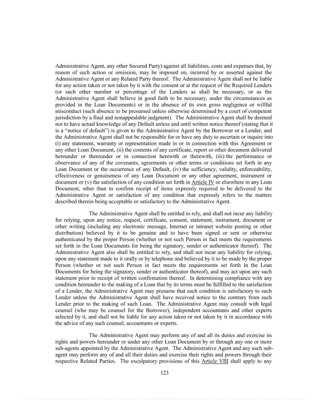 Administrative Agent, any other Secured Party) against all liabilities, costs and expenses that, by reason of such action or omission, may be imposed on, incurred by or asserted against the Administrative Agent or any Related Party thereof. The Administrative Agent shall not be liable for any action taken or not taken by it with the consent or at the request of the Required Lenders (or such other number or percentage of the Lenders as shall be necessary, or as the Administrative Agent shall believe in good faith to be necessary, under the circumstances as provided in the Loan Documents) or in the absence of its own gross negligence or willful misconduct (such absence to be presumed unless otherwise determined by a court of competent jurisdiction by a final and nonappealable judgment). The Administrative Agent shall be deemed not to have actual knowledge of any Default unless and until written notice thereof (stating that it is a “notice of default”) is given to the Administrative Agent by the Borrower or a Lender, and the Administrative Agent shall not be responsible for or have any duty to ascertain or inquire into (i) any statement, warranty or representation made in or in connection with this Agreement or any other Loan Document, (ii) the contents of any certificate, report or other document delivered hereunder or thereunder or in connection herewith or therewith, (iii) the performance or observance of any of the covenants, agreements or other terms or conditions set forth in any Loan Document or the occurrence of any Default, (iv) the sufficiency, validity, enforceability, effectiveness or genuineness of any Loan Document or any other agreement, instrument or document or (v) the satisfaction of any condition set forth in Article IV or elsewhere in any Loan Document, other than to confirm receipt of items expressly required to be delivered to the Administrative Agent or satisfaction of any condition that expressly refers to the matters described therein being acceptable or satisfactory to the Administrative Agent. The Administrative Agent shall be entitled to rely, and shall not incur any liability for relying, upon any notice, request, certificate, consent, statement, instrument, document or other writing (including any electronic message, Internet or intranet website posting or other distribution) believed by it to be genuine and to have been signed or sent or otherwise authenticated by the proper Person (whether or not such Person in fact meets the requirements set forth in the Loan Documents for being the signatory, sender or authenticator thereof). The Administrative Agent also shall be entitled to rely, and shall not incur any liability for relying, upon any statement made to it orally or by telephone and believed by it to be made by the proper Person (whether or not such Person in fact meets the requirements set forth in the Loan Documents for being the signatory, sender or authenticator thereof), and may act upon any such statement prior to receipt of written confirmation thereof. In determining compliance with any condition hereunder to the making of a Loan that by its terms must be fulfilled to the satisfaction of a Lender, the Administrative Agent may presume that such condition is satisfactory to such Lender unless the Administrative Agent shall have received notice to the contrary from such Lender prior to the making of such Loan. The Administrative Agent may consult with legal counsel (who may be counsel for the Borrower), independent accountants and other experts selected by it, and shall not be liable for any action taken or not taken by it in accordance with the advice of any such counsel, accountants or experts. The Administrative Agent may perform any of and all its duties and exercise its rights and powers hereunder or under any other Loan Document by or through any one or more sub-agents appointed by the Administrative Agent. The Administrative Agent and any such sub- agent may perform any of and all their duties and exercise their rights and powers through their respective Related Parties. The exculpatory provisions of this Article VIII shall apply to any 123