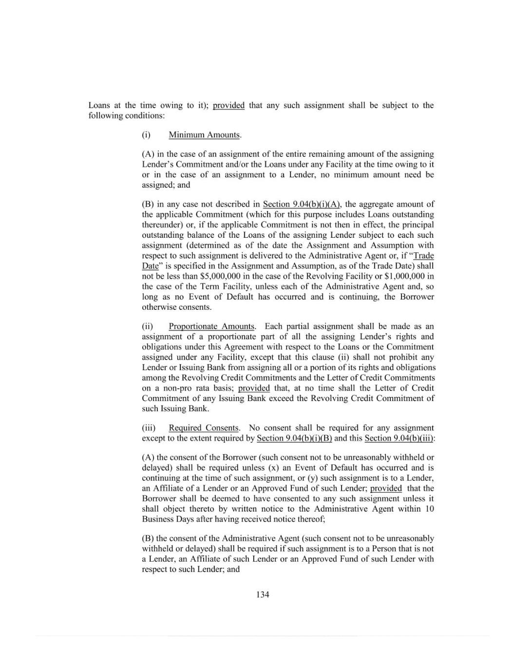 Loans at the time owing to it); provided that any such assignment shall be subject to the following conditions: (i) Minimum Amounts. (A) in the case of an assignment of the entire remaining amount of the assigning Lender’s Commitment and/or the Loans under any Facility at the time owing to it or in the case of an assignment to a Lender, no minimum amount need be assigned; and (B) in any case not described in Section 9.04(b)(i)(A), the aggregate amount of the applicable Commitment (which for this purpose includes Loans outstanding thereunder) or, if the applicable Commitment is not then in effect, the principal outstanding balance of the Loans of the assigning Lender subject to each such assignment (determined as of the date the Assignment and Assumption with respect to such assignment is delivered to the Administrative Agent or, if “Trade Date” is specified in the Assignment and Assumption, as of the Trade Date) shall not be less than $5,000,000 in the case of the Revolving Facility or $1,000,000 in the case of the Term Facility, unless each of the Administrative Agent and, so long as no Event of Default has occurred and is continuing, the Borrower otherwise consents. (ii) Proportionate Amounts. Each partial assignment shall be made as an assignment of a proportionate part of all the assigning Lender’s rights and obligations under this Agreement with respect to the Loans or the Commitment assigned under any Facility, except that this clause (ii) shall not prohibit any Lender or Issuing Bank from assigning all or a portion of its rights and obligations among the Revolving Credit Commitments and the Letter of Credit Commitments on a non-pro rata basis; provided that, at no time shall the Letter of Credit Commitment of any Issuing Bank exceed the Revolving Credit Commitment of such Issuing Bank. (iii) Required Consents. No consent shall be required for any assignment except to the extent required by Section 9.04(b)(i)(B) and this Section 9.04(b)(iii): (A) the consent of the Borrower (such consent not to be unreasonably withheld or delayed) shall be required unless (x) an Event of Default has occurred and is continuing at the time of such assignment, or (y) such assignment is to a Lender, an Affiliate of a Lender or an Approved Fund of such Lender; provided that the Borrower shall be deemed to have consented to any such assignment unless it shall object thereto by written notice to the Administrative Agent within 10 Business Days after having received notice thereof; (B) the consent of the Administrative Agent (such consent not to be unreasonably withheld or delayed) shall be required if such assignment is to a Person that is not a Lender, an Affiliate of such Lender or an Approved Fund of such Lender with respect to such Lender; and 134
