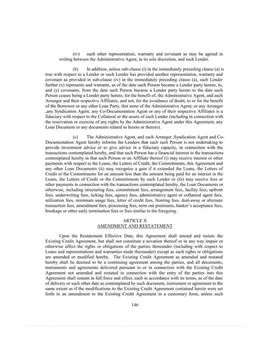 (iv) such other representation, warranty and covenant as may be agreed in writing between the Administrative Agent, in its sole discretion, and such Lender. (b) In addition, unless sub-clause (i) in the immediately preceding clause (a) is true with respect to a Lender or such Lender has provided another representation, warranty and covenant as provided in sub-clause (iv) in the immediately preceding clause (a), such Lender further (x) represents and warrants, as of the date such Person became a Lender party hereto, to, and (y) covenants, from the date such Person became a Lender party hereto to the date such Person ceases being a Lender party hereto, for the benefit of, the Administrative Agent, and each Arranger and their respective Affiliates, and not, for the avoidance of doubt, to or for the benefit of the Borrower or any other Loan Party, that none of the Administrative Agent, or any Arranger ,any Syndication Agent, any Co-Documentation Agent or any of their respective Affiliates is a fiduciary with respect to the Collateral or the assets of such Lender (including in connection with the reservation or exercise of any rights by the Administrative Agent under this Agreement, any Loan Document or any documents related to hereto or thereto). (c) The Administrative Agent, and each Arranger ,Syndication Agent and Co- Documentation Agent hereby informs the Lenders that each such Person is not undertaking to provide investment advice or to give advice in a fiduciary capacity, in connection with the transactions contemplated hereby, and that such Person has a financial interest in the transactions contemplated hereby in that such Person or an Affiliate thereof (i) may receive interest or other payments with respect to the Loans, the Letters of Credit, the Commitments, this Agreement and any other Loan Documents (ii) may recognize a gain if it extended the Loans, the Letters of Credit or the Commitments for an amount less than the amount being paid for an interest in the Loans, the Letters of Credit or the Commitments by such Lender or (iii) may receive fees or other payments in connection with the transactions contemplated hereby, the Loan Documents or otherwise, including structuring fees, commitment fees, arrangement fees, facility fees, upfront fees, underwriting fees, ticking fees, agency fees, administrative agent or collateral agent fees, utilization fees, minimum usage fees, letter of credit fees, fronting fees, deal-away or alternate transaction fees, amendment fees, processing fees, term out premiums, banker’s acceptance fees, breakage or other early termination fees or fees similar to the foregoing. ARTICLE X AMENDMENT AND RESTATEMENT Upon the Restatement Effective Date, this Agreement shall amend and restate the Existing Credit Agreement, but shall not constitute a novation thereof or in any way impair or otherwise affect the rights or obligations of the parties thereunder (including with respect to Loans and representations and warranties made thereunder) except as such rights or obligations are amended or modified hereby. The Existing Credit Agreement as amended and restated hereby shall be deemed to be a continuing agreement among the parties, and all documents, instruments and agreements delivered pursuant to or in connection with the Existing Credit Agreement not amended and restated in connection with the entry of the parties into this Agreement shall remain in full force and effect, each in accordance with its terms, as of the date of delivery or such other date as contemplated by such document, instrument or agreement to the same extent as if the modifications to the Existing Credit Agreement contained herein were set forth in an amendment to the Existing Credit Agreement in a customary form, unless such 146