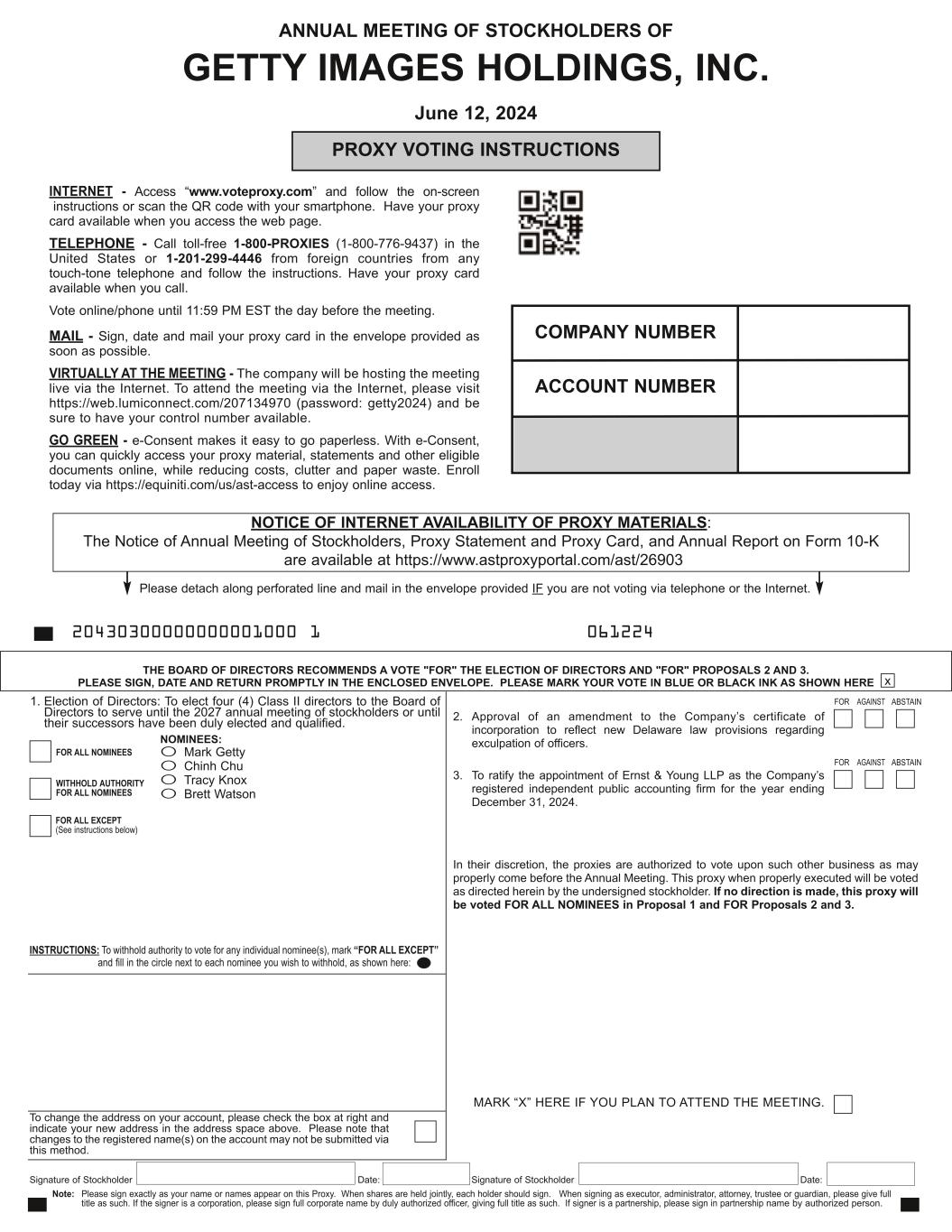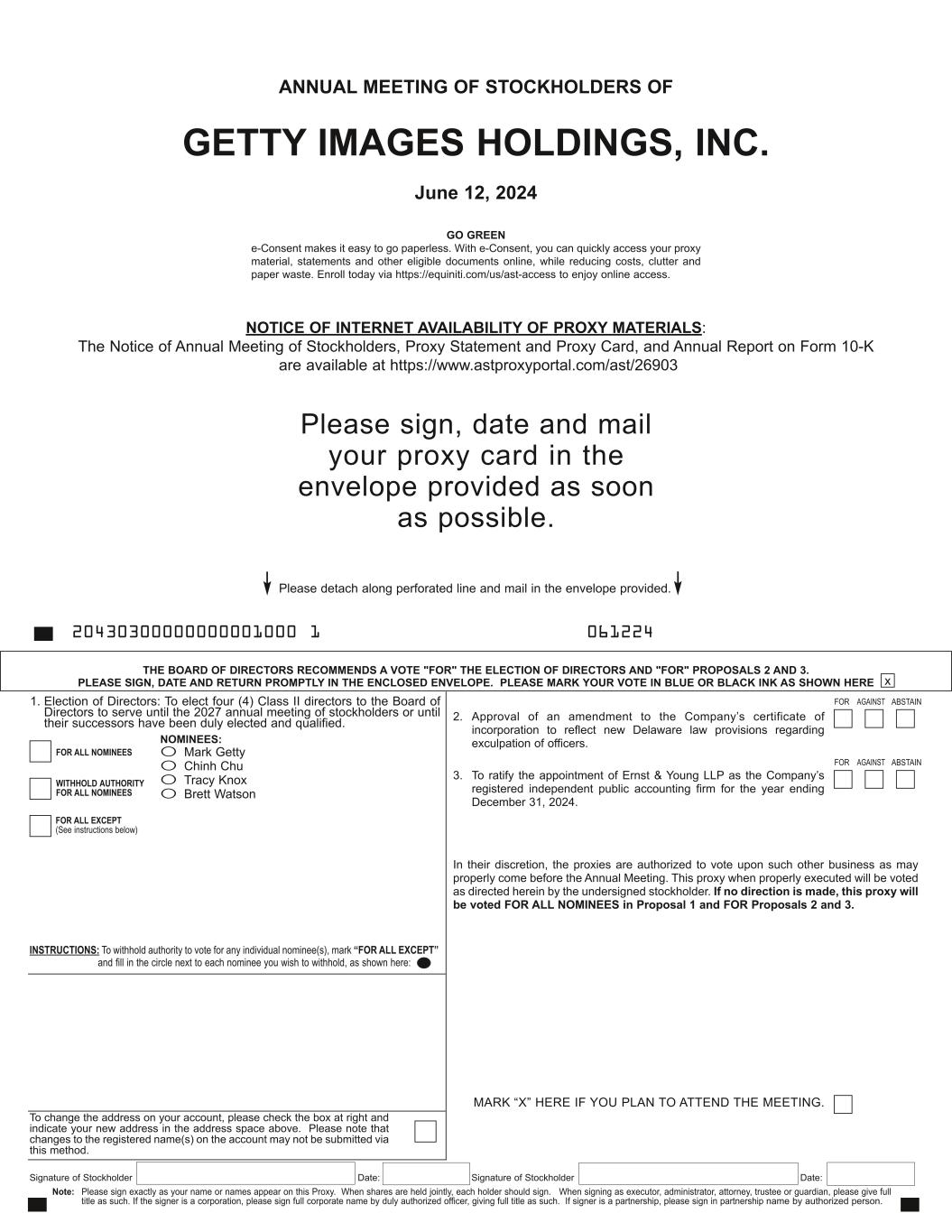 Signature of Stockholder Date: Signature of Stockholder Date: Note: Please sign exactly as your name or names appear on this Proxy. When shares are held jointly, each holder should sign. When signing as executor, administrator, attorney, trustee or guardian, please give full title as such. If the signer is a corporation, please sign full corporate name by duly authorized officer, giving full title as such. If signer is a partnership, please sign in partnership name by authorized person. To change the address on your account, please check the box at right and indicate your new address in the address space above. Please note that changes to the registered name(s) on the account may not be submitted via this method. INSTRUCTIONS: To withhold authority to vote for any individual nominee(s), mark “FOR ALL EXCEPT” and fill in the circle next to each nominee you wish to withhold, as shown here: JOHN SMITH 1234 MAIN STREET APT. 203 NEW YORK, NY 10038 PROXY VOTING INSTRUCTIONS Please detach along perforated line and mail in the envelope provided IF you are not voting via telephone or the Internet. THE BOARD OF DIRECTORS RECOMMENDS A VOTE "FOR" THE ELECTION OF DIRECTORS AND "FOR" PROPOSALS 2 AND 3. PLEASE SIGN, DATE AND RETURN PROMPTLY IN THE ENCLOSED ENVELOPE. PLEASE MARK YOUR VOTE IN BLUE OR BLACK INK AS SHOWN HERE x 20430300000000001000 1 061224 COMPANY NUMBER ACCOUNT NUMBER MARK “X” HERE IF YOU PLAN TO ATTEND THE MEETING. ANNUAL MEETING OF STOCKHOLDERS OF GETTY IMAGES HOLDINGS, INC. June 12, 2024 O Mark Getty O Chinh Chu O Tracy Knox O Brett Watson FOR ALL NOMINEES WITHHOLD AUTHORITY FOR ALL NOMINEES FOR ALL EXCEPT (See instructions below) NOMINEES: NOTICE OF INTERNET AVAILABILITY OF PROXY MATERIALS: The Notice of Annual Meeting of Stockholders, Proxy Statement and Proxy Card, and Annual Report on Form 10-K are available at https://www.astproxyportal.com/ast/26903 1. Election of Directors: To elect four (4) Class II directors to the Board of Directors to serve until the 2027 annual meeting of stockholders or until their successors have been duly elected and qualified. 2. Approval of an amendment to the Company’s certificate of incorporation to reflect new Delaware law provisions regarding exculpation of officers. 3. To ratify the appointment of Ernst & Young LLP as the Company’s registered independent public accounting firm for the year ending December 31, 2024. In their discretion, the proxies are authorized to vote upon such other business as may properly come before the Annual Meeting. This proxy when properly executed will be voted as directed herein by the undersigned stockholder. If no direction is made, this proxy will be voted FOR ALL NOMINEES in Proposal 1 and FOR Proposals 2 and 3. FOR AGAINST ABSTAIN INTERNET - Access “www.voteproxy.com” and follow the on-screen instructions or scan the QR code with your smartphone. Have your proxy card available when you access the web page. TELEPHONE - Call toll-free 1-800-PROXIES (1-800-776-9437) in the United States or 1-201-299-4446 from foreign countries from any touch-tone telephone and follow the instructions. Have your proxy card available when you call. Vote online/phone until 11:59 PM EST the day before the meeting. MAIL - Sign, date and mail your proxy card in the envelope provided as soon as possible. VIRTUALLY AT THE MEETING - The company will be hosting the meeting live via the Internet. To attend the meeting via the Internet, please visit https://web.lumiconnect.com/207134970 (password: getty2024) and be sure to have your control number available. GO GREEN - e-Consent makes it easy to go paperless. With e-Consent, you can quickly access your proxy material, statements and other eligible documents online, while reducing costs, clutter and paper waste. Enroll today via https://equiniti.com/us/ast-access to enjoy online access. FOR AGAINST ABSTAIN