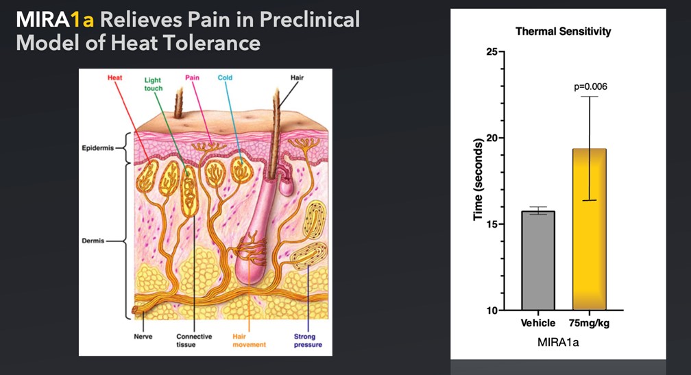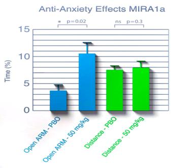 We believe that the effects of MIRA1a at the cannabinoid receptors CB1 and CB2 is predicted to account for the majority of its potential therapeutic effects, especially as it relates to its anti-anxiety, anti-pain and anti-inflammatory properties. For example, the difference in the dose-response effects of MIRA1a compared with THC on CB1 receptors appears to coincide with its improved therapeutic profile.