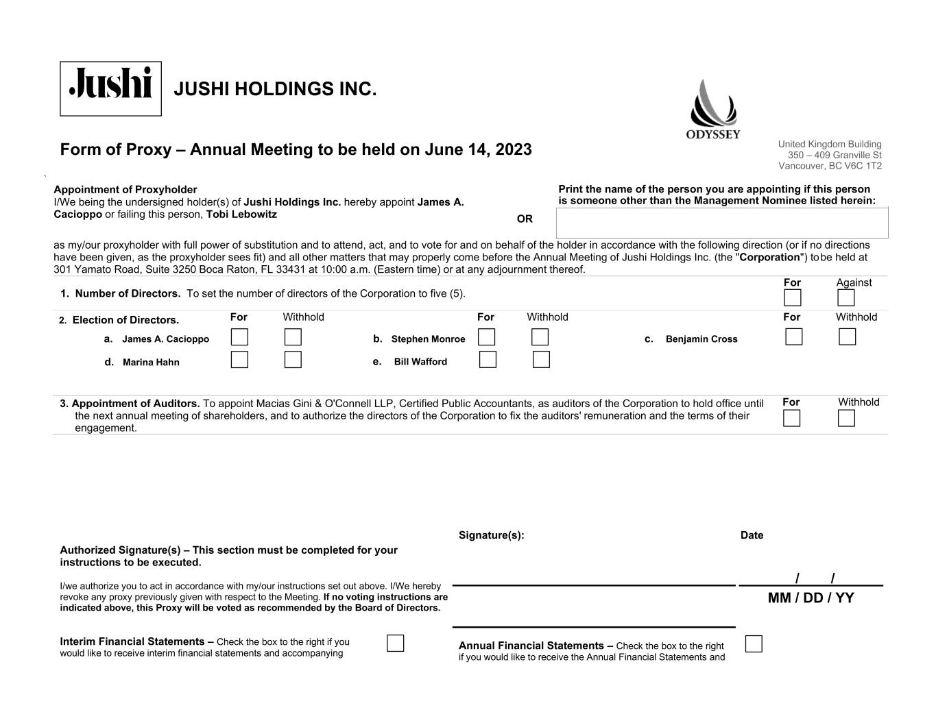 JUSHI HOLDINGS INC. Form of Proxy – Annual Meeting to be held on June 14, 2023 United Kingdom Building 350 – 409 Granville St Vancouver, BC V6C 1T2 ` Appointment of Proxyholder I/We being the undersigned holder(s) of Jushi Holdings Inc. hereby appoint James A. Cacioppo or failing this person, Tobi Lebowitz Print the name of the person you are appointing if this person is someone other than the Management Nominee listed herein: OR as my/our proxyholder with full power of substitution and to attend, act, and to vote for and on behalf of the holder in accordance with the following direction (or if no directions have been given, as the proxyholder sees fit) and all other matters that may properly come before the Annual Meeting of Jushi Holdings Inc. (the "Corporation") to be held at 301 Yamato Road, Suite 3250 Boca Raton, FL 33431 at 10:00 a.m. (Eastern time) or at any adjournment thereof. 2. Election of Directors. For Withhold For Withhold For Withhold a. James A. Cacioppo b. Stephen Monroe c. Benjamin Cross d. Marina Hahn e. Bill Wafford 3. Appointment of Auditors. To appoint Macias Gini & O'Connell LLP, Certified Public Accountants, as auditors of the Corporation to hold office until the next annual meeting of shareholders, and to authorize the directors of the Corporation to fix the auditors' remuneration and the terms of their engagement. For Withhold Authorized Signature(s) – This section must be completed for your instructions to be executed. I/we authorize you to act in accordance with my/our instructions set out above. I/We hereby revoke any proxy previously given with respect to the Meeting. If no voting instructions are indicated above, this Proxy will be voted as recommended by the Board of Directors. Signature(s): Date / / MM / DD / YY Interim Financial Statements – Check the box to the right if you would like to receive interim financial statements and accompanying Annual Financial Statements – Check the box to the right if you would like to receive the Annual Financial Statements and 1. Number of Directors. To set the number of directors of the Corporation to five (5). For Against