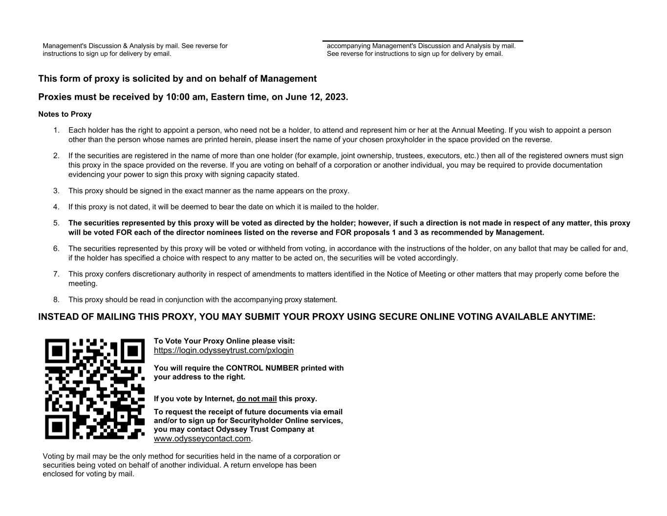 Management's Discussion & Analysis by mail. See reverse for instructions to sign up for delivery by email. accompanying Management's Discussion and Analysis by mail. See reverse for instructions to sign up for delivery by email. This form of proxy is solicited by and on behalf of Management Proxies must be received by 10:00 am, Eastern time, on June 12, 2023. Notes to Proxy 1. Each holder has the right to appoint a person, who need not be a holder, to attend and represent him or her at the Annual Meeting. If you wish to appoint a person other than the person whose names are printed herein, please insert the name of your chosen proxyholder in the space provided on the reverse. 2. If the securities are registered in the name of more than one holder (for example, joint ownership, trustees, executors, etc.) then all of the registered owners must sign this proxy in the space provided on the reverse. If you are voting on behalf of a corporation or another individual, you may be required to provide documentation evidencing your power to sign this proxy with signing capacity stated. 3. This proxy should be signed in the exact manner as the name appears on the proxy. 4. If this proxy is not dated, it will be deemed to bear the date on which it is mailed to the holder. 5. The securities represented by this proxy will be voted as directed by the holder; however, if such a direction is not made in respect of any matter, this proxy will be voted FOR each of the director nominees listed on the reverse and FOR proposals 1 and 3 as recommended by Management. 6. The securities represented by this proxy will be voted or withheld from voting, in accordance with the instructions of the holder, on any ballot that may be called for and, if the holder has specified a choice with respect to any matter to be acted on, the securities will be voted accordingly. 7. This proxy confers discretionary authority in respect of amendments to matters identified in the Notice of Meeting or other matters that may properly come before the meeting. 8. This proxy should be read in conjunction with the accompanying proxy statement. INSTEAD OF MAILING THIS PROXY, YOU MAY SUBMIT YOUR PROXY USING SECURE ONLINE VOTING AVAILABLE ANYTIME: To Vote Your Proxy Online please visit: https://login.odysseytrust.com/pxlogin You will require the CONTROL NUMBER printed with your address to the right. If you vote by Internet, do not mail this proxy. To request the receipt of future documents via email and/or to sign up for Securityholder Online services, you may contact Odyssey Trust Company at www.odysseycontact.com. Voting by mail may be the only method for securities held in the name of a corporation or securities being voted on behalf of another individual. A return envelope has been enclosed for voting by mail.