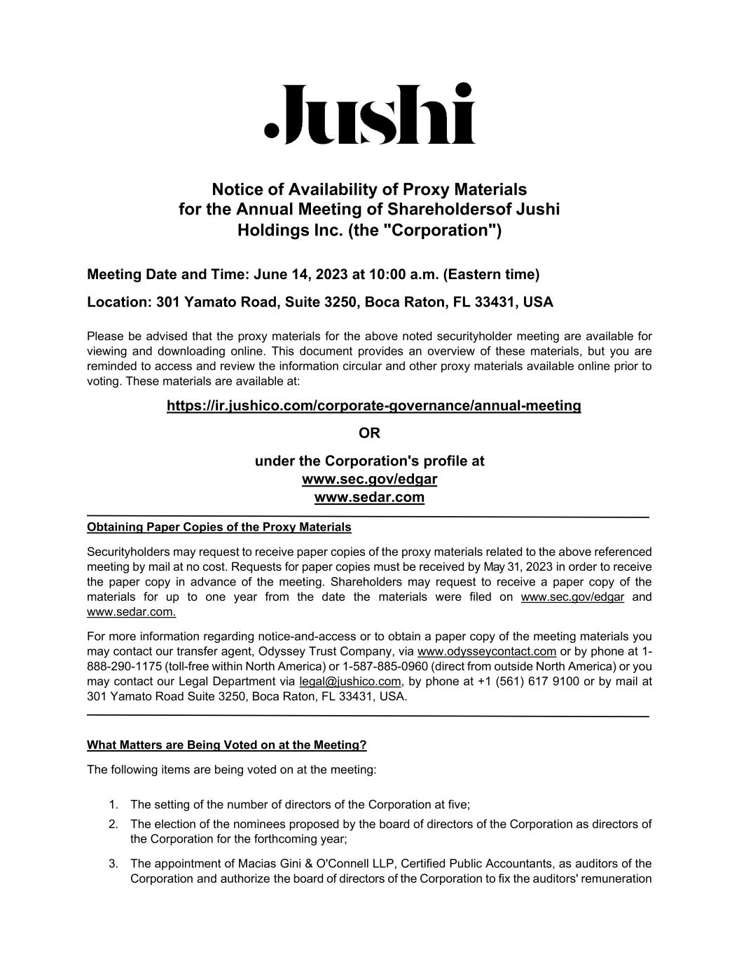 Notice of Availability of Proxy Materials for the Annual Meeting of Shareholders of Jushi Holdings Inc. (the "Corporation") Meeting Date and Time: June 14, 2023 at 10:00 a.m. (Eastern time) Location: 301 Yamato Road, Suite 3250, Boca Raton, FL 33431, USA Please be advised that the proxy materials for the above noted securityholder meeting are available for viewing and downloading online. This document provides an overview of these materials, but you are reminded to access and review the information circular and other proxy materials available online prior to voting. These materials are available at: https://ir.jushico.com/corporate-governance/annual-meeting OR under the Corporation's profile at www.sec.gov/edgar www.sedar.com Obtaining Paper Copies of the Proxy Materials Securityholders may request to receive paper copies of the proxy materials related to the above referenced meeting by mail at no cost. Requests for paper copies must be received by May 31, 2023 in order to receive the paper copy in advance of the meeting. Shareholders may request to receive a paper copy of the materials for up to one year from the date the materials were filed on www.sec.gov/edgar and www.sedar.com. For more information regarding notice-and-access or to obtain a paper copy of the meeting materials you may contact our transfer agent, Odyssey Trust Company, via www.odysseycontact.com or by phone at 1- 888-290-1175 (toll-free within North America) or 1-587-885-0960 (direct from outside North America) or you may contact our Legal Department via legal@jushico.com, by phone at +1 (561) 617 9100 or by mail at 301 Yamato Road Suite 3250, Boca Raton, FL 33431, USA. What Matters are Being Voted on at the Meeting? The following items are being voted on at the meeting: 1. The setting of the number of directors of the Corporation at five; 2. The election of the nominees proposed by the board of directors of the Corporation as directors of the Corporation for the forthcoming year; 3. The appointment of Macias Gini & O'Connell LLP, Certified Public Accountants, as auditors of the Corporation and authorize the board of directors of the Corporation to fix the auditors' remuneration