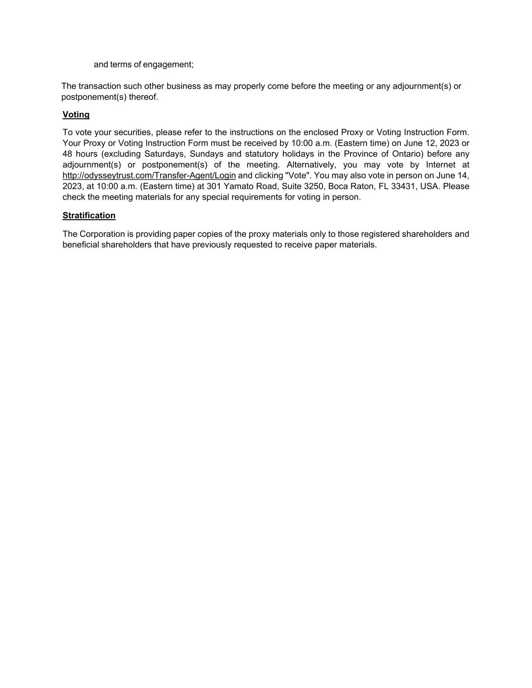 and terms of engagement; The transaction such other business as may properly come before the meeting or any adjournment(s) or postponement(s) thereof. Voting To vote your securities, please refer to the instructions on the enclosed Proxy or Voting Instruction Form. Your Proxy or Voting Instruction Form must be received by 10:00 a.m. (Eastern time) on June 12, 2023 or 48 hours (excluding Saturdays, Sundays and statutory holidays in the Province of Ontario) before any adjournment(s) or postponement(s) of the meeting. Alternatively, you may vote by Internet at http://odysseytrust.com/Transfer-Agent/Login and clicking "Vote". You may also vote in person on June 14, 2023, at 10:00 a.m. (Eastern time) at 301 Yamato Road, Suite 3250, Boca Raton, FL 33431, USA. Please check the meeting materials for any special requirements for voting in person. Stratification The Corporation is providing paper copies of the proxy materials only to those registered shareholders and beneficial shareholders that have previously requested to receive paper materials.