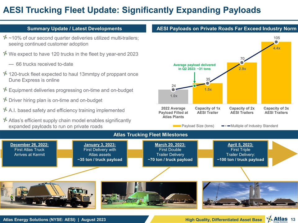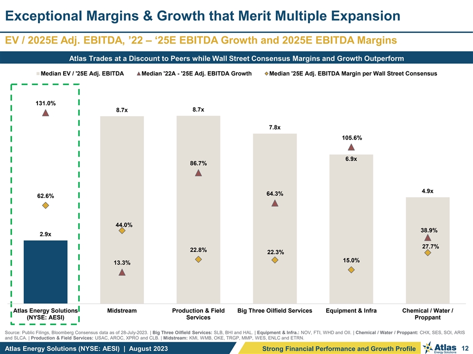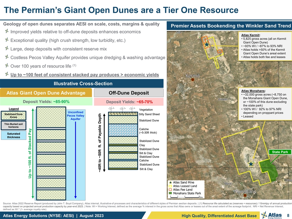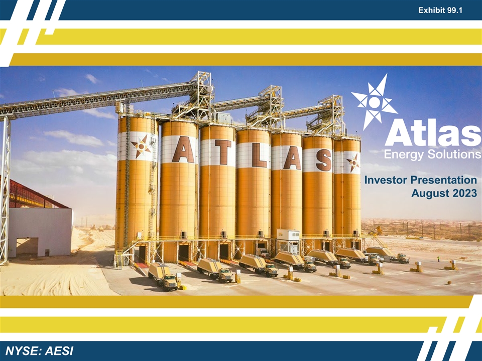 Important Disclosures Forward-Looking Statements This presentation contains “forward-looking statements” of Atlas Energy Solutions Inc. (“Atlas,” the “Company,” “AESI,” “we,” “us” or “our”) within the meaning of Section 27A of the Securities Act of 1933, as amended, and Section 21E of the Securities Exchange Act of 1934, as amended. Statements that are predictive or prospective in nature, that depend upon or refer to future events or conditions or that include the words “may,” “assume,” “forecast,” “position,” “strategy,” “potential,” “continue,” “could,” “will,” “plan,” “project,” “budget,” “predict,” “pursue,” “target,” “seek,” “objective,” “believe,” “expect,” “anticipate,” “intend,” “estimate,” and other expressions that are predictions of or indicate future events and trends and that do not relate to historical matters identify forward-looking statements. Our forward-looking statements include statements about our business strategy, industry, future operations and profitability, expected capital expenditures and the impact of such expenditures on our performance, our proposed corporate reorganization transaction (the Up-C Simplification ), financial position, production, revenues and losses, our capital programs, management changes, current and potential future long-term contracts and our future business and financial performance. Although forward-looking statements reflect our good faith beliefs at the time they are made, we caution you that these forward-looking statements are subject to a number of risks and uncertainties, most of which are difficult to predict and many of which are beyond our control. These risks include, but are not limited to, commodity price volatility stemming from the continued impacts of COVID-19, including any new strains or variants, the ongoing war in Ukraine, adverse developments affecting the financial services industry, our ability to complete growth projects, including the Dune Express, on time and on budget, our ability to consummate the Up-C Simplification, the expected benefits of such transaction and the related impact on existing stakeholders, estimates regarding future market capitalization and the anticipated financial impact of the Up-C Simplification, actions of OPEC+ to set and maintain oil production levels, the level of production of crude oil, natural gas and other hydrocarbons and the resultant market prices of crude oil, inflation, environmental risks, operating risks, regulatory changes, lack of demand, market share growth, the uncertainty inherent in projecting future rates of reserves, production, cash flow, access to capital, the timing of development expenditures and other factors discussed under the heading “Risk Factors” in our Registration Statement on Form S-1 (our “Final Prospectus”) filed with the U.S. Securities and Exchange Commission (“SEC”) on January 31, 2023 (as later amended) in connection with our initial public offering (our “IPO”), the registration statement on Form S-4 that will be filed by New Atlas HoldCo Inc. (“New Atlas”) with the SEC in connection with the Up-C Simplification, or any of our other filings with the SEC. You are cautioned not to place undue reliance on any forward-looking statements, which speak only as of the date of this presentation. Should one or more of these risks or uncertainties occur, or should underlying assumptions prove incorrect, our actual results and plans could differ materially from those expressed in any forward-looking statements. All forward-looking statements, expressed or implied, are expressly qualified in their entirety by this cautionary statement. This cautionary statement should also be considered in connection with any subsequent written or oral forward-looking statements that we or persons acting on our behalf may issue. Except as otherwise required by applicable law, we disclaim any duty and do not intend to update any forward-looking statements to reflect events or circumstances after the date of this presentation. Adjusted EBITDA, Adjusted EBITDA Margin, Adjusted Free Cash Flow, Adjusted Free Cash Flow Margin, Adjusted Free Cash Flow Conversion and Maintenance Capital Expenditures are non-GAAP supplemental financial measures are used by our management and by external users of our financial statements such as investors, research analysts and others, in the case of Adjusted EBITDA, to assess our operating performance on a consistent basis across periods by removing the effects of development activities, provide views on capital resources available to organically fund growth projects and, in the case of Adjusted Free Cash Flow, to assess the financial performance of our assets and their ability to sustain dividends over the long term without regard to financing methods, capital structure, levels of reinvestment or historical cost basis. These measures do not represent and should not be considered alternatives to, or more meaningful than, net income, income from operations, net cash provided by operating activities, or any other measure of financial performance presented in accordance with GAAP as measures of our financial performance. Adjusted EBITDA and Adjusted Free Cash Flow have important limitations as analytical tools because they exclude some but not all items that affect net income, the most directly comparable GAAP financial measure. Our computation of Adjusted EBITDA, Adjusted EBITDA Margin, Adjusted Free Cash Flow, Adjusted Free Cash Flow Margin, Adjusted Free Cash Flow Conversion and Maintenance Capital Expenditures may differ from computations of similarly titled measures of other companies. We define Adjusted EBITDA as net income before depreciation, depletion and accretion, interest expense, income tax expense, stock and unit-based compensation, loss on extinguishment of debt, unrealized commodity derivative gain (los
