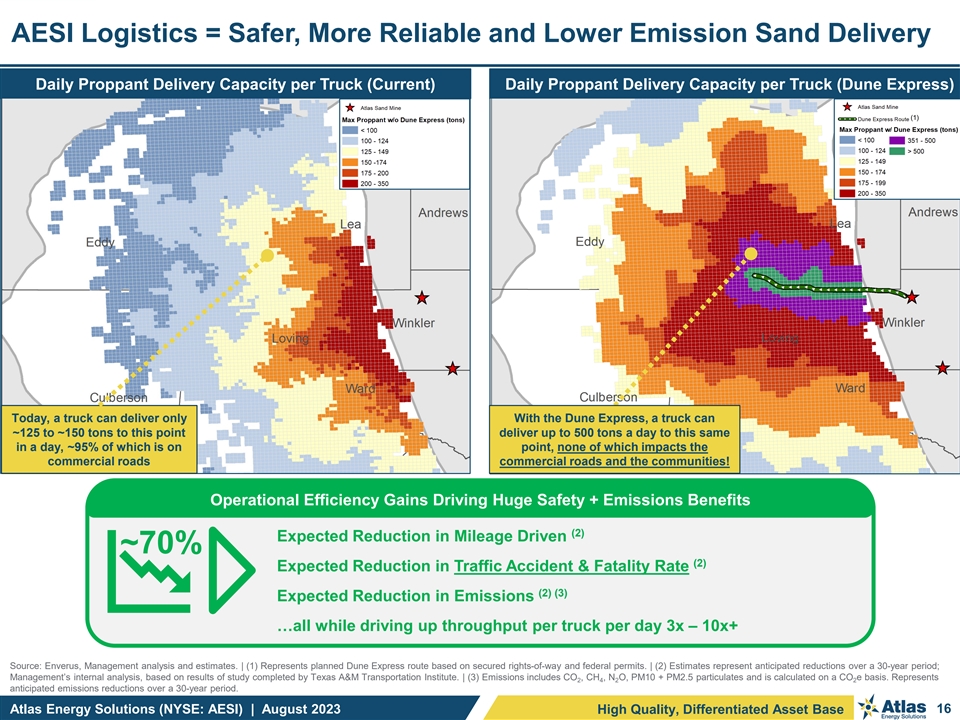 The Dune Express: Proppant Midstream Infrastructure Project Overview Dune Express Update (as of July 31, 2023) The Dune Express is an overland conveyor system that will Right of Way Acquisition: Complete transport proppant to the Delaware Basin Pre-Construction Engineering: Complete — Expected cost: $400 million Groundbreaking: Complete (March 2023) — Planned commercial in-service: Q4 2024 Procurement: ~80% of equipment + materials on order Asset Specifications: Construction: ~36 miles of the right of way has been cleared — Expected throughput capacity: 13mmtpy Sales: Secured commitments from 5 customers who will be — ~85,000 tons of storage tied-in to 4+ loadouts serviced with sand and logistics from the Dune Express Atlas acts as its own general contractor on all major construction activity to maximize budget & timeline control Dune Express remains on-time and on-budget (1) (1)(2)(3) Routed into High Return Drilling Routed into Deepest Inventory Dune Express Update ~36 Miles of Cleared Right-of-Way Source: Enverus | (1) Represents expected Dune Express route based on secured rights-of-way and federal permits. | (2) Based on existing well count within each section. st nd rd (3) Based on conservative estimates wells per section per interval – 6-8 for 1 Bone Spring, 2 Bone Spring, 8-10 for 3 Bone Spring and Wolfcamp XY, 10-14 for Wolfcamp A, 8-12 for Wolfcamp B and 6-8 for Wolfcamp C. Atlas Energy Solutions (NYSE: AESI) | August 2023 15 High Quality, Differentiated Asset Base