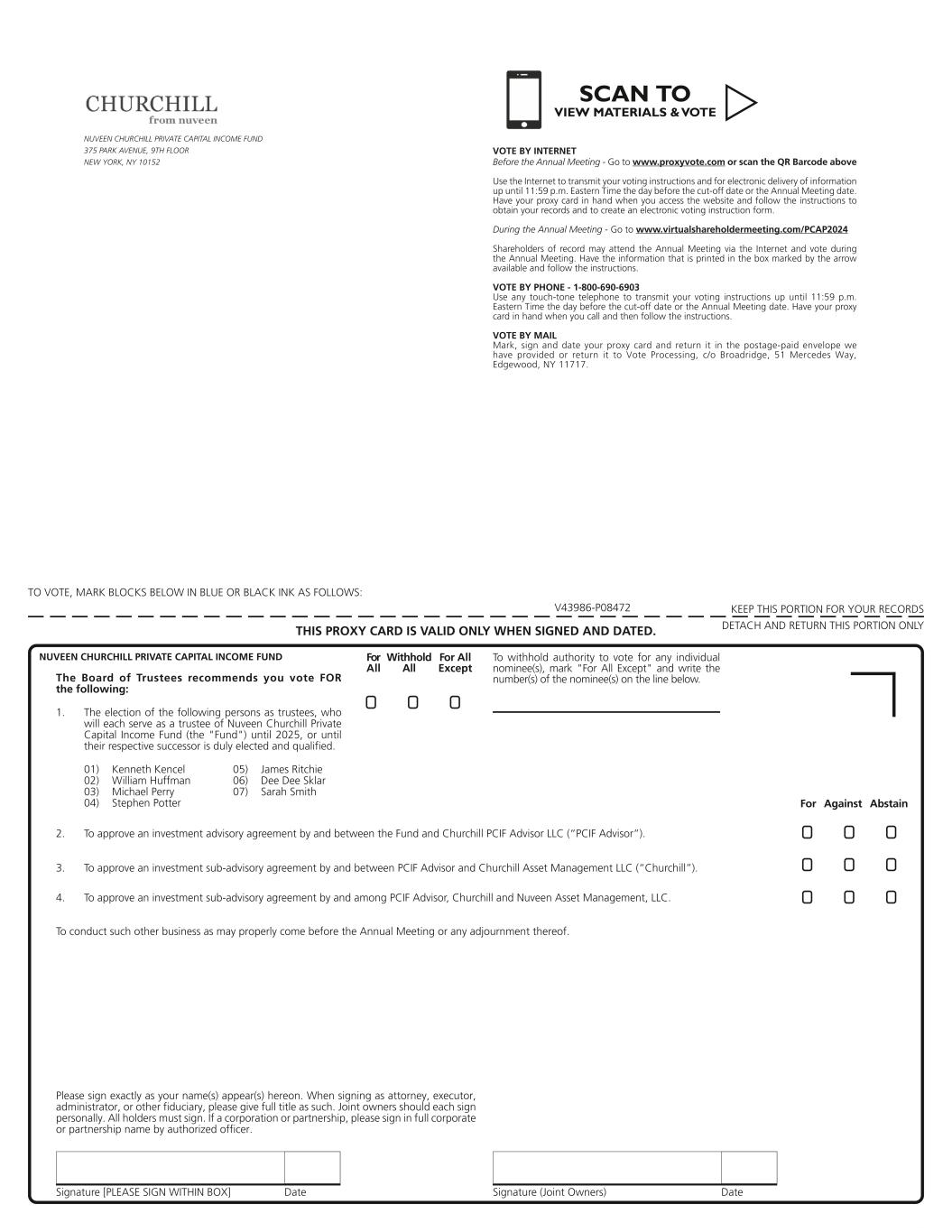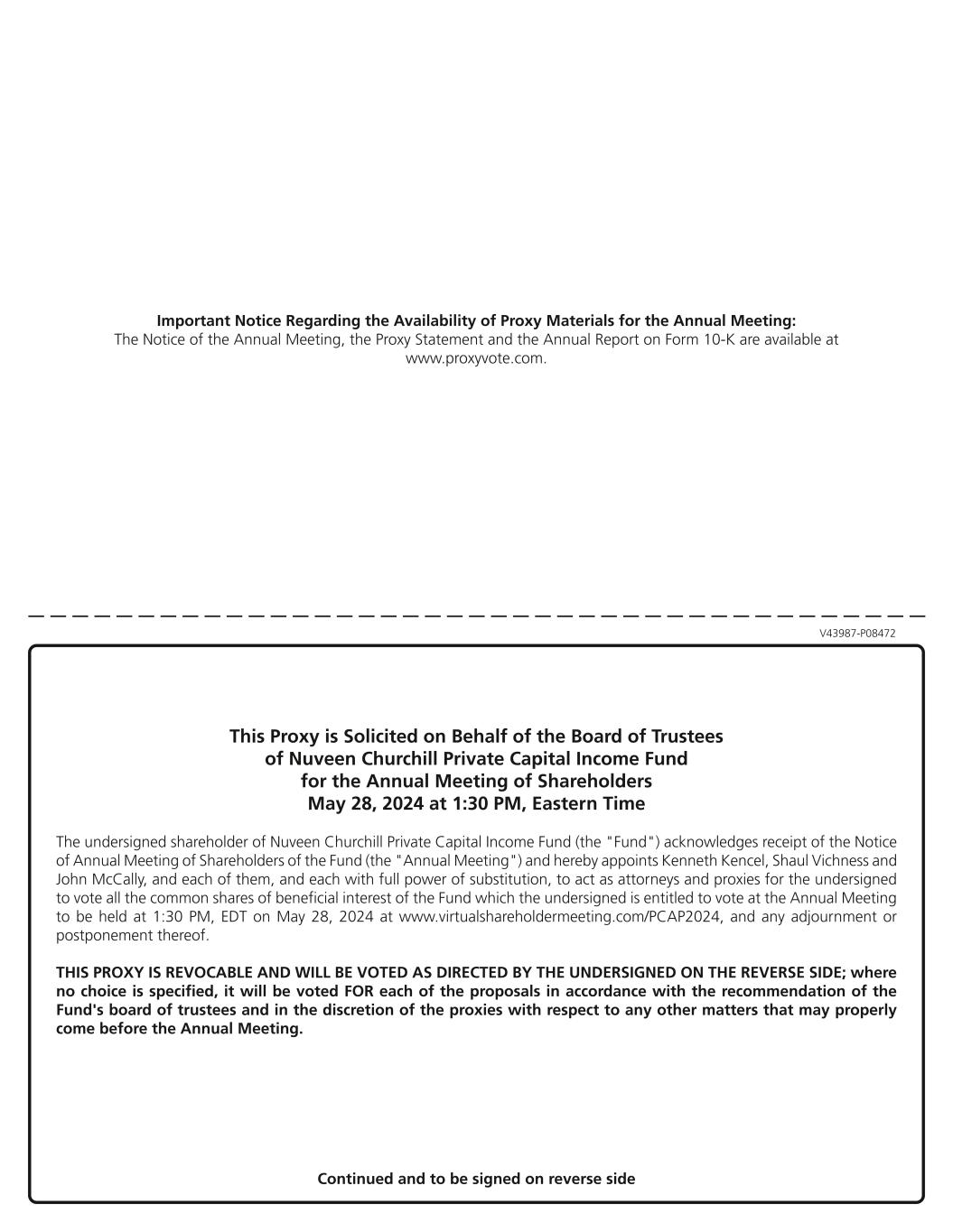 You are cordially invited to attend the annual meeting of shareholders of Nuveen Churchill Private Capital Income Fund (the “Fund”) to be held on May 28, 2024 at 1:30 p.m., Eastern Time (the “Annual Meeting”). The Annual Meeting will be held in a virtual meeting format setting only. You can participate in the Annual Meeting, vote and submit questions via live audio webcast by visiting www.virtualshareholdermeeting.com/PCAP2024 and entering your control number on your proxy card or voting instruction form.