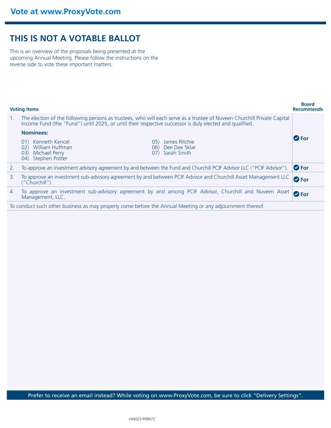 THIS IS NOT A VOTABLE BALLOT This is an overview of the proposals being presented at the upcoming Annual Meeting. Please follow the instructions on the reverse side to vote these important matters. Vote at www.ProxyVote.com Prefer to receive an email instead? While voting on www.ProxyVote.com, be sure to click “Delivery Settings”. Voting Items Board Recommends V44023-P08472 1. The election of the following persons as trustees, who will each serve as a trustee of Nuveen Churchill Private Capital Income Fund (the “Fund”) until 2025, or until their respective successor is duly elected and qualified. For Nominees: 01) Kenneth Kencel 02) William Huffman 03) Michael Perry 04) Stephen Potter 05) James Ritchie 06) Dee Dee Sklar 07) Sarah Smith 2. To approve an investment advisory agreement by and between the Fund and Churchill PCIF Advisor LLC (“PCIF Advisor”). For 3. To approve an investment sub-advisory agreement by and between PCIF Advisor and Churchill Asset Management LLC (“Churchill”). For 4. To approve an investment sub-advisory agreement by and among PCIF Advisor, Churchill and Nuveen Asset Management, LLC. For To conduct such other business as may properly come before the Annual Meeting or any adjournment thereof.