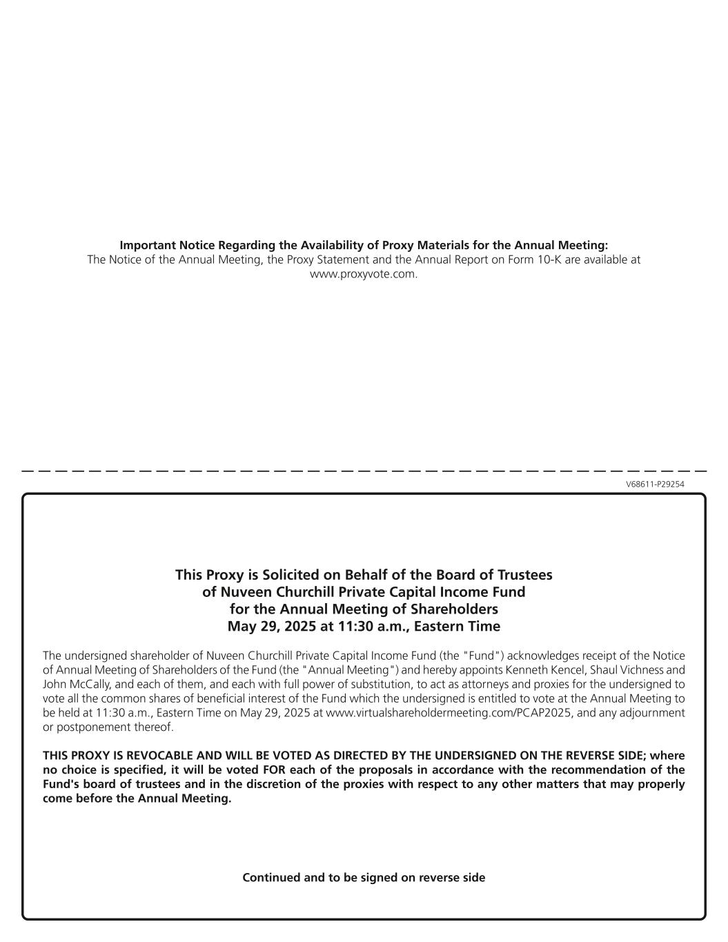 The annual meeting (the “Annual Meeting”) of shareholders of Nuveen Churchill Private Capital Income Fund (“Shareholders”), which is sometimes referred to in this proxy statement as “we,” “us,” “our,” or the “Fund,” will be held in a virtual meeting format only on May 29, 2025. You will be able to participate in the Annual Meeting, vote and submit your questions via live webcast by visiting www.virtualshareholdermeeting.com/PCAP2025.