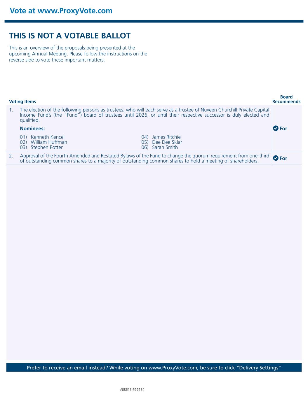 THIS IS NOT A VOTABLE BALLOT This is an overview of the proposals being presented at the upcoming Annual Meeting. Please follow the instructions on the reverse side to vote these important matters. Vote at www.ProxyVote.com Prefer to receive an email instead? While voting on www.ProxyVote.com, be sure to click “Delivery Settings” Voting Items Board Recommends V68613-P29254 1. The election of the following persons as trustees, who will each serve as a trustee of Nuveen Churchill Private Capital Income Fund’s (the “Fund”) board of trustees until 2026, or until their respective successor is duly elected and qualified. For Nominees: 01) Kenneth Kencel 02) William Huffman 03) Stephen Potter 04) James Ritchie 05) Dee Dee Sklar 06) Sarah Smith 2. Approval of the Fourth Amended and Restated Bylaws of the Fund to change the quorum requirement from one-third of outstanding common shares to a majority of outstanding common shares to hold a meeting of shareholders. For