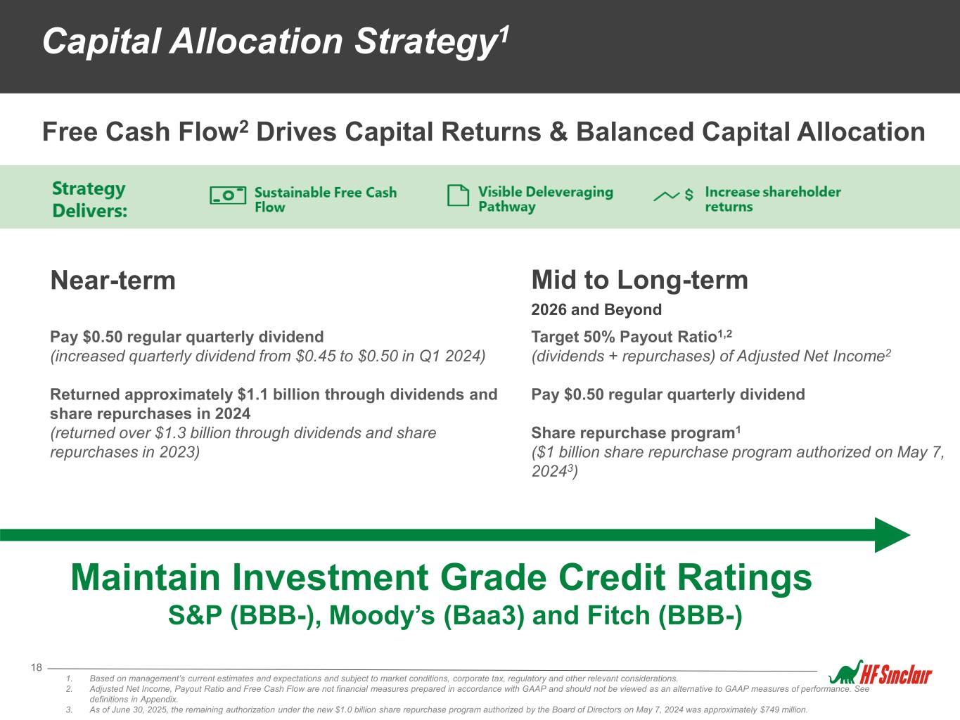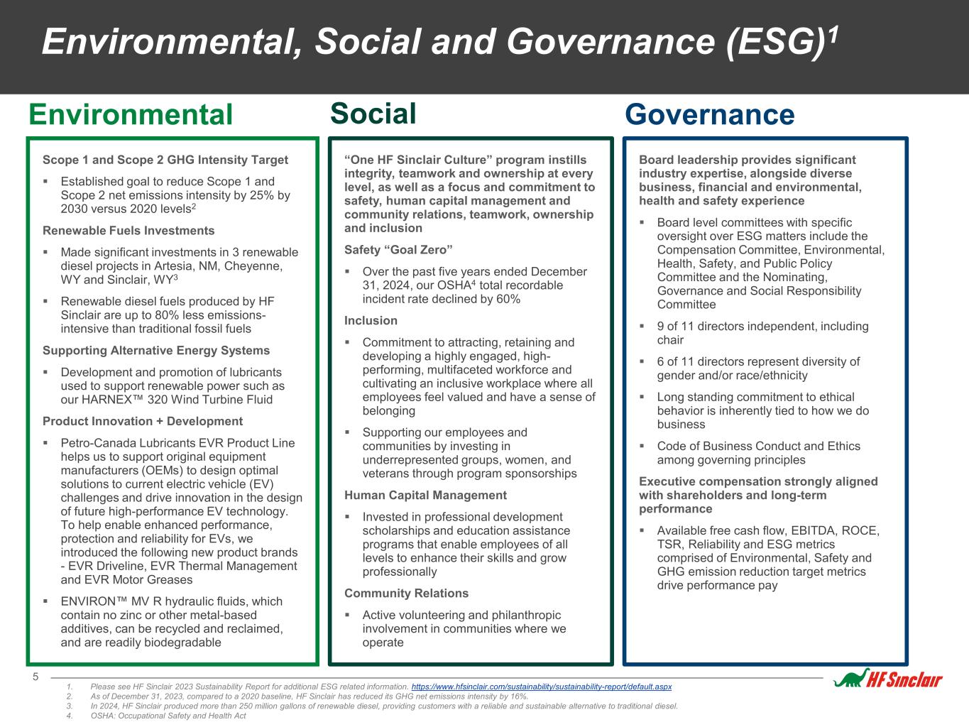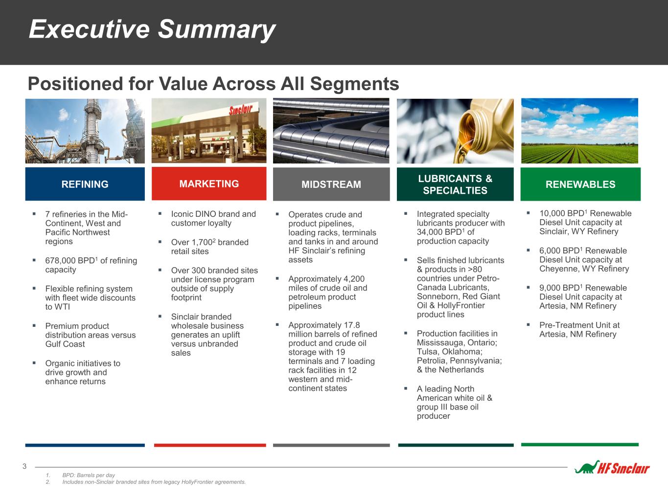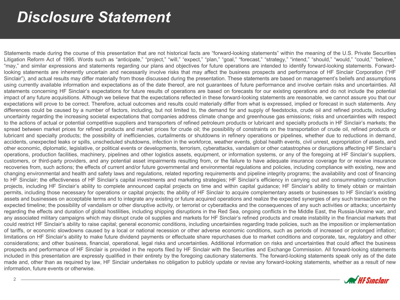 2 Disclosure Statement Statements made during the course of this presentation that are not historical facts are “forward-looking statements” within the meaning of the U.S. Private Securities Litigation Reform Act of 1995. Words such as “anticipate,” “project,” “will,” “expect,” “plan,” “goal,” “forecast,” “strategy,” “intend,” “should,” “would,” “could,” “believe,” “may,” and similar expressions and statements regarding our plans and objectives for future operations are intended to identify forward-looking statements. Forward- looking statements are inherently uncertain and necessarily involve risks that may affect the business prospects and performance of HF Sinclair Corporation (“HF Sinclair”), and actual results may differ materially from those discussed during the presentation. These statements are based on management’s beliefs and assumptions using currently available information and expectations as of the date thereof, are not guarantees of future performance and involve certain risks and uncertainties. All statements concerning HF Sinclair’s expectations for future results of operations are based on forecasts for our existing operations and do not include the potential impact of any future acquisitions. Although we believe that the expectations reflected in these forward-looking statements are reasonable, we cannot assure you that our expectations will prove to be correct. Therefore, actual outcomes and results could materially differ from what is expressed, implied or forecast in such statements. Any differences could be caused by a number of factors, including, but not limited to, the demand for and supply of feedstocks, crude oil and refined products, including uncertainty regarding the increasing societal expectations that companies address climate change and greenhouse gas emissions; risks and uncertainties with respect to the actions of actual or potential competitive suppliers and transporters of refined petroleum products or lubricant and specialty products in HF Sinclair’s markets; the spread between market prices for refined products and market prices for crude oil; the possibility of constraints on the transportation of crude oil, refined products or lubricant and specialty products; the possibility of inefficiencies, curtailments or shutdowns in refinery operations or pipelines, whether due to reductions in demand, accidents, unexpected leaks or spills, unscheduled shutdowns, infection in the workforce, weather events, global health events, civil unrest, expropriation of assets, and other economic, diplomatic, legislative, or political events or developments, terrorism, cyberattacks, vandalism or other catastrophes or disruptions affecting HF Sinclair’s operations, production facilities, machinery, pipelines and other logistics assets, equipment, or information systems, or any of the foregoing at HF Sinclair’s suppliers, customers, or third-party providers, and any potential asset impairments resulting from, or the failure to have adequate insurance coverage for or receive insurance recoveries from, such actions; the effects of current and/or future governmental and environmental regulations and policies, including compliance with existing, new and changing environmental and health and safety laws and regulations, related reporting requirements and pipeline integrity programs; the availability and cost of financing to HF Sinclair; the effectiveness of HF Sinclair’s capital investments and marketing strategies; HF Sinclair’s efficiency in carrying out and consummating construction projects, including HF Sinclair’s ability to complete announced capital projects on time and within capital guidance; HF Sinclair’s ability to timely obtain or maintain permits, including those necessary for operations or capital projects; the ability of HF Sinclair to acquire complementary assets or businesses to HF Sinclair’s existing assets and businesses on acceptable terms and to integrate any existing or future acquired operations and realize the expected synergies of any such transaction on the expected timeline; the possibility of vandalism or other disruptive activity, or terrorist or cyberattacks and the consequences of any such activities or attacks; uncertainty regarding the effects and duration of global hostilities, including shipping disruptions in the Red Sea, ongoing conflicts in the Middle East, the Russia-Ukraine war, and any associated military campaigns which may disrupt crude oil supplies and markets for HF Sinclair’s refined products and create instability in the financial markets that could restrict HF Sinclair’s ability to raise capital; general economic conditions, including uncertainties regarding trade policies, such as the imposition or implementation of tariffs, or economic slowdowns caused by a local or national recession or other adverse economic conditions, such as periods of increased or prolonged inflation; limitations on HF Sinclair’s ability to make future dividend payments or effectuate share repurchases due to market conditions and corporate, tax, regulatory and other considerations; and other business, financial, operational, legal risks and uncertainties. Additional information on risks and uncertainties that could affect the business prospects and performance of HF Sinclair is provided in the reports filed by HF Sinclair with the Securities and Exchange Commission. All forward-looking statements included in this presentation are expressly qualified in their entirety by the foregoing cautionary statements. The forward-looking statements speak only as of the date made and, other than as required by law, HF Sinclair undertakes no obligation to publicly update or revise any forward-looking statements, whether as a result of new information, future events or otherwise.