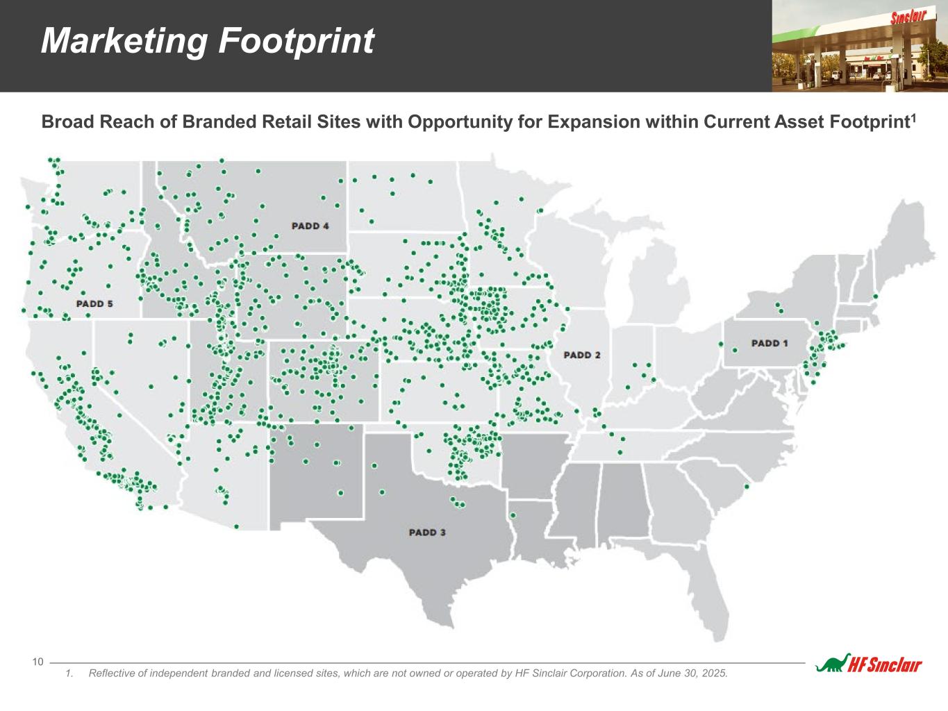 9 Marketing Overview Diversifying with HF Sinclair’s Iconic Brand and Integrated Distribution Network Provides a consistent sales channel for produced fuels with stable margins as well as additional earnings from brand licensing and credit card programs Footprint1: Iconic DINO brand 1,700+2 wholesale branded sites Approximately 1.4B gallons per year of branded fuel sales 300+ sites branded under a license program outside supply footprint Financial Highlights: Provides further advantage through RIN generation Additional margin from credit card network Sinclair branded wholesale business generates an uplift versus unbranded sales Driving growth and leveraging increased distribution network Downward integration of legacy HollyFrontier products Opportunities with accelerated brand growth across HF Sinclair products and geographies Significant RIN generation through distribution network 1. As of June 30, 2025. 2. Includes non-Sinclair branded sites from legacy HollyFrontier agreements.