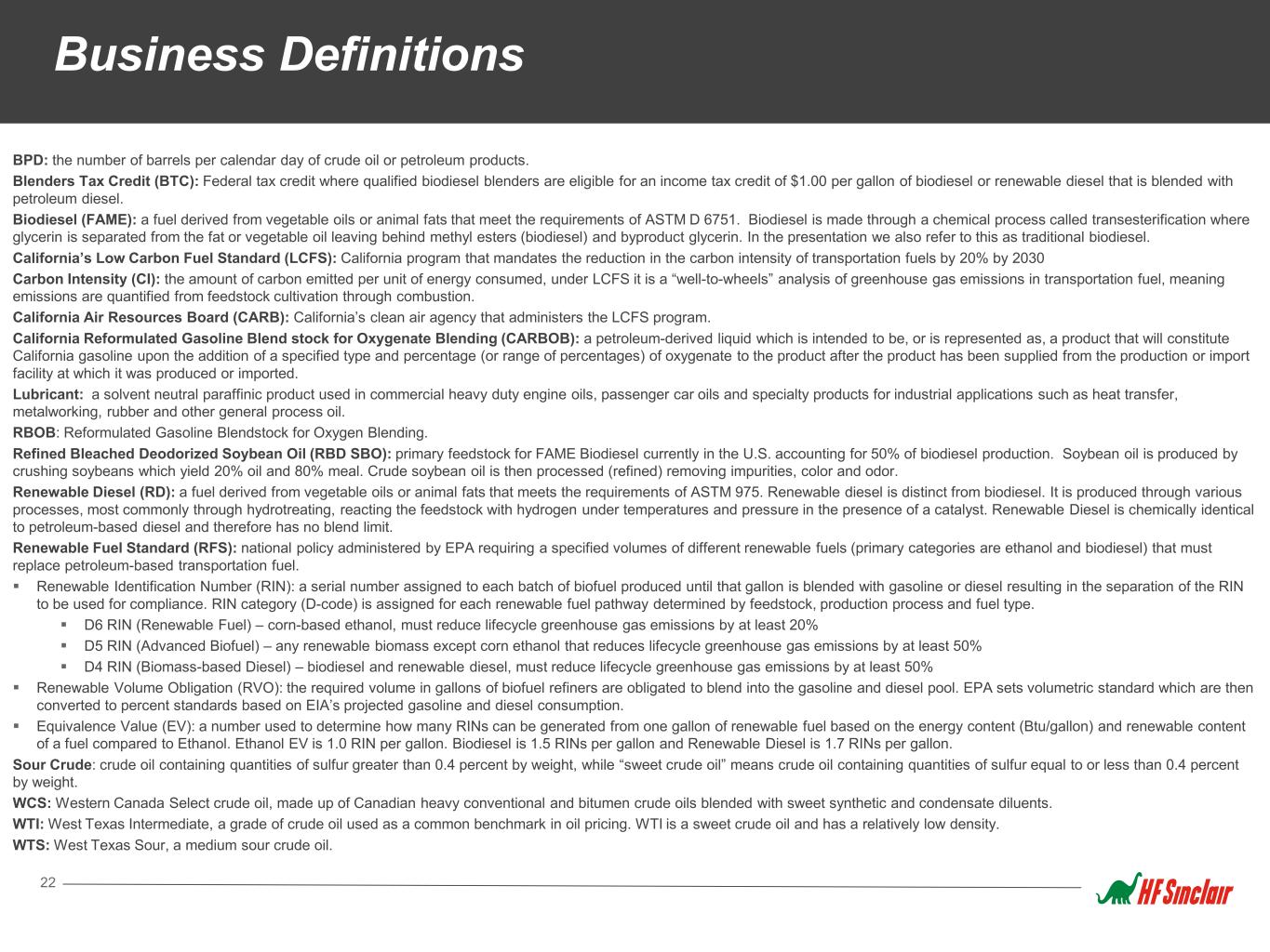 Business Definitions 22 BPD: the number of barrels per calendar day of crude oil or petroleum products. Blenders Tax Credit (BTC): Federal tax credit where qualified biodiesel blenders are eligible for an income tax credit of $1.00 per gallon of biodiesel or renewable diesel that is blended with petroleum diesel. Biodiesel (FAME): a fuel derived from vegetable oils or animal fats that meet the requirements of ASTM D 6751. Biodiesel is made through a chemical process called transesterification where glycerin is separated from the fat or vegetable oil leaving behind methyl esters (biodiesel) and byproduct glycerin. In the presentation we also refer to this as traditional biodiesel. California’s Low Carbon Fuel Standard (LCFS): California program that mandates the reduction in the carbon intensity of transportation fuels by 20% by 2030 Carbon Intensity (CI): the amount of carbon emitted per unit of energy consumed, under LCFS it is a “well-to-wheels” analysis of greenhouse gas emissions in transportation fuel, meaning emissions are quantified from feedstock cultivation through combustion. California Air Resources Board (CARB): California’s clean air agency that administers the LCFS program. California Reformulated Gasoline Blend stock for Oxygenate Blending (CARBOB): a petroleum-derived liquid which is intended to be, or is represented as, a product that will constitute California gasoline upon the addition of a specified type and percentage (or range of percentages) of oxygenate to the product after the product has been supplied from the production or import facility at which it was produced or imported. Lubricant: a solvent neutral paraffinic product used in commercial heavy duty engine oils, passenger car oils and specialty products for industrial applications such as heat transfer, metalworking, rubber and other general process oil. RBOB: Reformulated Gasoline Blendstock for Oxygen Blending. Refined Bleached Deodorized Soybean Oil (RBD SBO): primary feedstock for FAME Biodiesel currently in the U.S. accounting for 50% of biodiesel production. Soybean oil is produced by crushing soybeans which yield 20% oil and 80% meal. Crude soybean oil is then processed (refined) removing impurities, color and odor. Renewable Diesel (RD): a fuel derived from vegetable oils or animal fats that meets the requirements of ASTM 975. Renewable diesel is distinct from biodiesel. It is produced through various processes, most commonly through hydrotreating, reacting the feedstock with hydrogen under temperatures and pressure in the presence of a catalyst. Renewable Diesel is chemically identical to petroleum-based diesel and therefore has no blend limit. Renewable Fuel Standard (RFS): national policy administered by EPA requiring a specified volumes of different renewable fuels (primary categories are ethanol and biodiesel) that must replace petroleum-based transportation fuel. Renewable Identification Number (RIN): a serial number assigned to each batch of biofuel produced until that gallon is blended with gasoline or diesel resulting in the separation of the RIN to be used for compliance. RIN category (D-code) is assigned for each renewable fuel pathway determined by feedstock, production process and fuel type. D6 RIN (Renewable Fuel) – corn-based ethanol, must reduce lifecycle greenhouse gas emissions by at least 20% D5 RIN (Advanced Biofuel) – any renewable biomass except corn ethanol that reduces lifecycle greenhouse gas emissions by at least 50% D4 RIN (Biomass-based Diesel) – biodiesel and renewable diesel, must reduce lifecycle greenhouse gas emissions by at least 50% Renewable Volume Obligation (RVO): the required volume in gallons of biofuel refiners are obligated to blend into the gasoline and diesel pool. EPA sets volumetric standard which are then converted to percent standards based on EIA’s projected gasoline and diesel consumption. Equivalence Value (EV): a number used to determine how many RINs can be generated from one gallon of renewable fuel based on the energy content (Btu/gallon) and renewable content of a fuel compared to Ethanol. Ethanol EV is 1.0 RIN per gallon. Biodiesel is 1.5 RINs per gallon and Renewable Diesel is 1.7 RINs per gallon. Sour Crude: crude oil containing quantities of sulfur greater than 0.4 percent by weight, while “sweet crude oil” means crude oil containing quantities of sulfur equal to or less than 0.4 percent by weight. WCS: Western Canada Select crude oil, made up of Canadian heavy conventional and bitumen crude oils blended with sweet synthetic and condensate diluents. WTI: West Texas Intermediate, a grade of crude oil used as a common benchmark in oil pricing. WTI is a sweet crude oil and has a relatively low density. WTS: West Texas Sour, a medium sour crude oil.