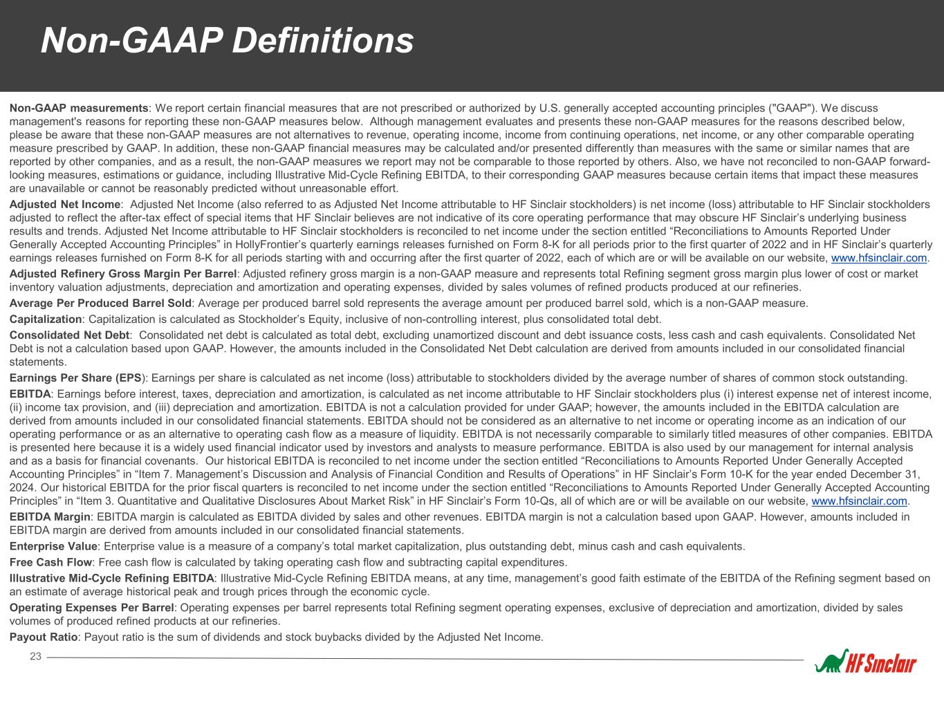 Non-GAAP Definitions Non-GAAP measurements: We report certain financial measures that are not prescribed or authorized by U.S. generally accepted accounting principles ("GAAP"). We discuss management's reasons for reporting these non-GAAP measures below. Although management evaluates and presents these non-GAAP measures for the reasons described below, please be aware that these non-GAAP measures are not alternatives to revenue, operating income, income from continuing operations, net income, or any other comparable operating measure prescribed by GAAP. In addition, these non-GAAP financial measures may be calculated and/or presented differently than measures with the same or similar names that are reported by other companies, and as a result, the non-GAAP measures we report may not be comparable to those reported by others. Also, we have not reconciled to non-GAAP forward- looking measures, estimations or guidance, including Illustrative Mid-Cycle Refining EBITDA, to their corresponding GAAP measures because certain items that impact these measures are unavailable or cannot be reasonably predicted without unreasonable effort. Adjusted Net Income: Adjusted Net Income (also referred to as Adjusted Net Income attributable to HF Sinclair stockholders) is net income (loss) attributable to HF Sinclair stockholders adjusted to reflect the after-tax effect of special items that HF Sinclair believes are not indicative of its core operating performance that may obscure HF Sinclair’s underlying business results and trends. Adjusted Net Income attributable to HF Sinclair stockholders is reconciled to net income under the section entitled “Reconciliations to Amounts Reported Under Generally Accepted Accounting Principles” in HollyFrontier’s quarterly earnings releases furnished on Form 8-K for all periods prior to the first quarter of 2022 and in HF Sinclair’s quarterly earnings releases furnished on Form 8-K for all periods starting with and occurring after the first quarter of 2022, each of which are or will be available on our website, www.hfsinclair.com. Adjusted Refinery Gross Margin Per Barrel: Adjusted refinery gross margin is a non-GAAP measure and represents total Refining segment gross margin plus lower of cost or market inventory valuation adjustments, depreciation and amortization and operating expenses, divided by sales volumes of refined products produced at our refineries. Average Per Produced Barrel Sold: Average per produced barrel sold represents the average amount per produced barrel sold, which is a non-GAAP measure. Capitalization: Capitalization is calculated as Stockholder’s Equity, inclusive of non-controlling interest, plus consolidated total debt. Consolidated Net Debt: Consolidated net debt is calculated as total debt, excluding unamortized discount and debt issuance costs, less cash and cash equivalents. Consolidated Net Debt is not a calculation based upon GAAP. However, the amounts included in the Consolidated Net Debt calculation are derived from amounts included in our consolidated financial statements. Earnings Per Share (EPS): Earnings per share is calculated as net income (loss) attributable to stockholders divided by the average number of shares of common stock outstanding. EBITDA: Earnings before interest, taxes, depreciation and amortization, is calculated as net income attributable to HF Sinclair stockholders plus (i) interest expense net of interest income, (ii) income tax provision, and (iii) depreciation and amortization. EBITDA is not a calculation provided for under GAAP; however, the amounts included in the EBITDA calculation are derived from amounts included in our consolidated financial statements. EBITDA should not be considered as an alternative to net income or operating income as an indication of our operating performance or as an alternative to operating cash flow as a measure of liquidity. EBITDA is not necessarily comparable to similarly titled measures of other companies. EBITDA is presented here because it is a widely used financial indicator used by investors and analysts to measure performance. EBITDA is also used by our management for internal analysis and as a basis for financial covenants. Our historical EBITDA is reconciled to net income under the section entitled “Reconciliations to Amounts Reported Under Generally Accepted Accounting Principles” in “Item 7. Management’s Discussion and Analysis of Financial Condition and Results of Operations” in HF Sinclair’s Form 10-K for the year ended December 31, 2024. Our historical EBITDA for the prior fiscal quarters is reconciled to net income under the section entitled “Reconciliations to Amounts Reported Under Generally Accepted Accounting Principles” in “Item 3. Quantitative and Qualitative Disclosures About Market Risk” in HF Sinclair’s Form 10-Qs, all of which are or will be available on our website, www.hfsinclair.com. EBITDA Margin: EBITDA margin is calculated as EBITDA divided by sales and other revenues. EBITDA margin is not a calculation based upon GAAP. However, amounts included in EBITDA margin are derived from amounts included in our consolidated financial statements. Enterprise Value: Enterprise value is a measure of a company’s total market capitalization, plus outstanding debt, minus cash and cash equivalents. Free Cash Flow: Free cash flow is calculated by taking operating cash flow and subtracting capital expenditures. Illustrative Mid-Cycle Refining EBITDA: Illustrative Mid-Cycle Refining EBITDA means, at any time, management’s good faith estimate of the EBITDA of the Refining segment based on an estimate of average historical peak and trough prices through the economic cycle. Operating Expenses Per Barrel: Operating expenses per barrel represents total Refining segment operating expenses, exclusive of depreciation and amortization, divided by sales volumes of produced refined products at our refineries. Payout Ratio: Payout ratio is the s