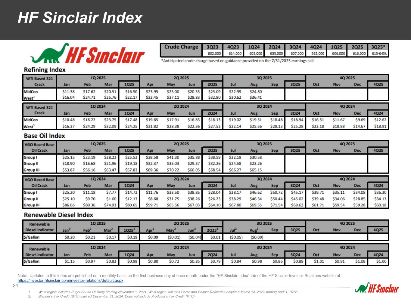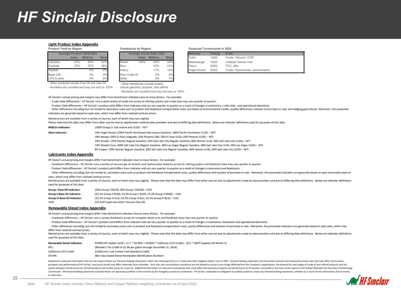 HF Sinclair Index 24 1. West region includes Puget Sound Refinery starting November 1, 2021. West region includes Parco and Casper Refineries acquired March 14, 2022 starting April 1, 2022. 2. Blender's Tax Credit (BTC) expired December 31, 2024. Does not include Producer's Tax Credit (PTC). Note: Updates to this index are published on a monthly basis on the first business day of each month under the “HF Sinclair Index” tab of the HF Sinclair Investor Relations website at https://investor.hfsinclair.com/investor-relations/default.aspx