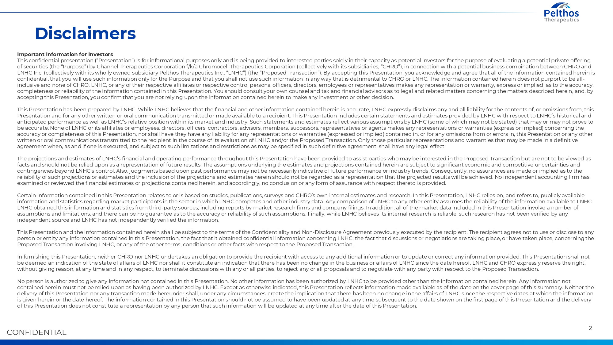 Disclaimers Important Information for Investors This confidential presentation (“Presentation”) is for informational purposes only and is being provided to interested parties solely in their capacity as potential investors for the purpose of evaluating a potential private offering of securities (the “Purpose”) by Channel Therapeutics Corporation f/k/a Chromocell Therapeutics Corporation (collectively with its subsidiaries, “CHRO”), in connection with a potential business combination between CHRO and LNHC Inc. (collectively with its wholly owned subsidiary Pelthos Therapeutics Inc., “LNHC”) (the “Proposed Transaction”). By accepting this Presentation, you acknowledge and agree that all of the information contained herein is confidential, that you will use such information only for the Purpose and that you shall not use such information in any way that is detrimental to CHRO or LNHC. The information contained herein does not purport to be allinclusive and none of CHRO, LNHC, or any of their respective affiliates or respective control persons, officers, directors, employees or representatives makes any representation or warranty, express or implied, as to the accuracy, completeness or reliability of the information contained in this Presentation. You should consult your own counsel and tax and financial advisors as to legal and related matters concerning the matters described herein, and, by accepting this Presentation, you confirm that you are not relying upon the information contained herein to make any investment or other decision. This Presentation has been prepared by LNHC. While LNHC believes that the financial and other information contained herein is accurate, LNHC expressly disclaims any and all liability for the contents of, or omissions from, this Presentation and for any other written or oral communication transmitted or made available to a recipient. This Presentation includes certain statements and estimates provided by LNHC with respect to LNHC’s historical and anticipated performance as well as LNHC’s relative position within its market and industry. Such statements and estimates reflect various assumptions by LNHC (some of which may not be stated) that may or may not prove to be accurate. None of LNHC or its affiliates or employees, directors, officers, contractors, advisors, members, successors, representatives or agents makes any representations or warranties (express or implied) concerning the accuracy or completeness of this Presentation, nor shall have they have any liability for any representations or warranties (expressed or implied) contained in, or for any omissions from or errors in, this Presentation or any other written or oral communications transmitted to the recipient in the course of its evaluation of LNHC and/or the Proposed Transaction. Only those particular representations and warranties that may be made in a definitive agreement when, as and if one is executed, and subject to such limitations and restrictions as may be specified in such definitive agreement, shall have any legal effect. The projections and estimates of LNHC’s financial and operating performance throughout this Presentation have been provided to assist parties who may be interested in the Proposed Transaction but are not to be viewed as facts and should not be relied upon as a representation of future results. The assumptions underlying the estimates and projections contained herein are subject to significant economic and competitive uncertainties and contingencies beyond LNHC’s control. Also, judgments based upon past performance may not be necessarily indicative of future performance or industry trends. Consequently, no assurances are made or implied as to the reliability of such projections or estimates and the inclusion of the projections and estimates herein should not be regarded as a representation that the projected results will be achieved. No independent accounting firm has examined or reviewed the financial estimates or projections contained herein, and accordingly, no conclusion or any form of assurance with respect thereto is provided. Certain information contained in this Presentation relates to or is based on studies, publications, surveys and CHRO’s own internal estimates and research. In this Presentation, LNHC relies on, and refers to, publicly available information and statistics regarding market participants in the sector in which LNHC competes and other industry data. Any comparison of LNHC to any other entity assumes the reliability of the information available to LNHC. LNHC obtained this information and statistics from third-party sources, including reports by market research firms and company filings. In addition, all of the market data included in this Presentation involve a number of assumptions and limitations, and there can be no guarantee as to the accuracy or reliability of such assumptions. Finally, while LNHC believes its internal research is reliable, such research has not been verified by any independent source and LNHC has not independently verified the information. This Presentation and the information contained herein shall be subject to the terms of the Confidentiality and Non-Disclosure Agreement previously executed by the recipient. The recipient agrees not to use or disclose to any person or entity any information contained in this Presentation, the fact that it obtained confidential information concerning LNHC, the fact that discussions or negotiations are taking place, or have taken place, concerning the Proposed Transaction involving LNHC, or any of the other terms, conditions or other facts with respect to the Proposed Transaction. In furnishing this Presentation, neither CHRO nor LNHC undertakes an obligation to provide the recipient with access to any additional information or to update or correct any information provided. This Presentation shall not be deemed an indication of the state of affairs of LNHC nor sha