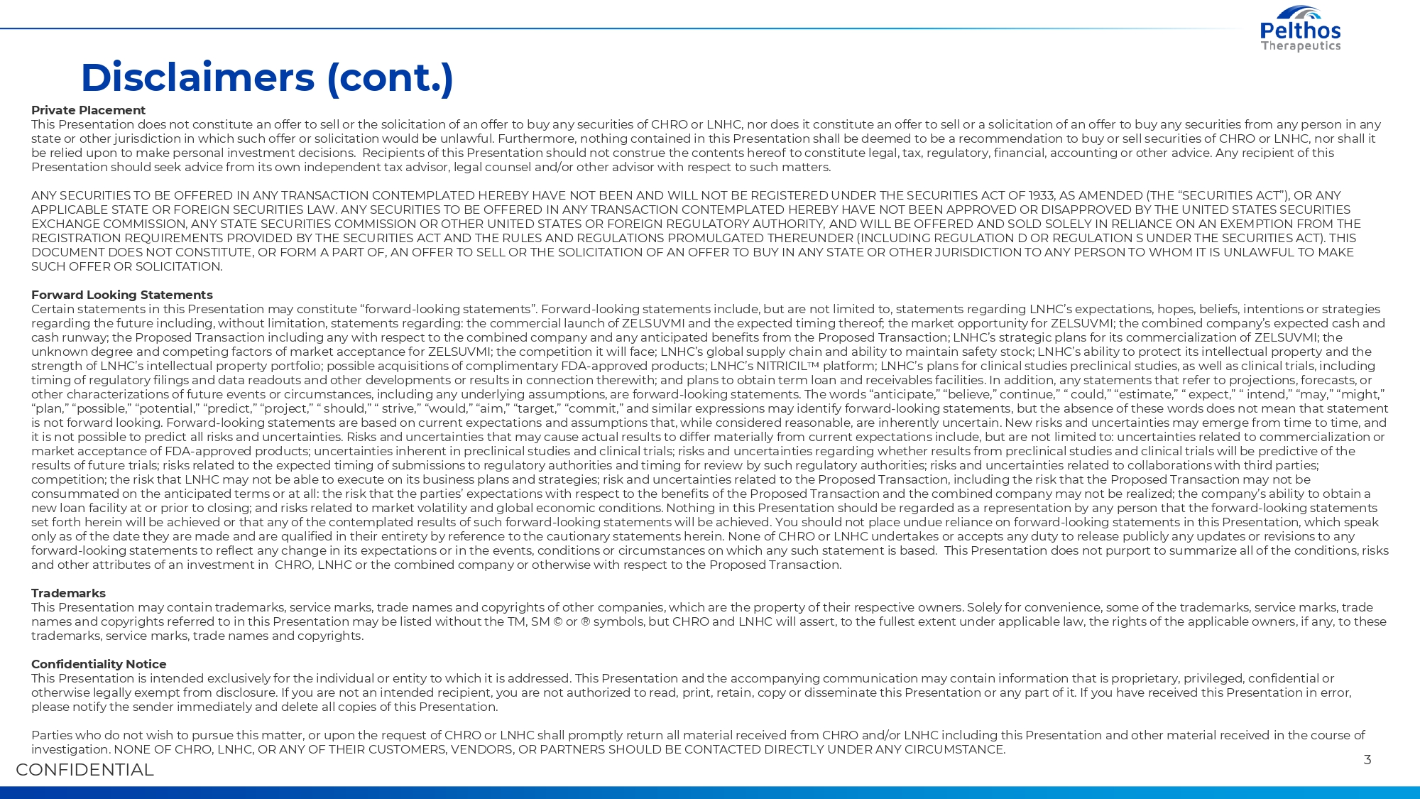 Disclaimers (cont.) Private Placement This Presentation does not constitute an offer to sell or the solicitation of an offer to buy any securities of CHRO or LNHC, nor does it constitute an offer to sell or a solicitation of an offer to buy any securities from any person in any state or other jurisdiction in which such offer or solicitation would be unlawful. Furthermore, nothing contained in this Presentation shall be deemed to be a recommendation to buy or sell securities of CHRO or LNHC, nor shall it be relied upon to make personal investment decisions. Recipients of this Presentation should not construe the contents hereof to constitute legal, tax, regulatory, financial, accounting or other advice. Any recipient of this Presentation should seek advice from its own independent tax advisor, legal counsel and/or other advisor with respect to such matters. ANY SECURITIES TO BE OFFERED IN ANY TRANSACTION CONTEMPLATED HEREBY HAVE NOT BEEN AND WILL NOT BE REGISTERED UNDER THE SECURITIES ACT OF 1933, AS AMENDED (THE “SECURITIES ACT”), OR ANY APPLICABLE STATE OR FOREIGN SECURITIES LAW. ANY SECURITIES TO BE OFFERED IN ANY TRANSACTION CONTEMPLATED HEREBY HAVE NOT BEEN APPROVED OR DISAPPROVED BY THE UNITED STATES SECURITIES EXCHANGE COMMISSION, ANY STATE SECURITIES COMMISSION OR OTHER UNITED STATES OR FOREIGN REGULATORY AUTHORITY, AND WILL BE OFFERED AND SOLD SOLELY IN RELIANCE ON AN EXEMPTION FROM THE REGISTRATION REQUIREMENTS PROVIDED BY THE SECURITIES ACT AND THE RULES AND REGULATIONS PROMULGATED THEREUNDER (INCLUDING REGULATION D OR REGULATION S UNDER THE SECURITIES ACT). THIS DOCUMENT DOES NOT CONSTITUTE, OR FORM A PART OF, AN OFFER TO SELL OR THE SOLICITATION OF AN OFFER TO BUY IN ANY STATE OR OTHER JURISDICTION TO ANY PERSON TO WHOM IT IS UNLAWFUL TO MAKE SUCH OFFER OR SOLICITATION. Forward Looking Statements Certain statements in this Presentation may constitute “forward-looking statements”. Forward-looking statements include, but are not limited to, statements regarding LNHC’s expectations, hopes, beliefs, intentions or strategies regarding the future including, without limitation, statements regarding: the commercial launch of ZELSUVMI and the expected timing thereof; the market opportunity for ZELSUVMI; the combined company’s expected cash and cash runway; the Proposed Transaction including any with respect to the combined company and any anticipated benefits from the Proposed Transaction; LNHC’s strategic plans for its commercialization of ZELSUVMI; the unknown degree and competing factors of market acceptance for ZELSUVMI; the competition it will face; LNHC’s global supply chain and ability to maintain safety stock; LNHC’s ability to protect its intellectual property and the strength of LNHC’s intellectual property portfolio; possible acquisitions of complimentary FDA-approved products; LNHC’s NITRICIL platform; LNHC’s plans for clinical studies preclinical studies, as well as clinical trials, including timing of regulatory filings and data readouts and other developments or results in connection therewith; and plans to obtain term loan and receivables facilities. In addition, any statements that refer to projections, forecasts, or other characterizations of future events or circumstances, including any underlying assumptions, are forward-looking statements. The words “anticipate,” “believe,” continue,” “ could,” “estimate,” “ expect,” “ intend,” “may,” “might,” “plan,” “possible,” “potential,” “predict,” “project,” “ should,” “ strive,” “would,” “aim,” “target,” “commit,” and similar expressions may identify forward-looking statements, but the absence of these words does not mean that statement is not forward looking. Forward-looking statements are based on current expectations and assumptions that, while considered reasonable, are inherently uncertain. New risks and uncertainties may emerge from time to time, and it is not possible to predict all risks and uncertainties. Risks and uncertainties that may cause actual results to differ materially from current expectations include, but are not limited to: uncertainties related to commercialization or market acceptance of FDA-approved products; uncertainties inherent in preclinical studies and clinical trials; risks and uncertainties regarding whether results from preclinical studies and clinical trials will be predictive of the results of future trials; risks related to the expected timing of submissions to regulatory authorities and timing for review by such regulatory authorities; risks and uncertainties related to collaborations with third parties; competition; the risk that LNHC may not be able to execute on its business plans and strategies; risk and uncertainties related to the Proposed Transaction, including the risk that the Proposed Transaction may not be consummated on the anticipated terms or at all: the risk that the parties’ expectations with respect to the benefits of the Proposed Transaction and the combined company may not be realized; the company’s ability to obtain a new loan facility at or prior to closing; and risks related to market volatility and global economic conditions. Nothing in this Presentation should be regarded as a representation by any person that the forward-looking statements set forth herein will be achieved or that any of the contemplated results of such forward-looking statements will be achieved. You should not place undue reliance on forward-looking statements in this Presentation, which speak only as of the date they are made and are qualified in their entirety by reference to the cautionary statements herein. None of CHRO or LNHC undertakes or accepts any duty to release publicly any updates or revisions to any forward-looking statements to reflect any change in its expectations or in the events, conditions or circumstances on which any such statement is based. This Presentation does not
