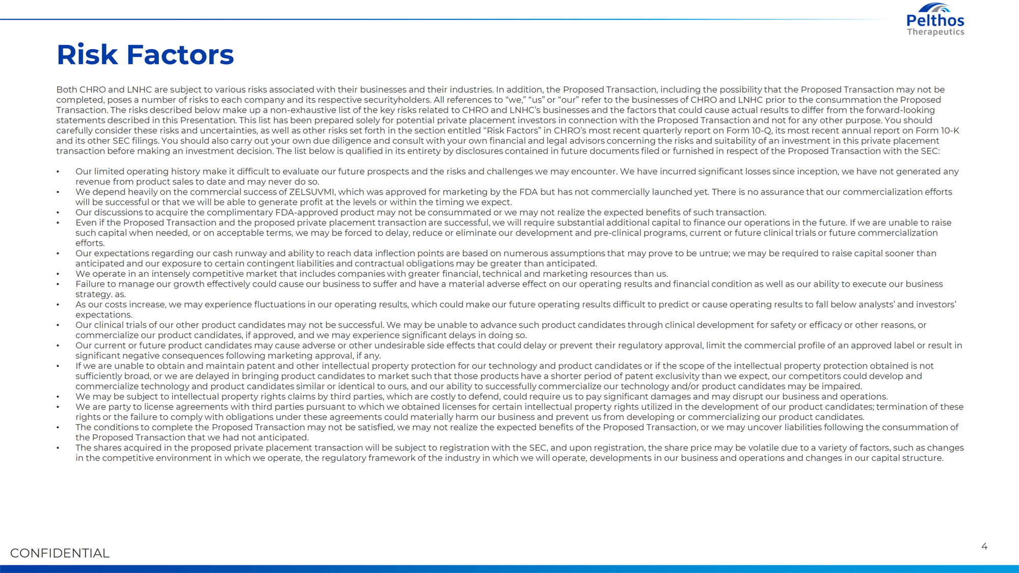 Risk Factors Both CHRO and LNHC are subject to various risks associated with their businesses and their industries. In addition, the Proposed Transaction, including the possibility that the Proposed Transaction may not be completed, poses a number of risks to each company and its respective securityholders. All references to “we,” “us” or “our” refer to the businesses of CHRO and LNHC prior to the consummation the Proposed Transaction. The risks described below make up a non-exhaustive list of the key risks related to CHRO and LNHC’s businesses and the factors that could cause actual results to differ from the forward-looking statements described in this Presentation. This list has been prepared solely for potential private placement investors in connection with the Proposed Transaction and not for any other purpose. You should carefully consider these risks and uncertainties, as well as other risks set forth in the section entitled “Risk Factors” in CHRO’s most recent quarterly report on Form 10-Q, its most recent annual report on Form 10-K and its other SEC filings. You should also carry out your own due diligence and consult with your own financial and legal advisors concerning the risks and suitability of an investment in this private placement transaction before making an investment decision. The list below is qualified in its entirety by disclosures contained in future documents filed or furnished in respect of the Proposed Transaction with the SEC: • • • • • • • • • • • • • • • Our limited operating history make it difficult to evaluate our future prospects and the risks and challenges we may encounter. We have incurred significant losses since inception, we have not generated any revenue from product sales to date and may never do so. We depend heavily on the commercial success of ZELSUVMI, which was approved for marketing by the FDA but has not commercially launched yet. There is no assurance that our commercialization efforts will be successful or that we will be able to generate profit at the levels or within the timing we expect. Our discussions to acquire the complimentary FDA-approved product may not be consummated or we may not realize the expected benefits of such transaction. Even if the Proposed Transaction and the proposed private placement transaction are successful, we will require substantial additional capital to finance our operations in the future. If we are unable to raise such capital when needed, or on acceptable terms, we may be forced to delay, reduce or eliminate our development and pre-clinical programs, current or future clinical trials or future commercialization efforts. Our expectations regarding our cash runway and ability to reach data inflection points are based on numerous assumptions that may prove to be untrue; we may be required to raise capital sooner than anticipated and our exposure to certain contingent liabilities and contractual obligations may be greater than anticipated. We operate in an intensely competitive market that includes companies with greater financial, technical and marketing resources than us. Failure to manage our growth effectively could cause our business to suffer and have a material adverse effect on our operating results and financial condition as well as our ability to execute our business strategy. as. As our costs increase, we may experience fluctuations in our operating results, which could make our future operating results difficult to predict or cause operating results to fall below analysts’ and investors’ expectations. Our clinical trials of our other product candidates may not be successful. We may be unable to advance such product candidates through clinical development for safety or efficacy or other reasons, or commercialize our product candidates, if approved, and we may experience significant delays in doing so. Our current or future product candidates may cause adverse or other undesirable side effects that could delay or prevent their regulatory approval, limit the commercial profile of an approved label or result in significant negative consequences following marketing approval, if any. If we are unable to obtain and maintain patent and other intellectual property protection for our technology and product candidates or if the scope of the intellectual property protection obtained is not sufficiently broad, or we are delayed in bringing product candidates to market such that those products have a shorter period of patent exclusivity than we expect, our competitors could develop and commercialize technology and product candidates similar or identical to ours, and our ability to successfully commercialize our technology and/or product candidates may be impaired. We may be subject to intellectual property rights claims by third parties, which are costly to defend, could require us to pay significant damages and may disrupt our business and operations. We are party to license agreements with third parties pursuant to which we obtained licenses for certain intellectual property rights utilized in the development of our product candidates; termination of these rights or the failure to comply with obligations under these agreements could materially harm our business and prevent us from developing or commercializing our product candidates. The conditions to complete the Proposed Transaction may not be satisfied, we may not realize the expected benefits of the Proposed Transaction, or we may uncover liabilities following the consummation of the Proposed Transaction that we had not anticipated. The shares acquired in the proposed private placement transaction will be subject to registration with the SEC, and upon registration, the share price may be volatile due to a variety of factors, such as changes in the competitive environment in which we operate, the regulatory framework of the industry in which we will operate, developments in our business and operation