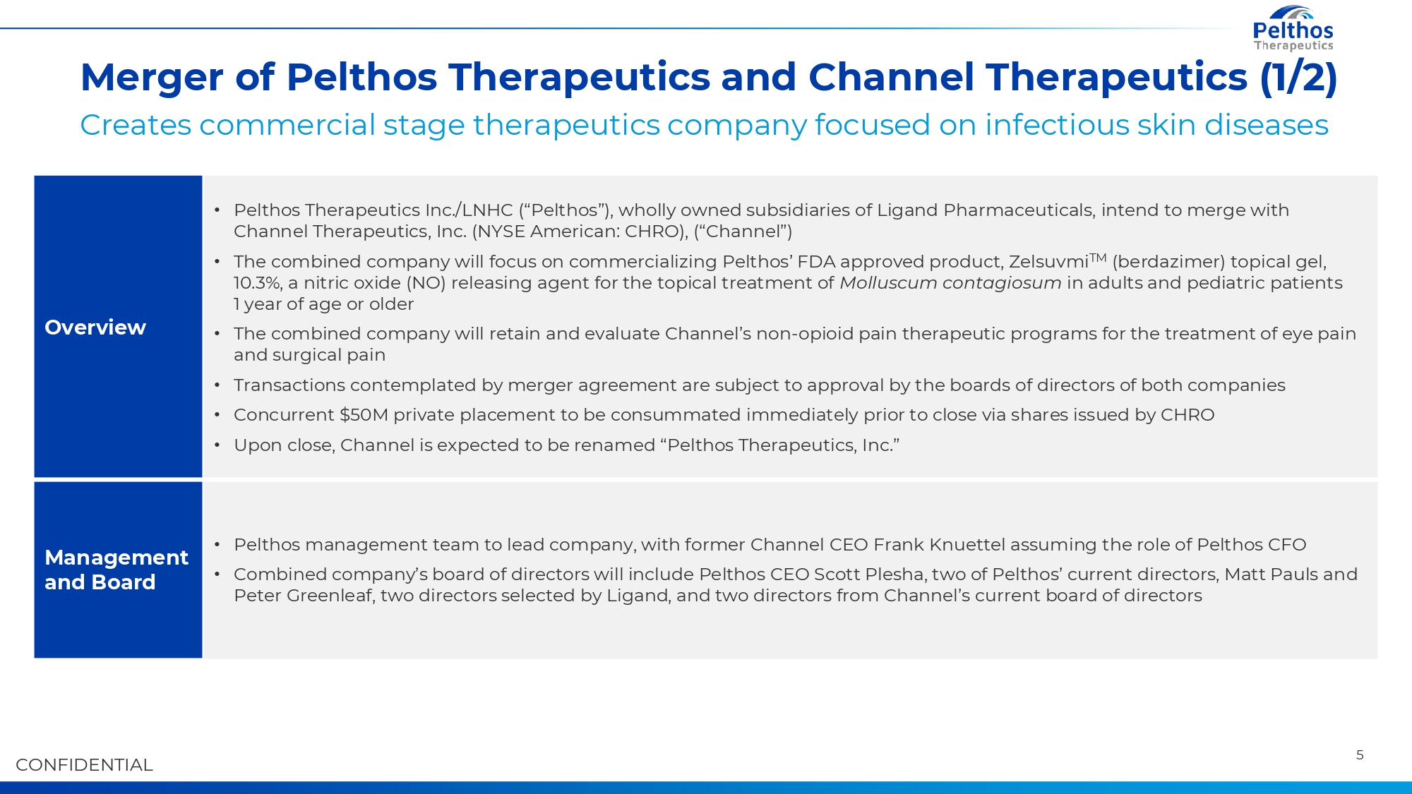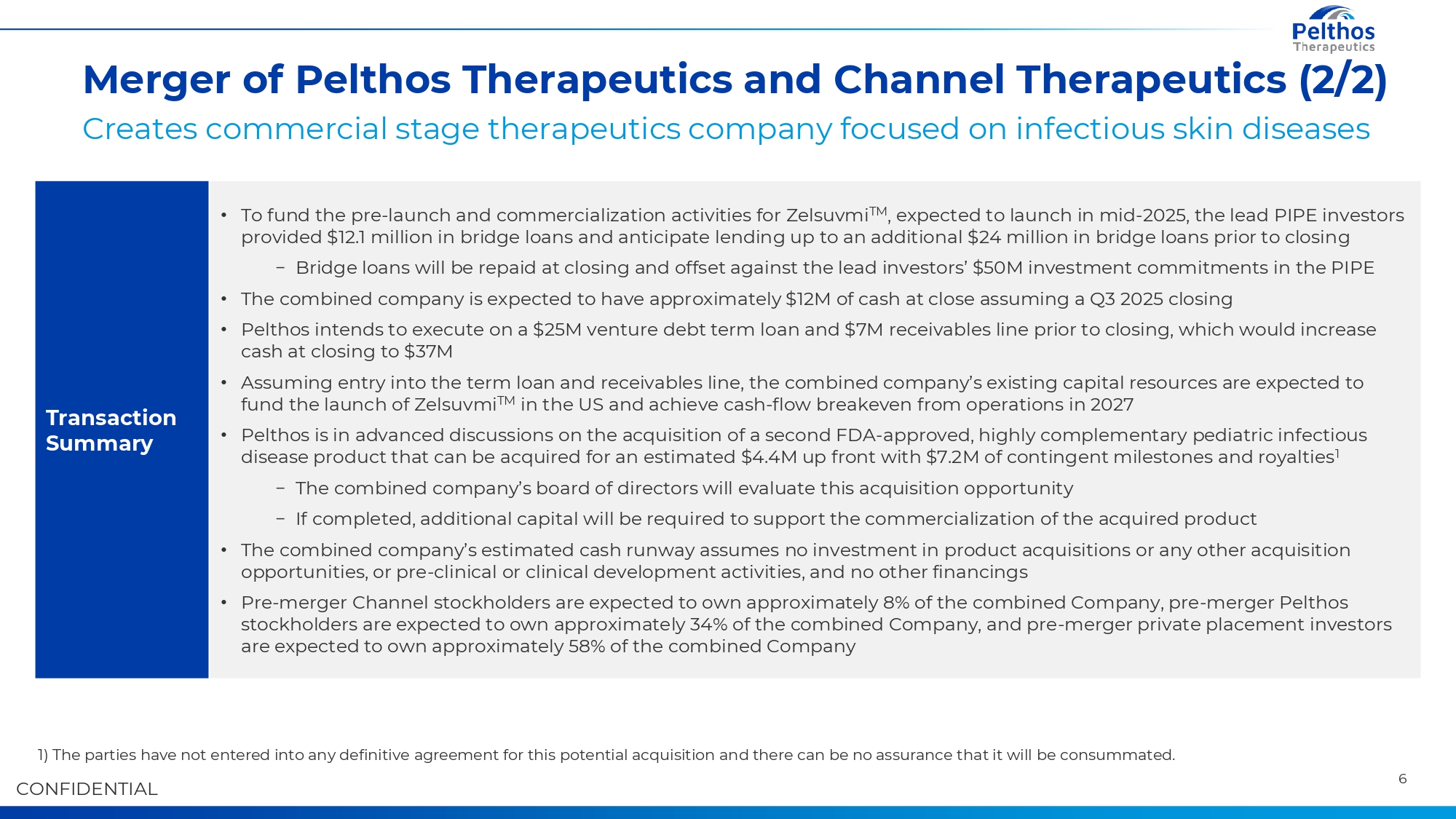 Merger of Pelthos Therapeutics and Channel Therapeutics (1/2) Creates commercial stage therapeutics company focused on infectious skin diseases • Pelthos Therapeutics Inc./LNHC (“Pelthos”), wholly owned subsidiaries of Ligand Pharmaceuticals, intend to merge with Channel Therapeutics, Inc. (NYSE American: CHRO), (“Channel”) • The combined company will focus on commercializing Pelthos’ FDA approved product, ZelsuvmiTM (berdazimer) topical gel, 10.3%, a nitric oxide (NO) releasing agent for the topical treatment of Molluscum contagiosum in adults and pediatric patients 1 year of age or older Overview • The combined company will retain and evaluate Channel’s non-opioid pain therapeutic programs for the treatment of eye pain and surgical pain • Transactions contemplated by merger agreement are subject to approval by the boards of directors of both companies • Concurrent $50M private placement to be consummated immediately prior to close via shares issued by CHRO • Upon close, Channel is expected to be renamed “Pelthos Therapeutics, Inc.” Management and Board CONFIDENTIAL • Pelthos management team to lead company, with former Channel CEO Frank Knuettel assuming the role of Pelthos CFO • Combined company’s board of directors will include Pelthos CEO Scott Plesha, two of Pelthos’ current directors, Matt Pauls and Peter Greenleaf, two directors selected by Ligand, and two directors from Channel’s current board of directors 5