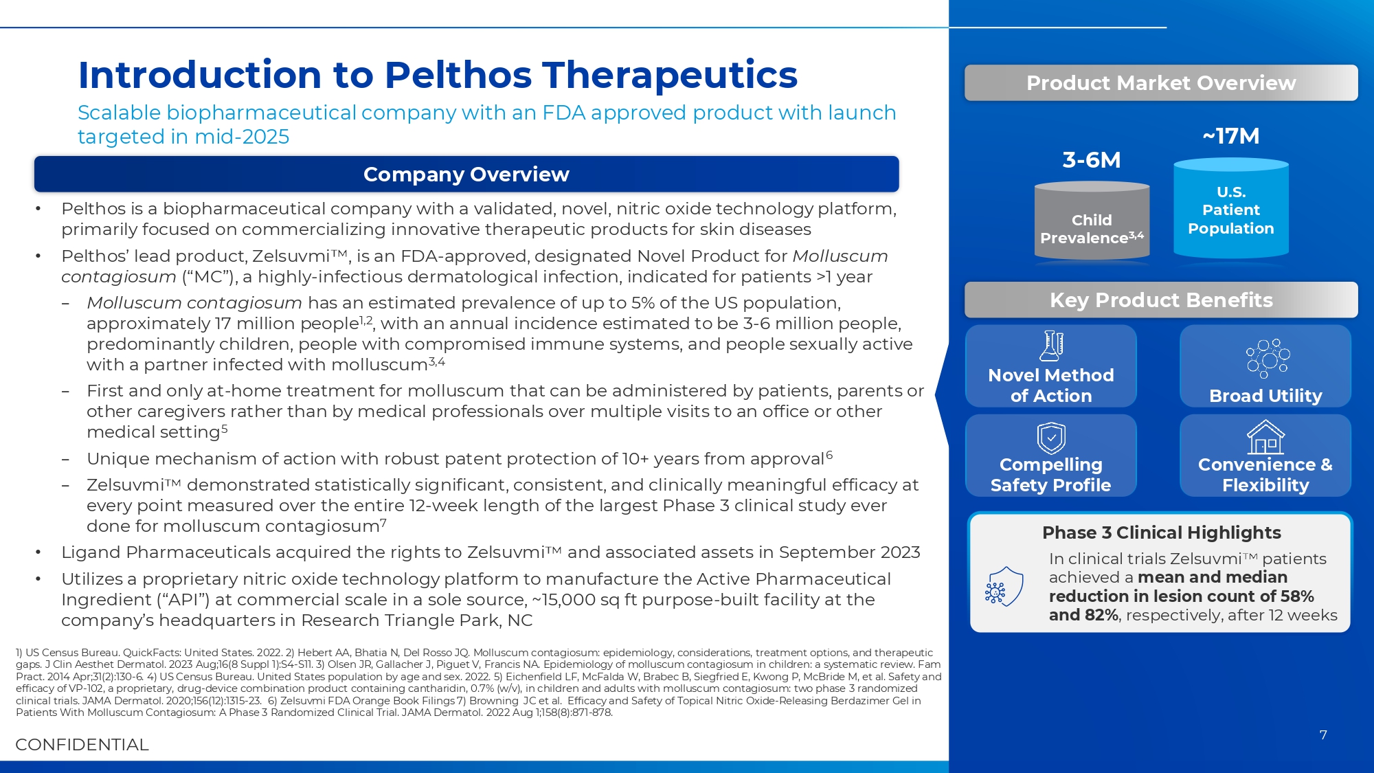 Merger of Pelthos Therapeutics and Channel Therapeutics (2/2) Creates commercial stage therapeutics company focused on infectious skin diseases • To fund the pre-launch and commercialization activities for ZelsuvmiTM, expected to launch in mid-2025, the lead PIPE investors provided $12.1 million in bridge loans and anticipate lending up to an additional $24 million in bridge loans prior to closing − Bridge loans will be repaid at closing and offset against the lead investors’ $50M investment commitments in the PIPE • The combined company is expected to have approximately $12M of cash at close assuming a Q3 2025 closing • Pelthos intends to execute on a $25M venture debt term loan and $7M receivables line prior to closing, which would increase cash at closing to $37M Transaction Summary • Assuming entry into the term loan and receivables line, the combined company’s existing capital resources are expected to fund the launch of ZelsuvmiTM in the US and achieve cash-flow breakeven from operations in 2027 • Pelthos is in advanced discussions on the acquisition of a second FDA-approved, highly complementary pediatric infectious disease product that can be acquired for an estimated $4.4M up front with $7.2M of contingent milestones and royalties 1 − The combined company’s board of directors will evaluate this acquisition opportunity − If completed, additional capital will be required to support the commercialization of the acquired product • The combined company’s estimated cash runway assumes no investment in product acquisitions or any other acquisition opportunities, or pre-clinical or clinical development activities, and no other financings • Pre-merger Channel stockholders are expected to own approximately 8% of the combined Company, pre-merger Pelthos stockholders are expected to own approximately 34% of the combined Company, and pre-merger private placement investors are expected to own approximately 58% of the combined Company 1) The parties have not entered into any definitive agreement for this potential acquisition and there can be no assurance that it will be consummated. CONFIDENTIAL 6