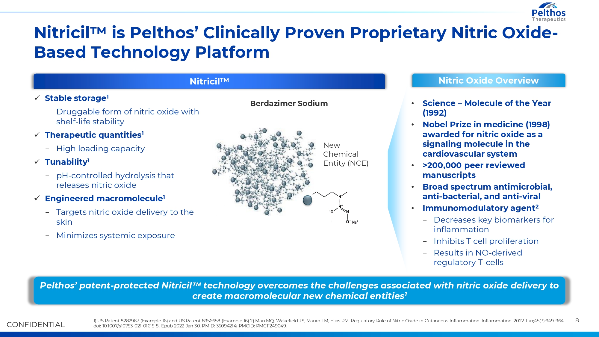 Nitricil is Pelthos’ Clinically Proven Proprietary Nitric OxideBased Technology Platform Nitric Oxide Overview NitricilTM ✓ Stable storage1 − Druggable form of nitric oxide with shelf-life stability ✓ Therapeutic Berdazimer Sodium • • quantities1 New Chemical Entity (NCE) − High loading capacity ✓ Tunability1 − pH-controlled hydrolysis that releases nitric oxide • • ✓ Engineered macromolecule1 − Targets nitric oxide delivery to the skin − Minimizes systemic exposure Pelthos’ patent-protected Nitricil CONFIDENTIAL • Science – Molecule of the Year (1992) Nobel Prize in medicine (1998) awarded for nitric oxide as a signaling molecule in the cardiovascular system >200,000 peer reviewed manuscripts Broad spectrum antimicrobial, anti-bacterial, and anti-viral Immunomodulatory agent2 − Decreases key biomarkers for inflammation − Inhibits T cell proliferation − Results in NO-derived regulatory T-cells technology overcomes the challenges associated with nitric oxide delivery to create macromolecular new chemical entities1 1) US Patent 8282967 (Example 16) and US Patent 8956658 (Example 16) 2) Man MQ, Wakefield JS, Mauro TM, Elias PM. Regulatory Role of Nitric Oxide in Cutaneous Inflammation. Inflammation. 2022 Jun;45(3):949-964. doi: 10.1007/s10753-021-01615-8. Epub 2022 Jan 30. PMID: 35094214; PMCID: PMC11249049. 8