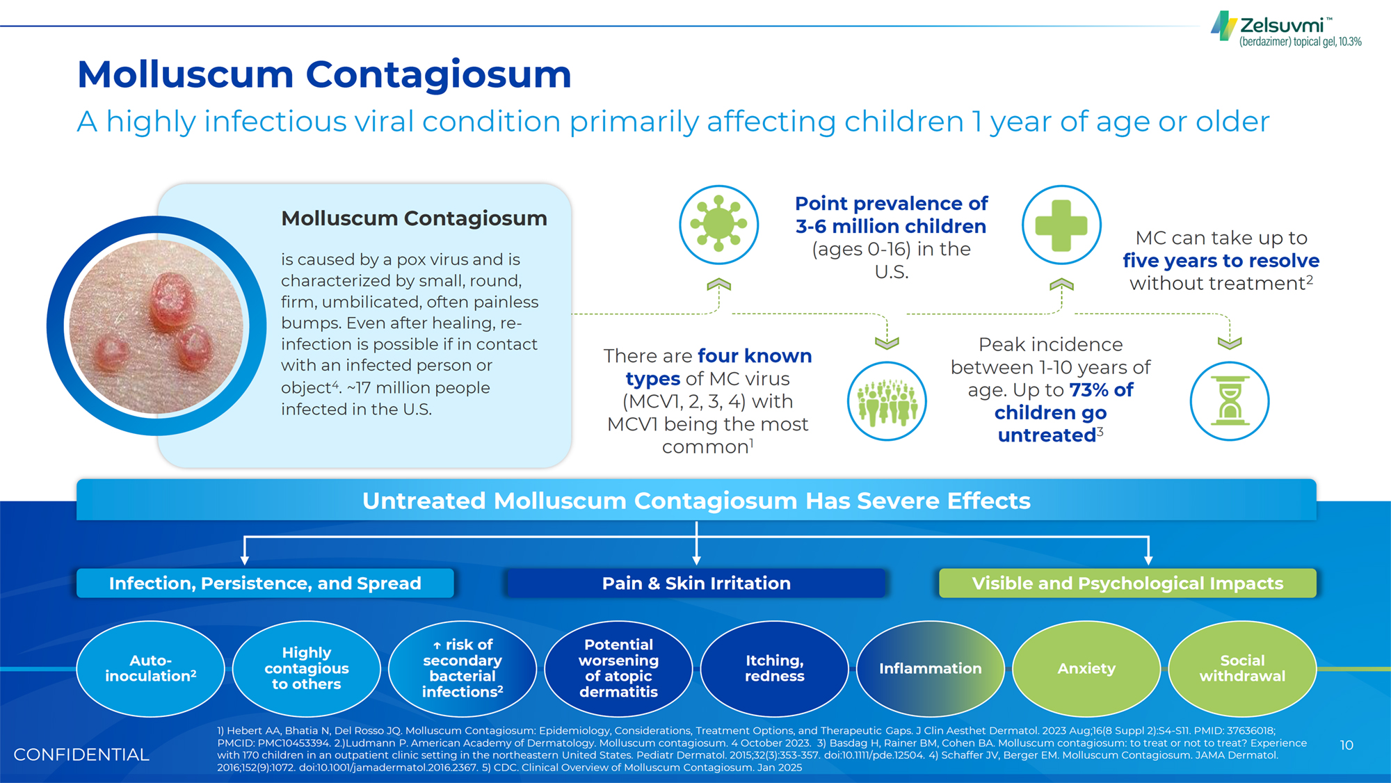 Molluscum Contagiosum A highly infectious viral condition primarily affecting children 1 year of age or older Point prevalence of 3-6 million children (ages 0-16) in the U.S. Molluscum Contagiosum is caused by a pox virus and is characterized by small, round, firm, umbilicated, often painless bumps. Even after healing, reinfection is possible if in contact with an infected person or object4. ~17 million people infected in the U.S. There are four known types of MC virus (MCV1, 2, 3, 4) with MCV1 being the most common1 MC can take up to five years to resolve without treatment2 Peak incidence between 1-10 years of age. Up to 73% of children go untreated3 Untreated Molluscum Contagiosum Has Severe Effects Infection, Persistence, and Spread Autoinoculation2 CONFIDENTIAL Highly contagious to others Pain & Skin Irritation ↑ risk of secondary bacterial infections2 Potential worsening of atopic dermatitis Itching, redness Visible and Psychological Impacts Inflammation Anxiety Social withdrawal 1) Hebert AA, Bhatia N, Del Rosso JQ. Molluscum Contagiosum: Epidemiology, Considerations, Treatment Options, and Therapeutic Gaps. J Clin Aesthet Dermatol. 2023 Aug;16(8 Suppl 2):S4-S11. PMID: 37636018; PMCID: PMC10453394. 2.)Ludmann P. American Academy of Dermatology. Molluscum contagiosum. 4 October 2023. 3) Basdag H, Rainer BM, Cohen BA. Molluscum contagiosum: to treat or not to treat? Experience with 170 children in an outpatient clinic setting in the northeastern United States. Pediatr Dermatol. 2015;32(3):353-357. doi:10.1111/pde.12504. 4) Schaffer JV, Berger EM. Molluscum Contagiosum. JAMA Dermatol. 2016;152(9):1072. doi:10.1001/jamadermatol.2016.2367. 5) CDC. Clinical Overview of Molluscum Contagiosum. Jan 2025 10