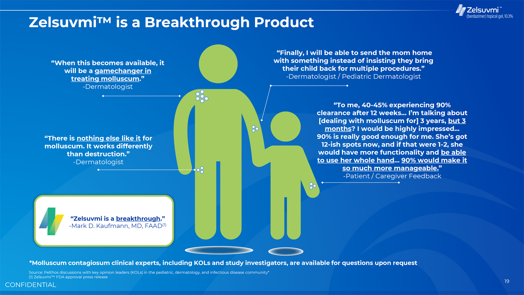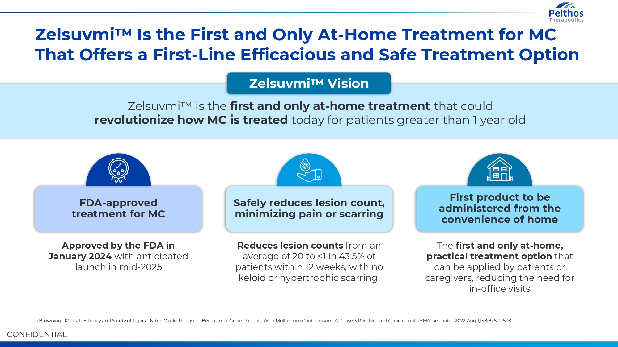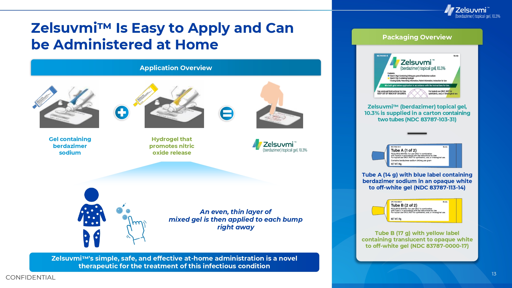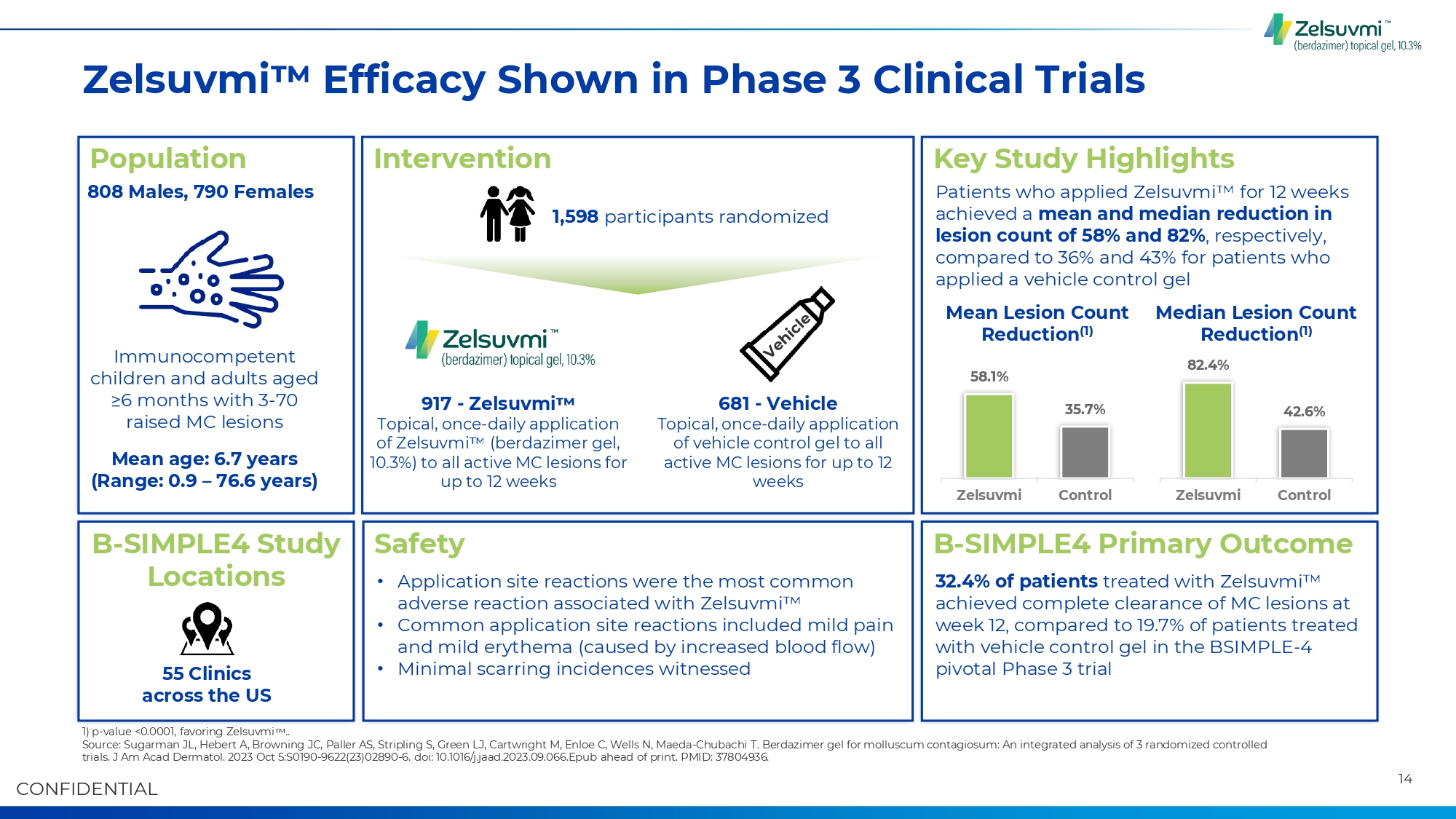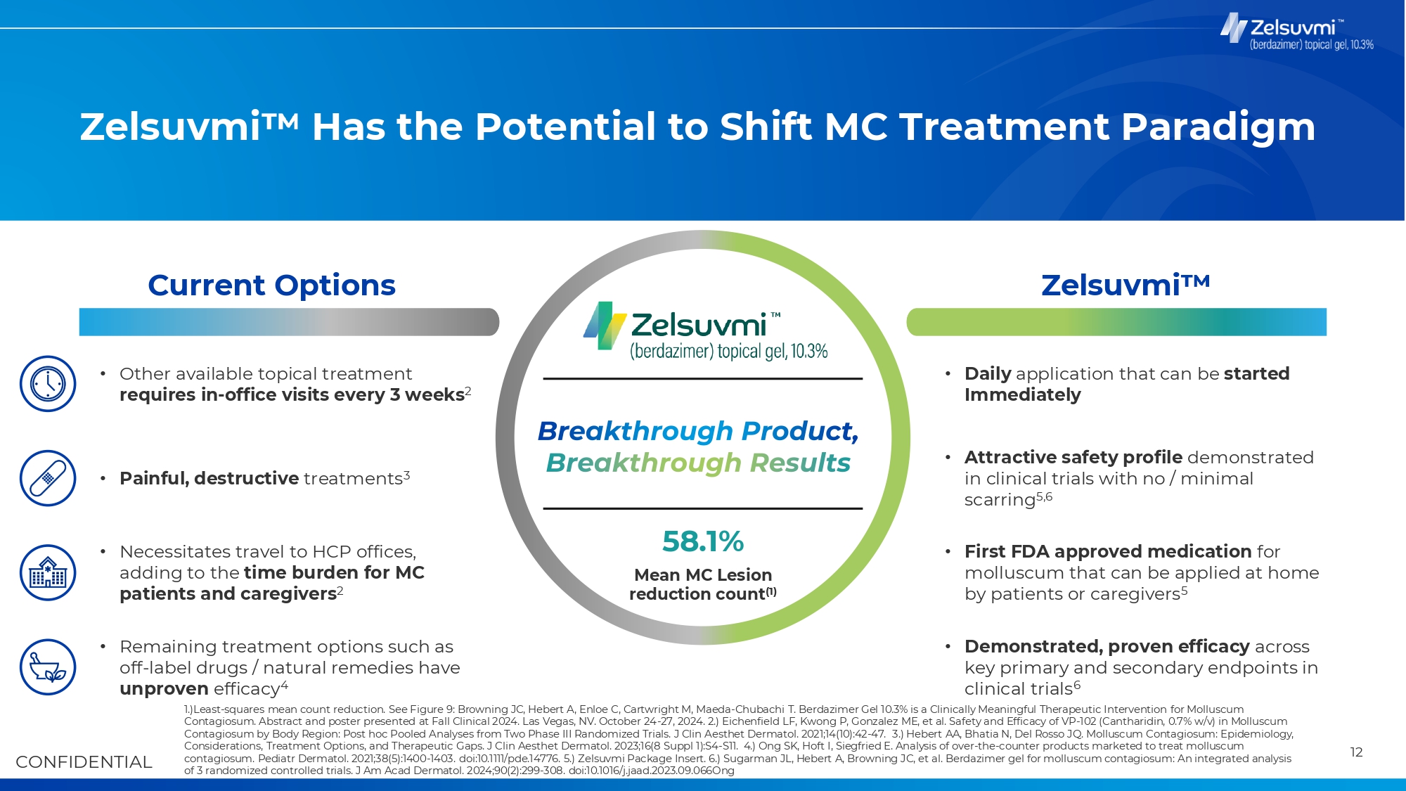 Zelsuvmi Has the Potential to Shift MC Treatment Paradigm Current Options Zelsuvmi • Other available topical treatment requires in-office visits every 3 weeks2 • Painful, destructive treatments3 • Necessitates travel to HCP offices, adding to the time burden for MC patients and caregivers2 • Remaining treatment options such as off-label drugs / natural remedies have unproven efficacy4 CONFIDENTIAL • Daily application that can be started Immediately Breakthrough Product, Breakthrough Results 58.1% Mean MC Lesion reduction count(1) • Attractive safety profile demonstrated in clinical trials with no / minimal scarring5,6 • First FDA approved medication for molluscum that can be applied at home by patients or caregivers5 • Demonstrated, proven efficacy across key primary and secondary endpoints in clinical trials6 1.)Least-squares mean count reduction. See Figure 9: Browning JC, Hebert A, Enloe C, Cartwright M, Maeda-Chubachi T. Berdazimer Gel 10.3% is a Clinically Meaningful Therapeutic Intervention for Molluscum Contagiosum. Abstract and poster presented at Fall Clinical 2024. Las Vegas, NV. October 24-27, 2024. 2.) Eichenfield LF, Kwong P, Gonzalez ME, et al. Safety and Efficacy of VP-102 (Cantharidin, 0.7% w/v) in Molluscum Contagiosum by Body Region: Post hoc Pooled Analyses from Two Phase III Randomized Trials. J Clin Aesthet Dermatol. 2021;14(10):42-47. 3.) Hebert AA, Bhatia N, Del Rosso JQ. Molluscum Contagiosum: Epidemiology, Considerations, Treatment Options, and Therapeutic Gaps. J Clin Aesthet Dermatol. 2023;16(8 Suppl 1):S4-S11. 4.) Ong SK, Hoft I, Siegfried E. Analysis of over-the-counter products marketed to treat molluscum contagiosum. Pediatr Dermatol. 2021;38(5):1400-1403. doi:10.1111/pde.14776. 5.) Zelsuvmi Package Insert. 6.) Sugarman JL, Hebert A, Browning JC, et al. Berdazimer gel for molluscum contagiosum: An integrated analysis of 3 randomized controlled trials. J Am Acad Dermatol. 2024;90(2):299-308. doi:10.1016/j.jaad.2023.09.066Ong 12