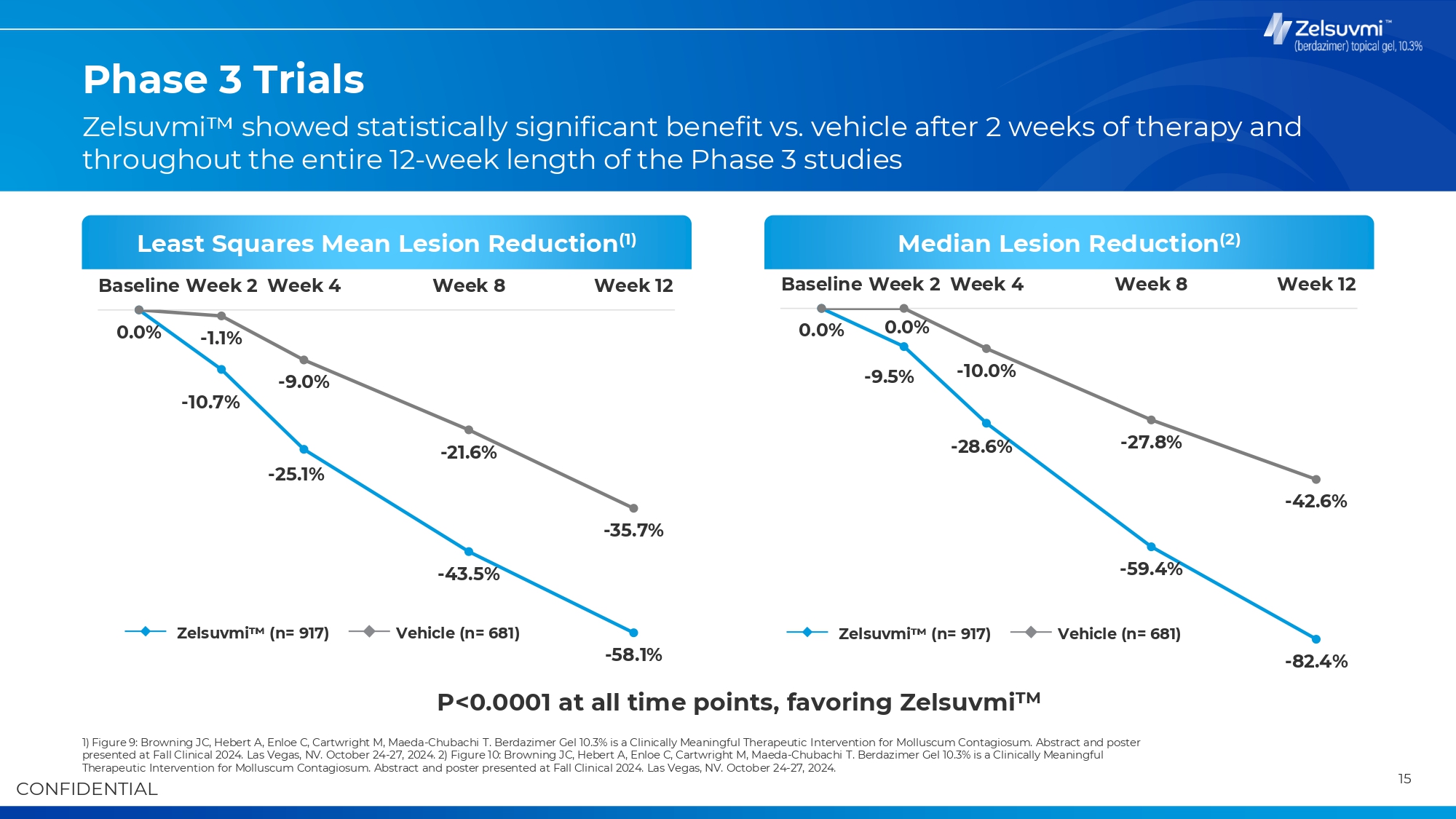Zelsuvmi Efficacy Shown in Phase 3 Clinical Trials Population Intervention Key Study Highlights 808 Males, 790 Females 1,598 participants randomized Immunocompetent children and adults aged ≥6 months with 3-70 raised MC lesions Mean age: 6.7 years (Range: 0.9 – 76.6 years) B-SIMPLE4 Study Locations 55 Clinics across the US Patients who applied Zelsuvmi for 12 weeks achieved a mean and median reduction in lesion count of 58% and 82%, respectively, compared to 36% and 43% for patients who applied a vehicle control gel Mean Lesion Count Reduction(1) 82.4% 58.1% 917 - Zelsuvmi Topical, once-daily application of Zelsuvmi (berdazimer gel, 10.3%) to all active MC lesions for up to 12 weeks 681 - Vehicle Topical, once-daily application of vehicle control gel to all active MC lesions for up to 12 weeks Median Lesion Count Reduction(1) 35.7% Zelsuvmi Control 42.6% Zelsuvmi Control Safety B-SIMPLE4 Primary Outcome • Application site reactions were the most common adverse reaction associated with Zelsuvmi • Common application site reactions included mild pain and mild erythema (caused by increased blood flow) • Minimal scarring incidences witnessed 32.4% of patients treated with Zelsuvmi achieved complete clearance of MC lesions at week 12, compared to 19.7% of patients treated with vehicle control gel in the BSIMPLE-4 pivotal Phase 3 trial 1) p-value <0.0001, favoring Zelsuvmi .. Source: Sugarman JL, Hebert A, Browning JC, Paller AS, Stripling S, Green LJ, Cartwright M, Enloe C, Wells N, Maeda-Chubachi T. Berdazimer gel for molluscum contagiosum: An integrated analysis of 3 randomized controlled trials. J Am Acad Dermatol. 2023 Oct 5:S0190-9622(23)02890-6. doi: 10.1016/j.jaad.2023.09.066.Epub ahead of print. PMID: 37804936. CONFIDENTIAL 14