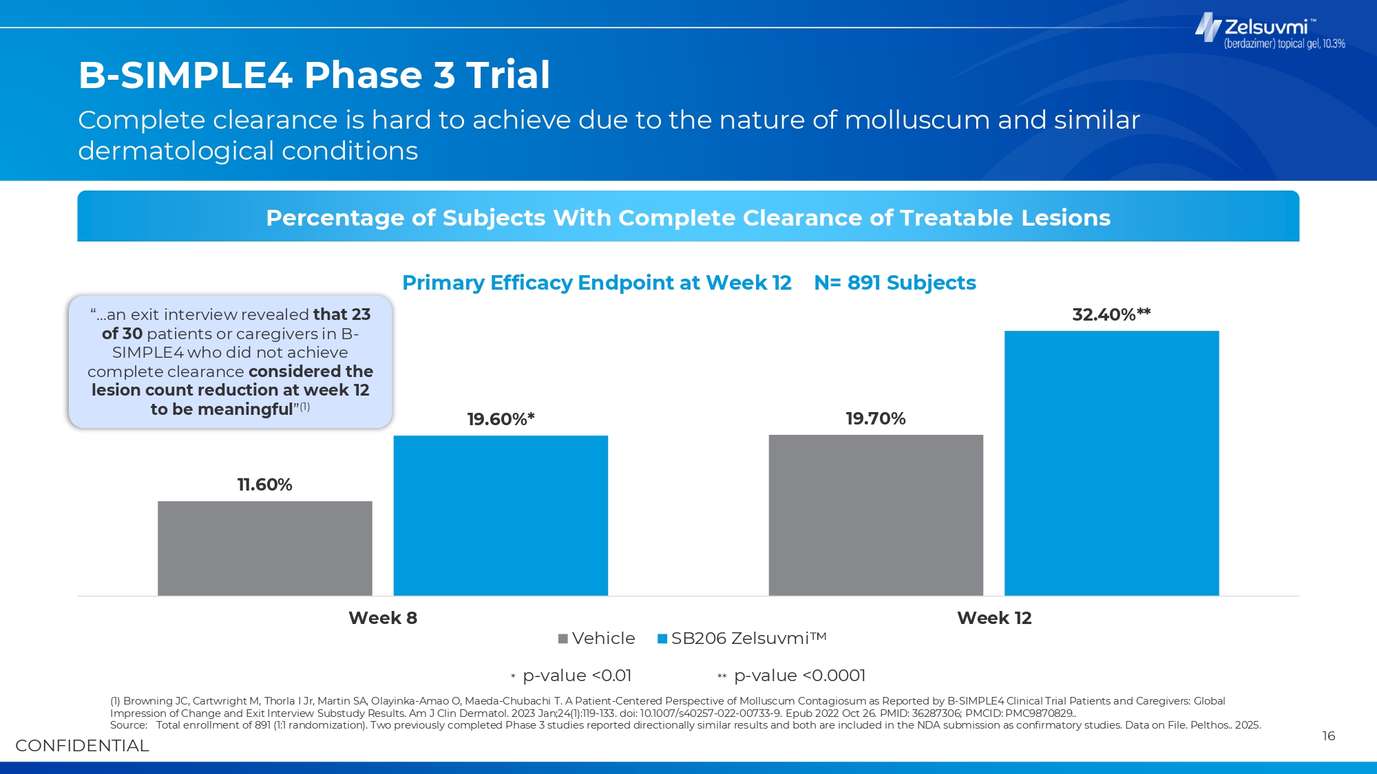 Phase 3 Trials Zelsuvmi showed statistically significant benefit vs. vehicle after 2 weeks of therapy and throughout the entire 12-week length of the Phase 3 studies Least Squares Mean Lesion Reduction(1) Baseline Week 2 Week 4 0.0% Week 8 Week 12 Baseline Week 2 Week 4 0.0% -1.1% -10.7% Median Lesion Reduction(2) Week 12 0.0% -9.5% -9.0% Week 8 -10.0% -28.6% -21.6% -27.8% -25.1% -42.6% -35.7% -59.4% -43.5% Zelsuvmi (n= 917) Vehicle (n= 681) Zelsuvmi (n= 917) Vehicle (n= 681) -58.1% -82.4% P<0.0001 at all time points, favoring ZelsuvmiTM 1) Figure 9: Browning JC, Hebert A, Enloe C, Cartwright M, Maeda-Chubachi T. Berdazimer Gel 10.3% is a Clinically Meaningful Therapeutic Intervention for Molluscum Contagiosum. Abstract and poster presented at Fall Clinical 2024. Las Vegas, NV. October 24-27, 2024. 2) Figure 10: Browning JC, Hebert A, Enloe C, Cartwright M, Maeda-Chubachi T. Berdazimer Gel 10.3% is a Clinically Meaningful Therapeutic Intervention for Molluscum Contagiosum. Abstract and poster presented at Fall Clinical 2024. Las Vegas, NV. October 24-27, 2024. CONFIDENTIAL 15