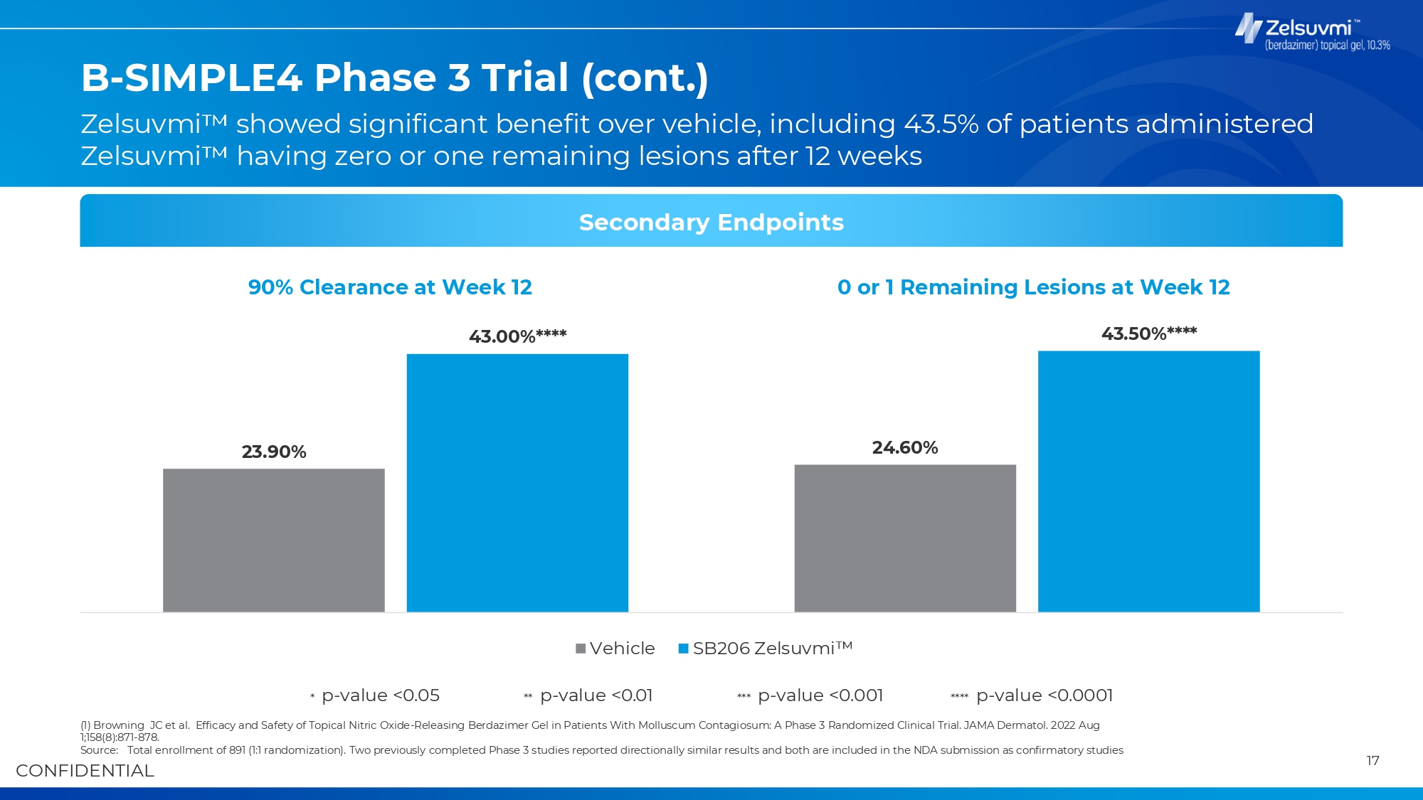 B-SIMPLE4 Phase 3 Trial Complete clearance is hard to achieve due to the nature of molluscum and similar dermatological conditions Percentage of Subjects With Complete Clearance of Treatable Lesions Primary Efficacy Endpoint at Week 12 “…an exit interview revealed that 23 of 30 patients or caregivers in BSIMPLE4 who did not achieve complete clearance considered the lesion count reduction at week 12 to be meaningful”(1) N= 891 Subjects 32.40%** 19.70% 19.60%* 11.60% Week 8 Vehicle * p-value <0.01 SB206 Zelsuvmi ** Week 12 p-value <0.0001 (1) Browning JC, Cartwright M, Thorla I Jr, Martin SA, Olayinka-Amao O, Maeda-Chubachi T. A Patient-Centered Perspective of Molluscum Contagiosum as Reported by B-SIMPLE4 Clinical Trial Patients and Caregivers: Global Impression of Change and Exit Interview Substudy Results. Am J Clin Dermatol. 2023 Jan;24(1):119-133. doi: 10.1007/s40257-022-00733-9. Epub 2022 Oct 26. PMID: 36287306; PMCID: PMC9870829.. Source: Total enrollment of 891 (1:1 randomization). Two previously completed Phase 3 studies reported directionally similar results and both are included in the NDA submission as confirmatory studies. Data on File. Pelthos.. 2025. CONFIDENTIAL 16