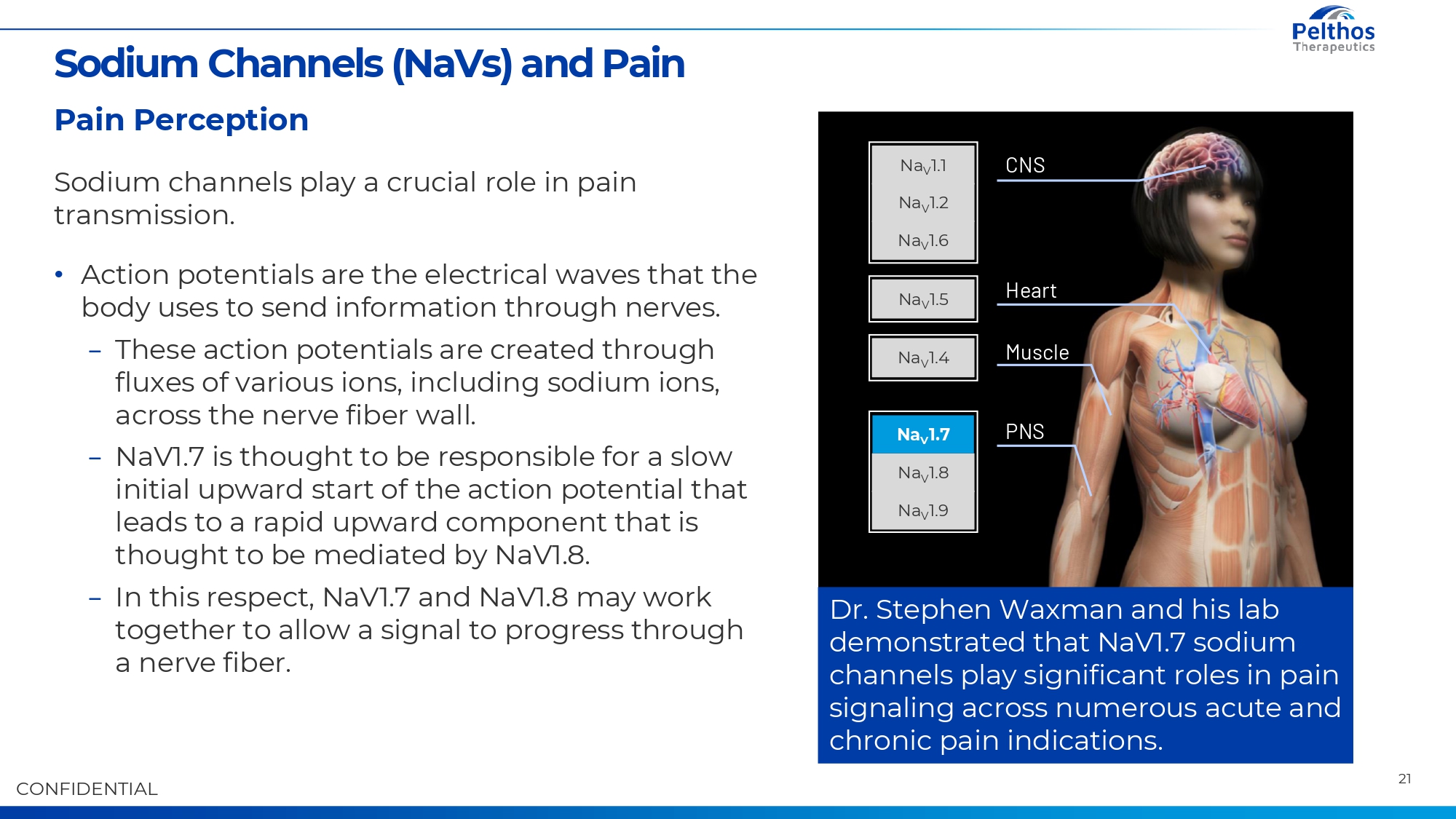 Sodium Channels (NaVs) and Pain Pain Perception Sodium channels play a crucial role in pain transmission. • Action potentials are the electrical waves that the body uses to send information through nerves. − These action potentials are created through fluxes of various ions, including sodium ions, across the nerve fiber wall. − NaV1.7 is thought to be responsible for a slow initial upward start of the action potential that leads to a rapid upward component that is thought to be mediated by NaV1.8. − In this respect, NaV1.7 and NaV1.8 may work together to allow a signal to progress through a nerve fiber. CONFIDENTIAL NaV1.1 CNS NaV1.2 NaV1.6 NaV1.5 Heart NaV1.4 Muscle NaV1.7 PNS NaV1.8 NaV1.9 Dr. Stephen Waxman and his lab demonstrated that NaV1.7 sodium channels play significant roles in pain signaling across numerous acute and chronic pain indications. 21
