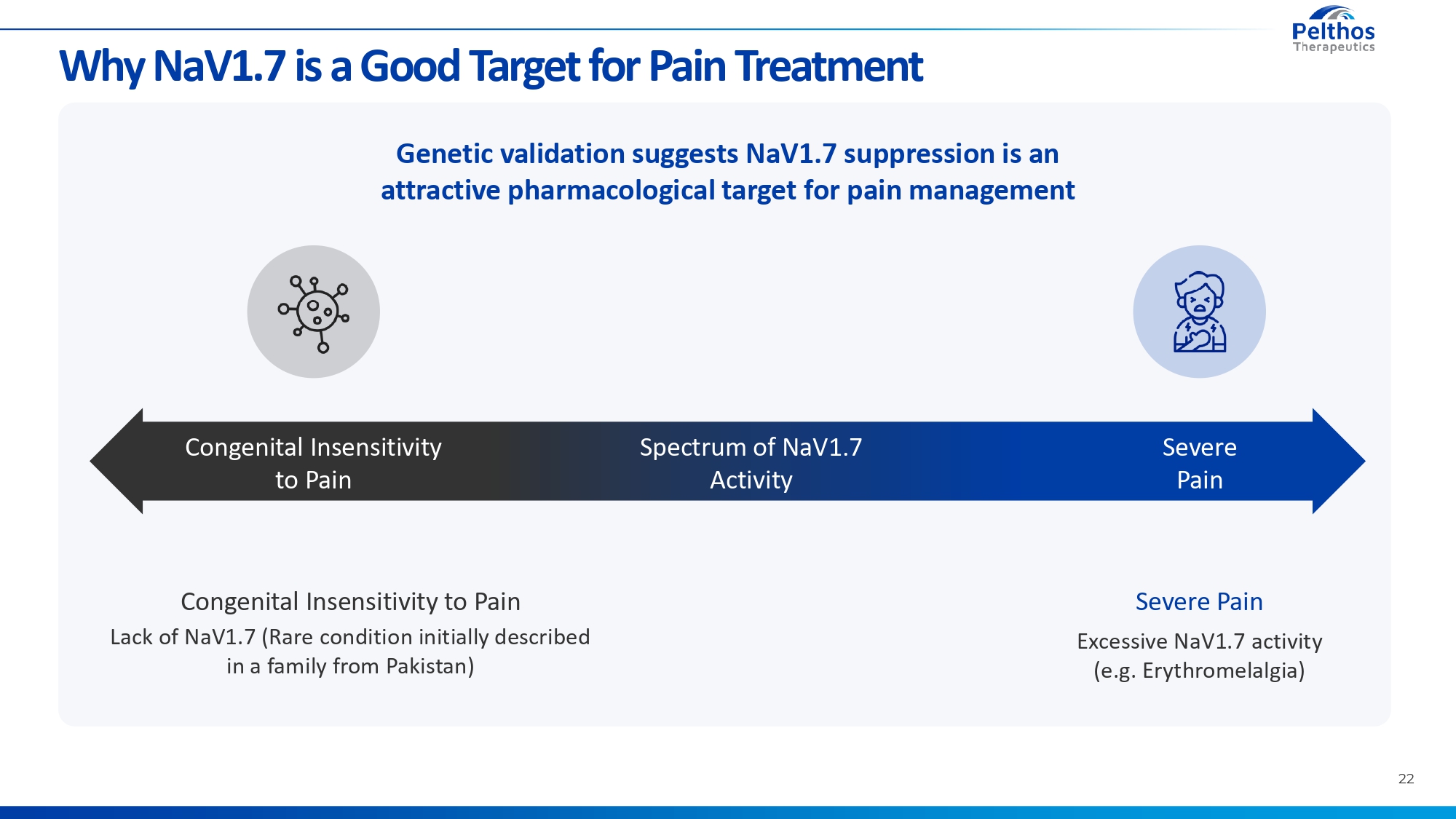Why NaV1.7 is a Good Target for Pain Treatment Genetic validation suggests NaV1.7 suppression is an attractive pharmacological target for pain management Congenital Insensitivity to Pain Spectrum of NaV1.7 Activity Severe Pain Congenital Insensitivity to Pain Severe Pain Lack of NaV1.7 (Rare condition initially described in a family from Pakistan) Excessive NaV1.7 activity (e.g. Erythromelalgia) 22