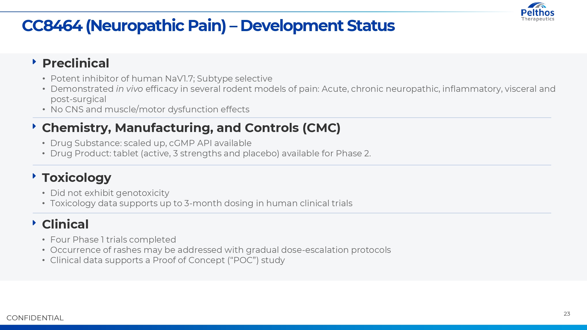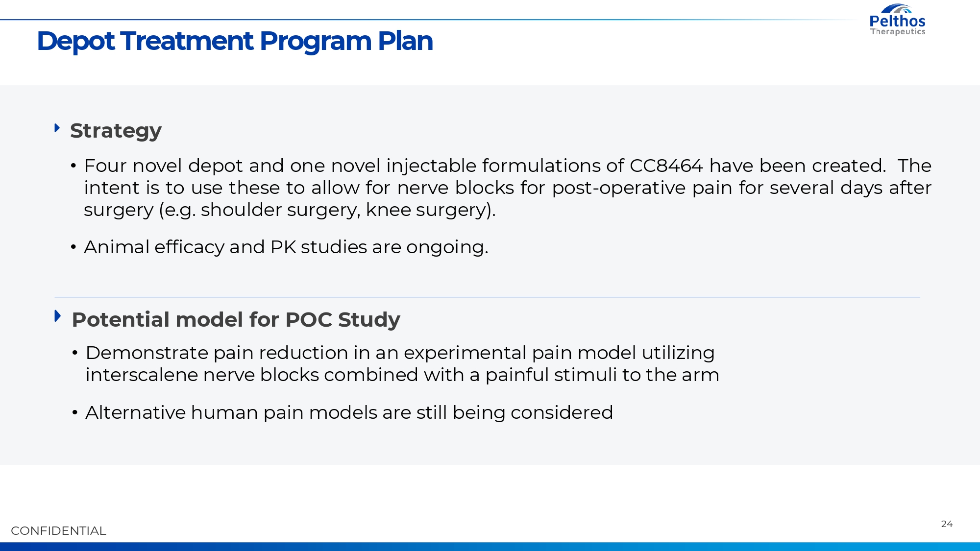 CC8464 (Neuropathic Pain) – Development Status Preclinical • Potent inhibitor of human NaV1.7; Subtype selective • Demonstrated in vivo efficacy in several rodent models of pain: Acute, chronic neuropathic, inflammatory, visceral and post-surgical • No CNS and muscle/motor dysfunction effects Chemistry, Manufacturing, and Controls (CMC) • Drug Substance: scaled up, cGMP API available • Drug Product: tablet (active, 3 strengths and placebo) available for Phase 2. Toxicology • Did not exhibit genotoxicity • Toxicology data supports up to 3-month dosing in human clinical trials Clinical • Four Phase 1 trials completed • Occurrence of rashes may be addressed with gradual dose-escalation protocols • Clinical data supports a Proof of Concept (“POC”) study CONFIDENTIAL 23