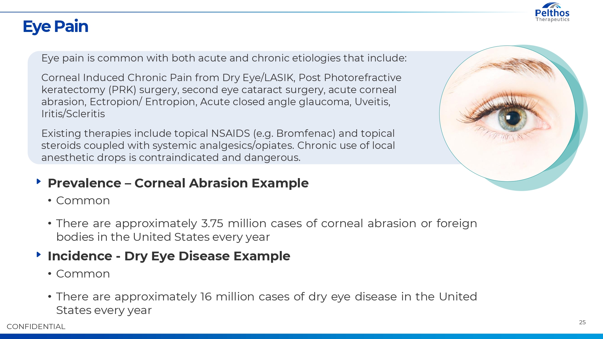 Eye Pain Eye pain is common with both acute and chronic etiologies that include: Corneal Induced Chronic Pain from Dry Eye/LASIK, Post Photorefractive keratectomy (PRK) surgery, second eye cataract surgery, acute corneal abrasion, Ectropion/ Entropion, Acute closed angle glaucoma, Uveitis, Iritis/Scleritis Existing therapies include topical NSAIDS (e.g. Bromfenac) and topical steroids coupled with systemic analgesics/opiates. Chronic use of local anesthetic drops is contraindicated and dangerous. Prevalence – Corneal Abrasion Example • Common • There are approximately 3.75 million cases of corneal abrasion or foreign bodies in the United States every year Incidence - Dry Eye Disease Example • Common • There are approximately 16 million cases of dry eye disease in the United States every year CONFIDENTIAL 25