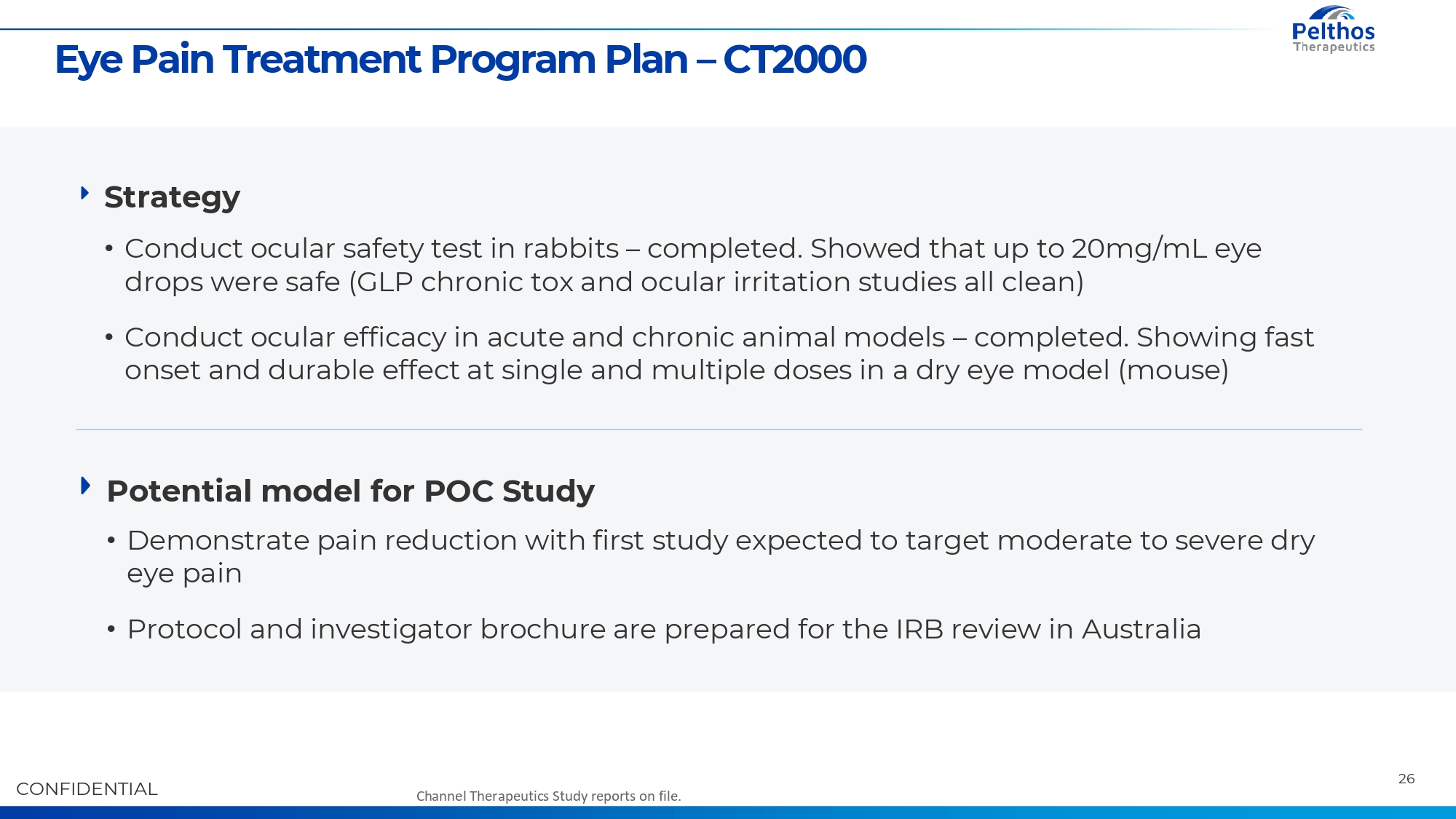 Eye Pain Treatment Program Plan – CT2000 Strategy • Conduct ocular safety test in rabbits – completed. Showed that up to 20mg/mL eye drops were safe (GLP chronic tox and ocular irritation studies all clean) • Conduct ocular efficacy in acute and chronic animal models – completed. Showing fast onset and durable effect at single and multiple doses in a dry eye model (mouse) Potential model for POC Study • Demonstrate pain reduction with first study expected to target moderate to severe dry eye pain • Protocol and investigator brochure are prepared for the IRB review in Australia CONFIDENTIAL 26 Channel Therapeutics Study reports on file.
