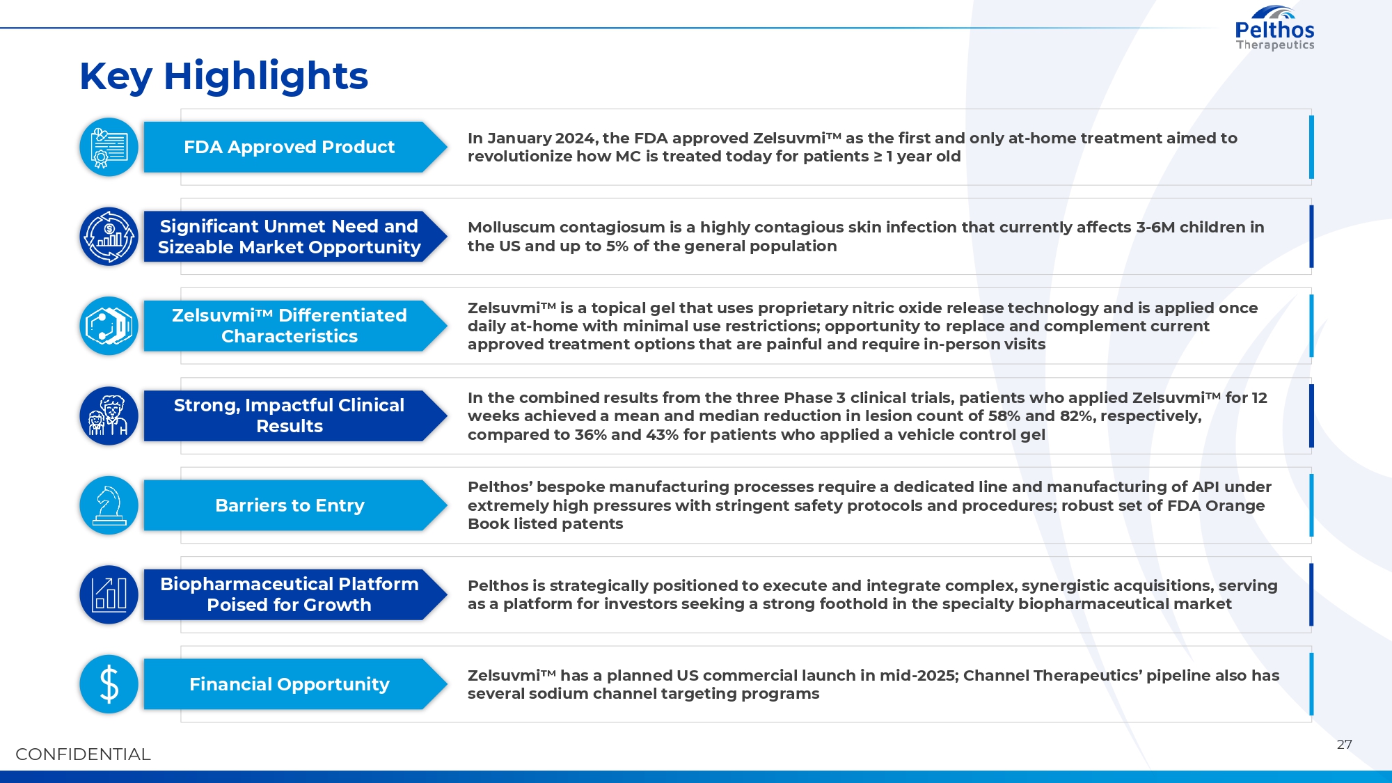 Key Highlights FDA Approved Product CONFIDENTIAL In January 2024, the FDA approved Zelsuvmi as the first and only at-home treatment aimed to revolutionize how MC is treated today for patients ≥ 1 year old Significant Unmet Need and Sizeable Market Opportunity Molluscum contagiosum is a highly contagious skin infection that currently affects 3-6M children in the US and up to 5% of the general population Zelsuvmi Differentiated Characteristics Zelsuvmi is a topical gel that uses proprietary nitric oxide release technology and is applied once daily at-home with minimal use restrictions; opportunity to replace and complement current approved treatment options that are painful and require in-person visits Strong, Impactful Clinical Results In the combined results from the three Phase 3 clinical trials, patients who applied Zelsuvmi weeks achieved a mean and median reduction in lesion count of 58% and 82%, respectively, compared to 36% and 43% for patients who applied a vehicle control gel for 12 Barriers to Entry Pelthos’ bespoke manufacturing processes require a dedicated line and manufacturing of API under extremely high pressures with stringent safety protocols and procedures; robust set of FDA Orange Book listed patents Biopharmaceutical Platform Poised for Growth Pelthos is strategically positioned to execute and integrate complex, synergistic acquisitions, serving as a platform for investors seeking a strong foothold in the specialty biopharmaceutical market Financial Opportunity Zelsuvmi has a planned US commercial launch in mid-2025; Channel Therapeutics’ pipeline also has several sodium channel targeting programs 27