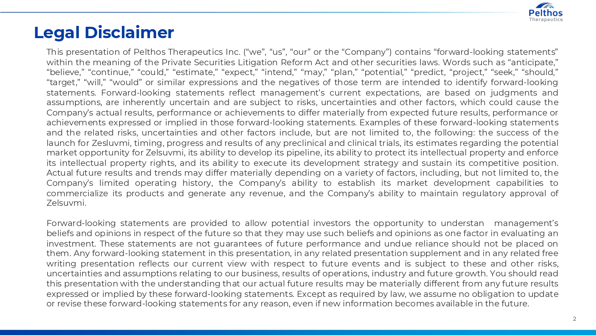 Legal Disclaimer This presentation of Pelthos Therapeutics Inc. (“we”, “us”, “our” or the “Company”) contains “forward-looking statements” within the meaning of the Private Securities Litigation Reform Act and other securities laws. Words such as “anticipate,” “believe,” “continue,” “could,” “estimate,” “expect,” “intend,” “may,” “plan,” “potential,” “predict, “project,” “seek,” “should,” “target,” “will,” “would” or similar expressions and the negatives of those term are intended to identify forward-looking statements. Forward-looking statements reflect management’s current expectations, are based on judgments and assumptions, are inherently uncertain and are subject to risks, uncertainties and other factors, which could cause the Company’s actual results, performance or achievements to differ materially from expected future results, performance or achievements expressed or implied in those forward-looking statements. Examples of these forward-looking statements and the related risks, uncertainties and other factors include, but are not limited to, the following: the success of the launch for Zesluvmi, timing, progress and results of any preclinical and clinical trials, its estimates regarding the potential market opportunity for Zelsuvmi, its ability to develop its pipeline, its ability to protect its intellectual property and enforce its intellectual property rights, and its ability to execute its development strategy and sustain its competitive position. Actual future results and trends may differ materially depending on a variety of factors, including, but not limited to, the Company’s limited operating history, the Company’s ability to establish its market development capabilities to commercialize its products and generate any revenue, and the Company’s ability to maintain regulatory approval of Zelsuvmi. Forward-looking statements are provided to allow potential investors the opportunity to understand management’s beliefs and opinions in respect of the future so that they may use such beliefs and opinions as one factor in evaluating an investment. These statements are not guarantees of future performance and undue reliance should not be placed on them. Any forward-looking statement in this presentation, in any related presentation supplement and in any related free writing presentation reflects our current view with respect to future events and is subject to these and other risks, uncertainties and assumptions relating to our business, results of operations, industry and future growth. You should read this presentation with the understanding that our actual future results may be materially different from any future results expressed or implied by these forward-looking statements. Except as required by law, we assume no obligation to update or revise these forward-looking statements for any reason, even if new information becomes available in the future. 2